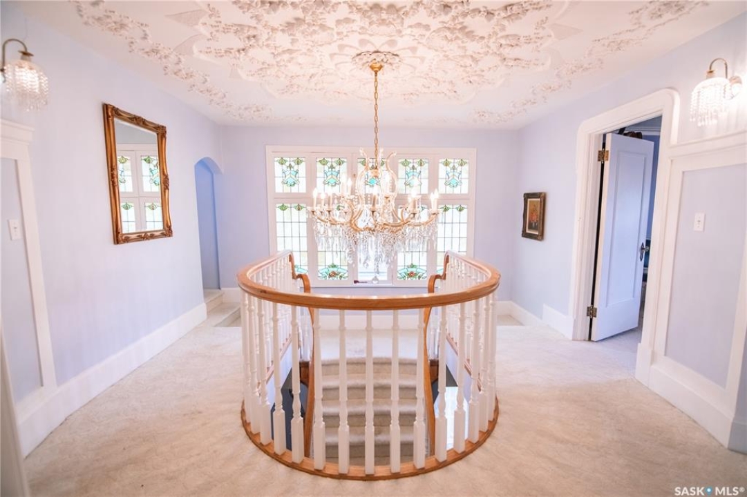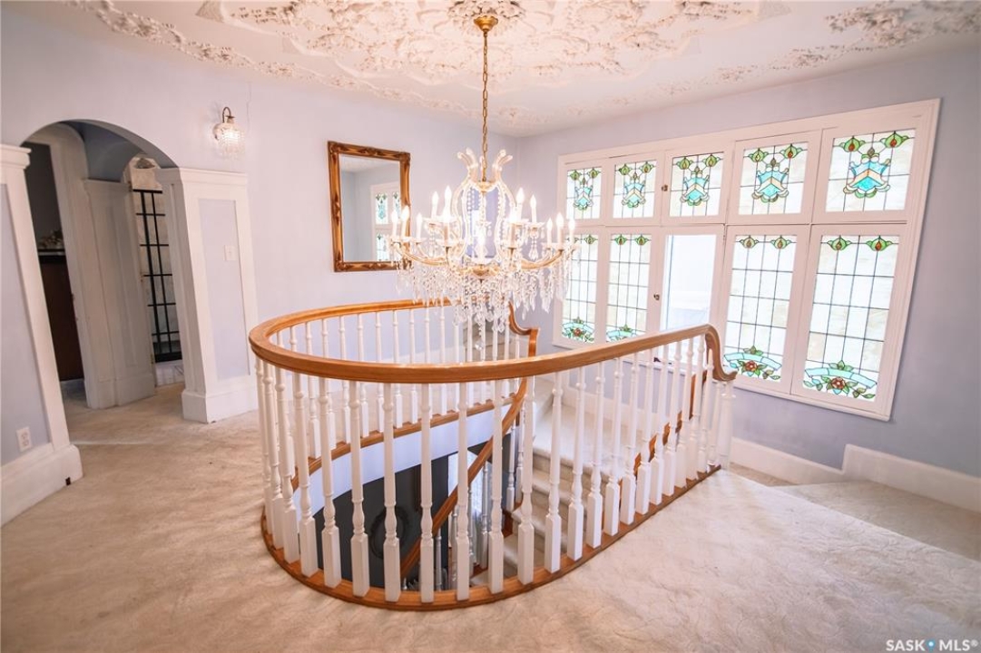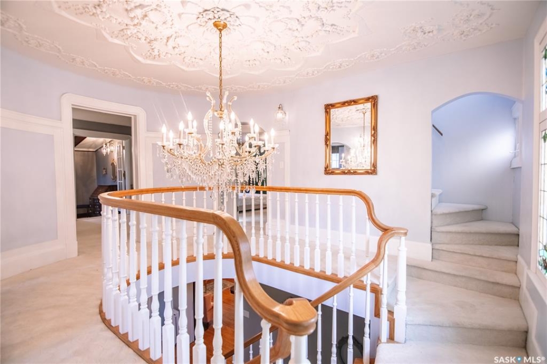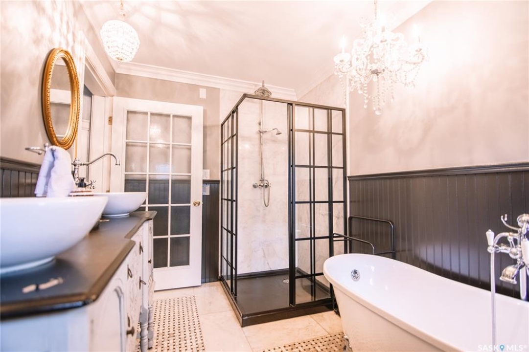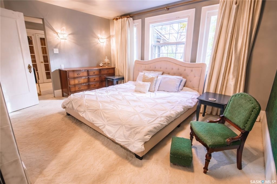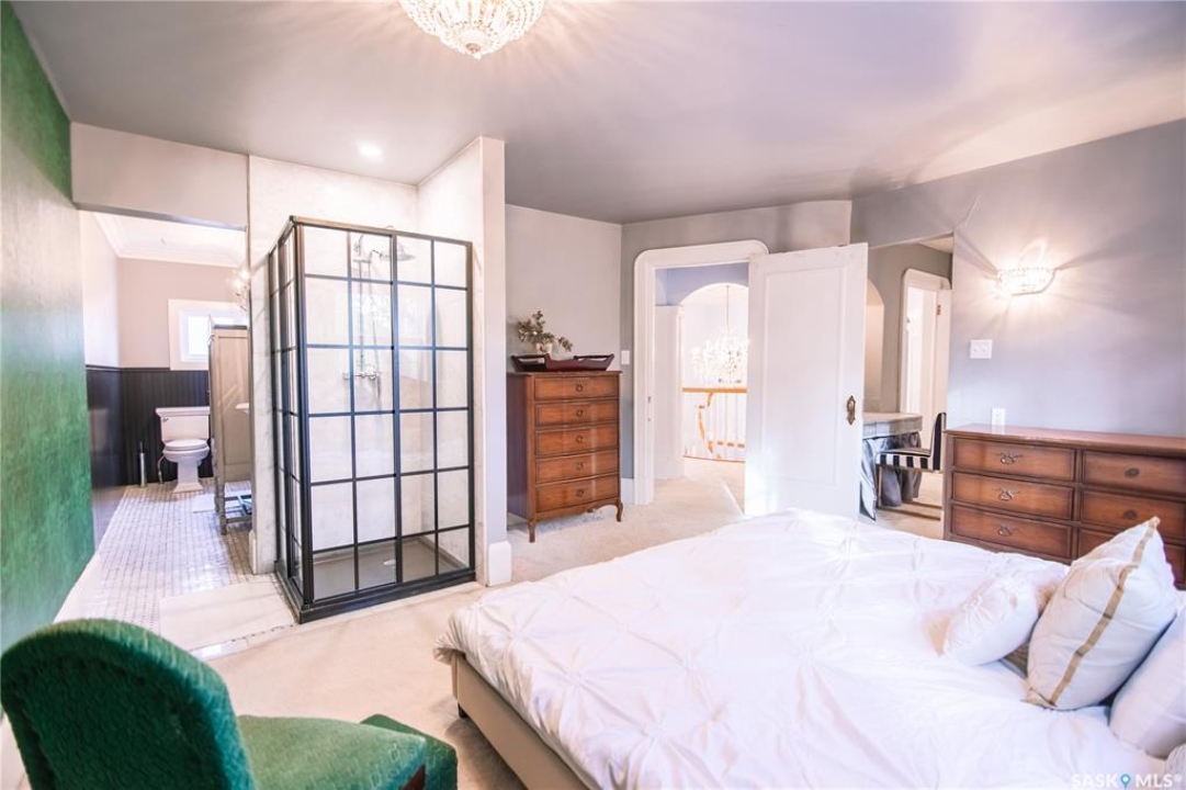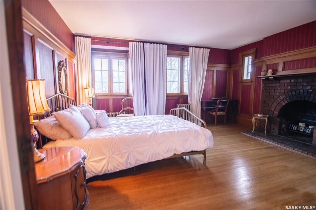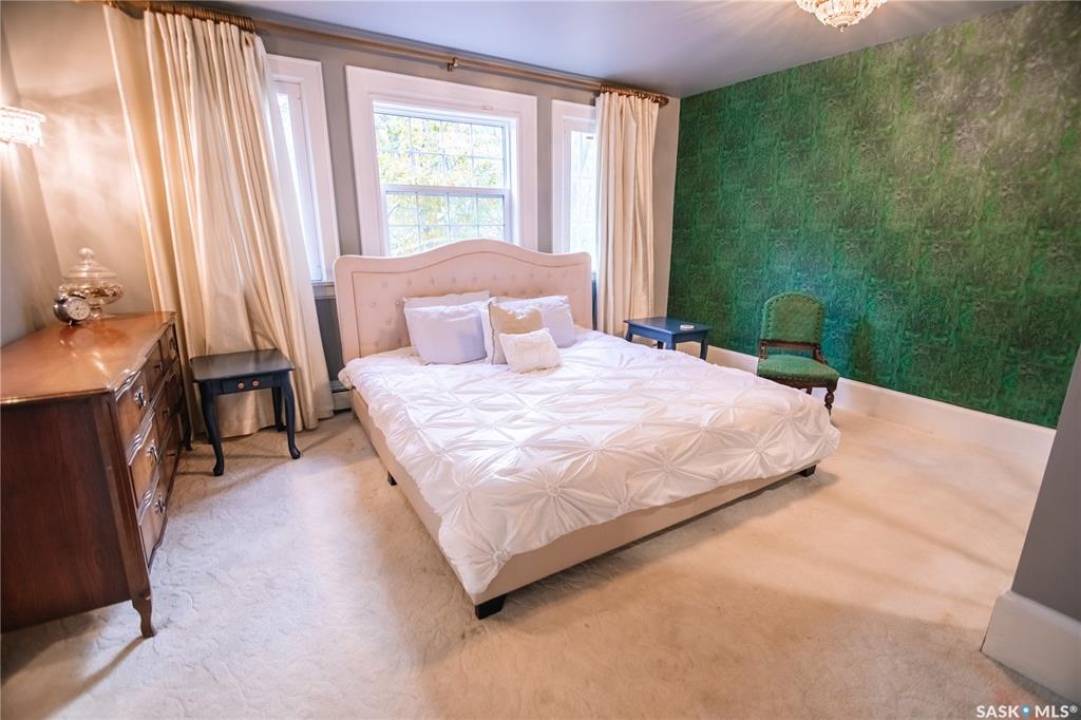 This remarkable 6-bedroom, 5-bathroom character home offers 3,795 sq. ft. of elegant living space, blending preserved 1913 architectural detail with extensive modern upgrades. Designed by renowned architect James Puntin for prominent Regina figure William Mason—eight-term city councillor and mayor from 1925–1926—this property stands as a true piece of Regina's history. The double attached insulated garage offers rare dual access from both Albert Street and the back alley. Classic features such as stained glass windows, wainscoting, crown moldings, claw-foot tubs, and antique vanities are paired with high-end updates including marble flooring, new lighting, custom wallpaper, window treatments, smart home technology (August lock, smart video doorbell, Ecobee thermostat), and an upgraded 200 amp electrical panel. A large heated porch leads to an impressive reception hall with a stunning open staircase and ceiling feature. The main floor includes a spacious living room, formal dining room, an upgraded white kitchen with included appliances, a 2-pc powder room, and a 2023-renovated laundry room with washer and dryer included. The second level features three generous bedrooms, including a primary suite with a sitting room, sunroom, walk-in closet, and a newly developed 4-pc ensuite. The third floor offers two bedrooms, a 3-pc bath, a living room, and a kitchenette—all furniture and accessories included. The fully developed basement contains a large one-bedroom non-regulation suite with its own kitchen and 3-pc bath (furniture included), ideal for extra income, multigenerational living, or a nanny suite. Additional updates include a new boiler (2014) and spray foam insulation in key areas. Furniture on the main and second floors is negotiable, making this home truly move-in ready. A rare combination of history, character, and modern comfort, this property is one of Regina's finest and most storied residences.