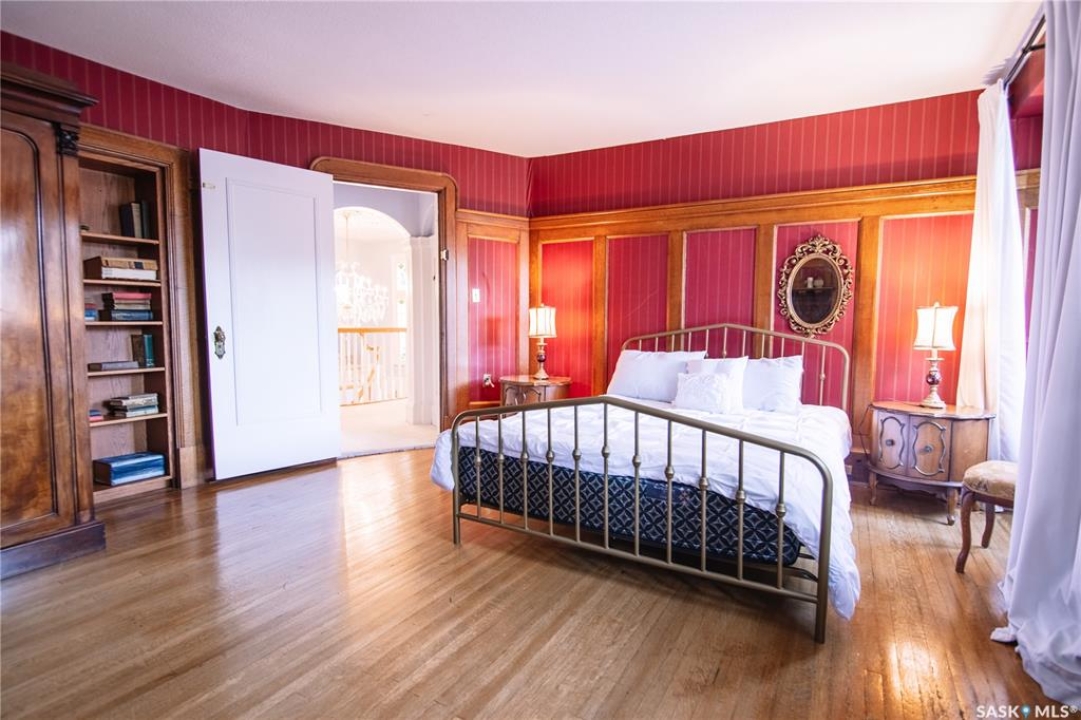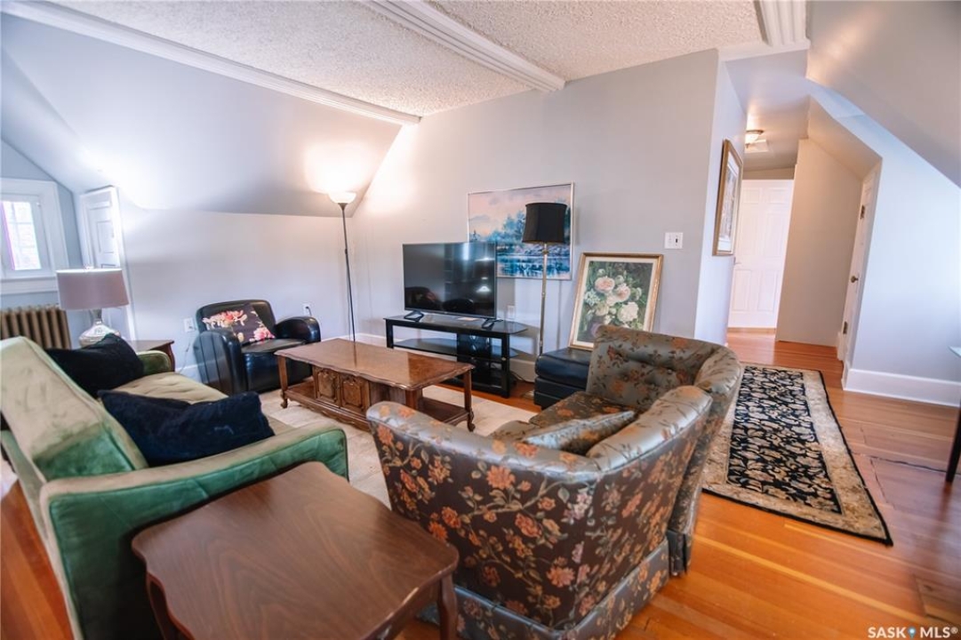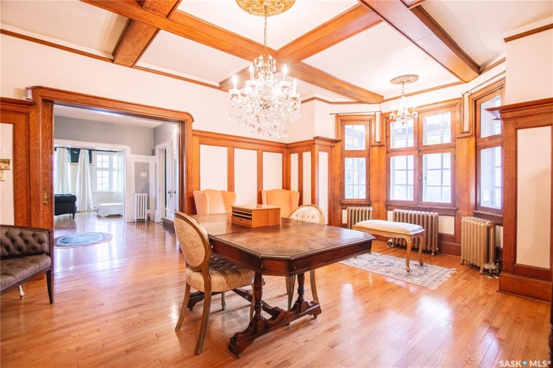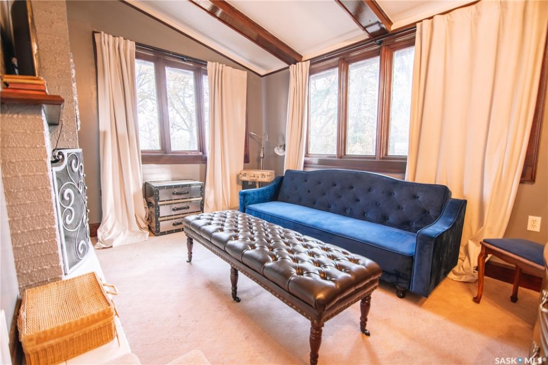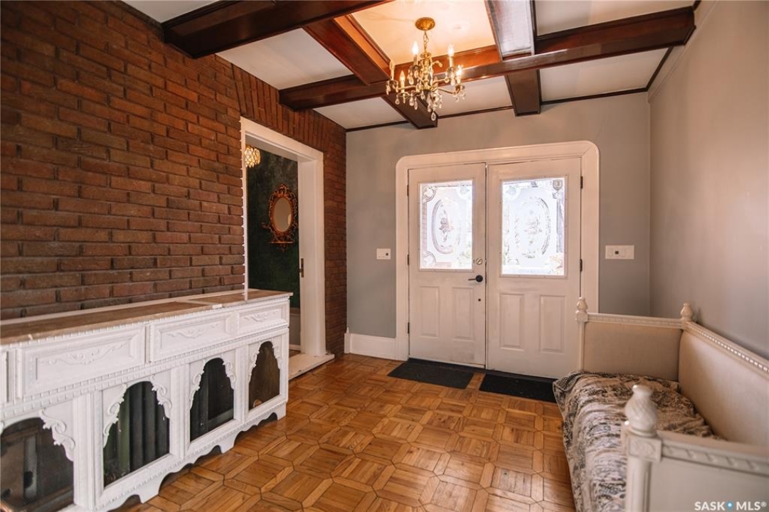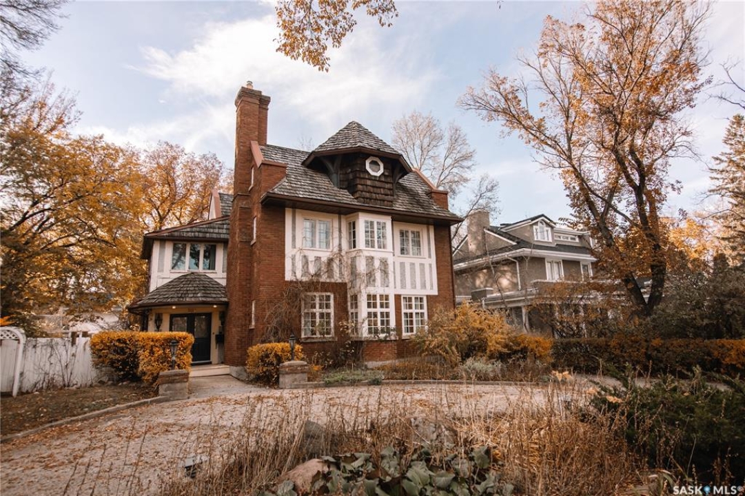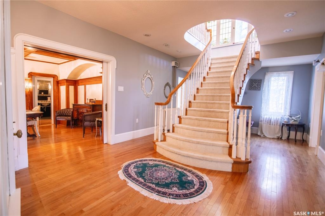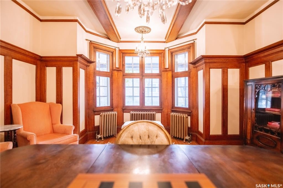 This remarkable 6-bedroom, 5-bathroom character home offers 3,795 sq. ft. of elegant living space, blending preserved 1913 architectural detail with extensive modern upgrades. Designed by renowned architect James Puntin for prominent Regina figure William Mason—eight-term city councillor and mayor from 1925–1926—this property stands as a true piece of Regina's history. The double attached insulated garage offers rare dual access from both Albert Street and the back alley. Classic features such as stained glass windows, wainscoting, crown moldings, claw-foot tubs, and antique vanities are paired with high-end updates including marble flooring, new lighting, custom wallpaper, window treatments, smart home technology (August lock, smart video doorbell, Ecobee thermostat), and an upgraded 200 amp electrical panel. A large heated porch leads to an impressive reception hall with a stunning open staircase and ceiling feature. The main floor includes a spacious living room, formal dining room, an upgraded white kitchen with included appliances, a 2-pc powder room, and a 2023-renovated laundry room with washer and dryer included. The second level features three generous bedrooms, including a primary suite with a sitting room, sunroom, walk-in closet, and a newly developed 4-pc ensuite. The third floor offers two bedrooms, a 3-pc bath, a living room, and a kitchenette—all furniture and accessories included. The fully developed basement contains a large one-bedroom non-regulation suite with its own kitchen and 3-pc bath (furniture included), ideal for extra income, multigenerational living, or a nanny suite. Additional updates include a new boiler (2014) and spray foam insulation in key areas. Furniture on the main and second floors is negotiable, making this home truly move-in ready. A rare combination of history, character, and modern comfort, this property is one of Regina's finest and most storied residences.