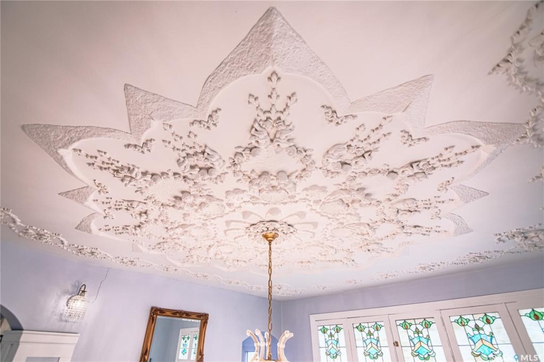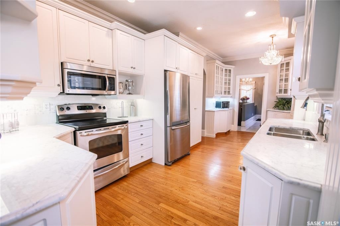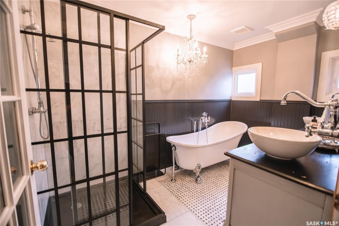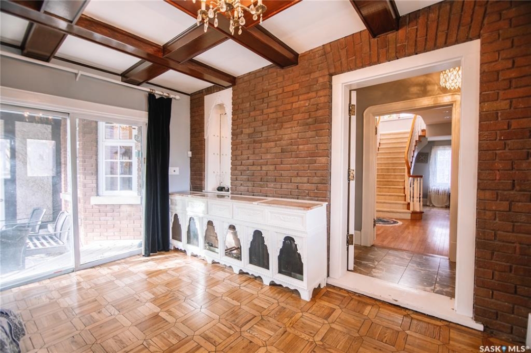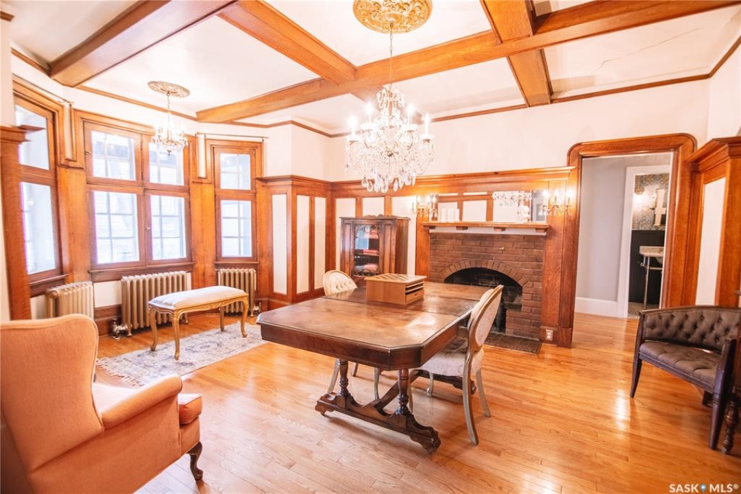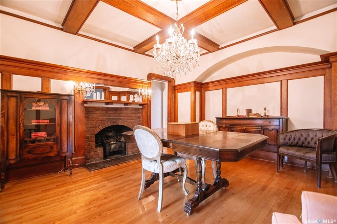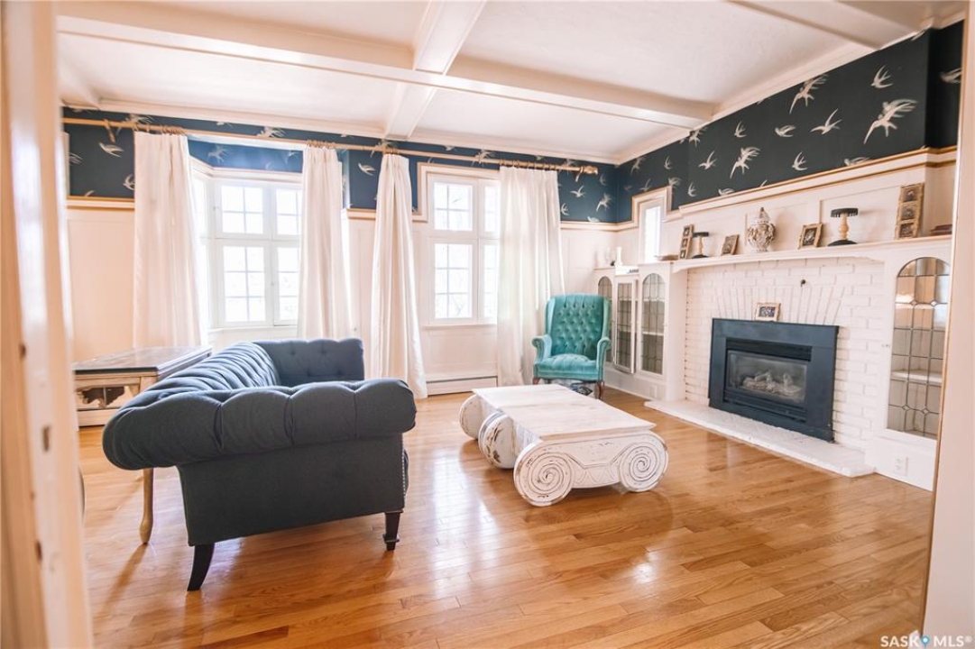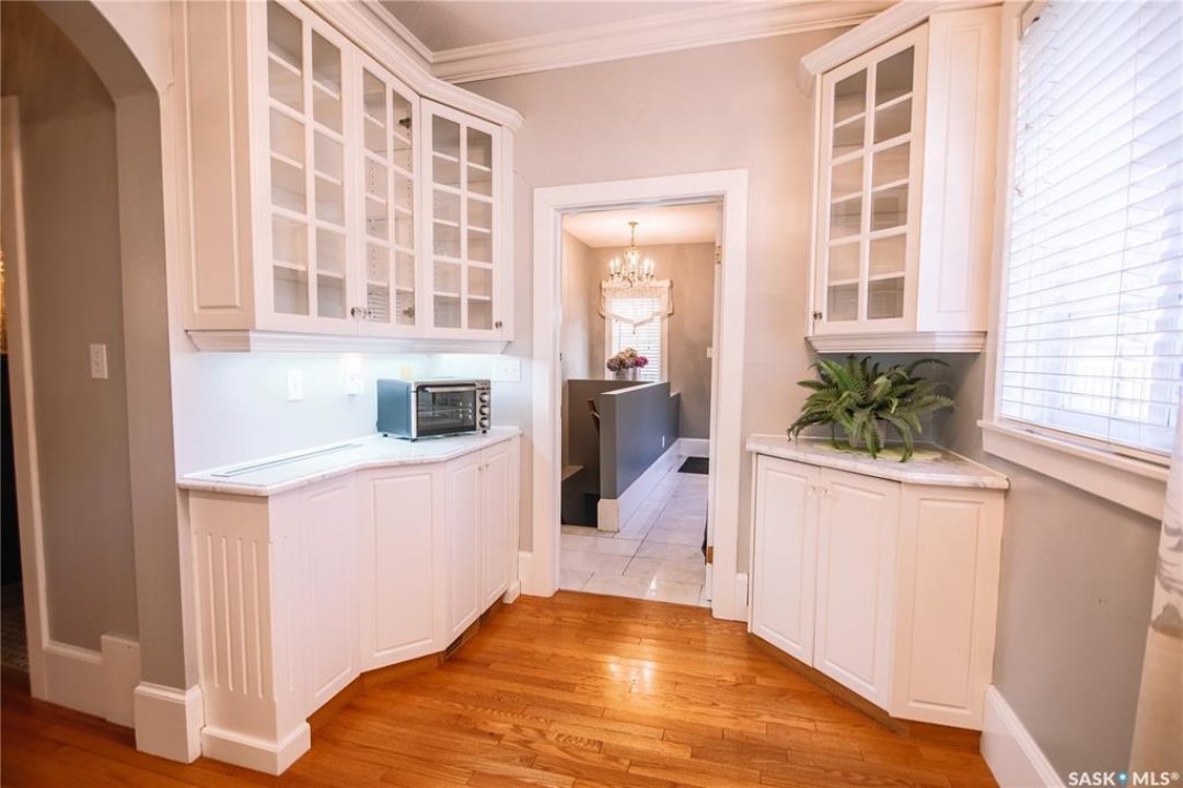 This remarkable 6-bedroom, 5-bathroom character home offers 3,795 sq. ft. of elegant living space, blending preserved 1913 architectural detail with extensive modern upgrades. Designed by renowned architect James Puntin for prominent Regina figure William Mason—eight-term city councillor and mayor from 1925–1926—this property stands as a true piece of Regina's history. The double attached insulated garage offers rare dual access from both Albert Street and the back alley. Classic features such as stained glass windows, wainscoting, crown moldings, claw-foot tubs, and antique vanities are paired with high-end updates including marble flooring, new lighting, custom wallpaper, window treatments, smart home technology (August lock, smart video doorbell, Ecobee thermostat), and an upgraded 200 amp electrical panel. A large heated porch leads to an impressive reception hall with a stunning open staircase and ceiling feature. The main floor includes a spacious living room, formal dining room, an upgraded white kitchen with included appliances, a 2-pc powder room, and a 2023-renovated laundry room with washer and dryer included. The second level features three generous bedrooms, including a primary suite with a sitting room, sunroom, walk-in closet, and a newly developed 4-pc ensuite. The third floor offers two bedrooms, a 3-pc bath, a living room, and a kitchenette—all furniture and accessories included. The fully developed basement contains a large one-bedroom non-regulation suite with its own kitchen and 3-pc bath (furniture included), ideal for extra income, multigenerational living, or a nanny suite. Additional updates include a new boiler (2014) and spray foam insulation in key areas. Furniture on the main and second floors is negotiable, making this home truly move-in ready. A rare combination of history, character, and modern comfort, this property is one of Regina's finest and most storied residences.