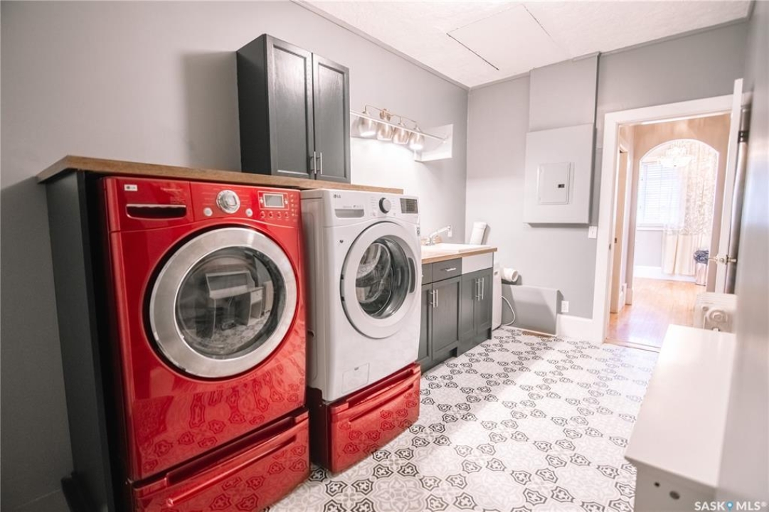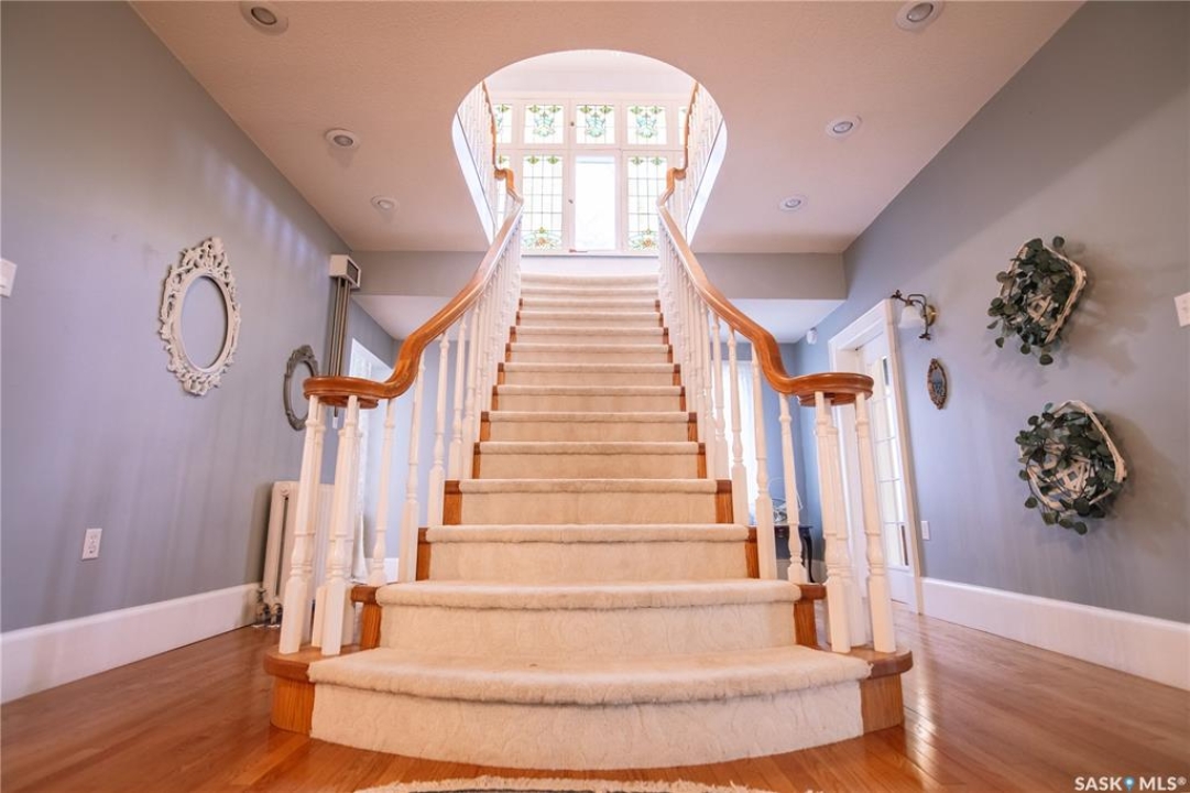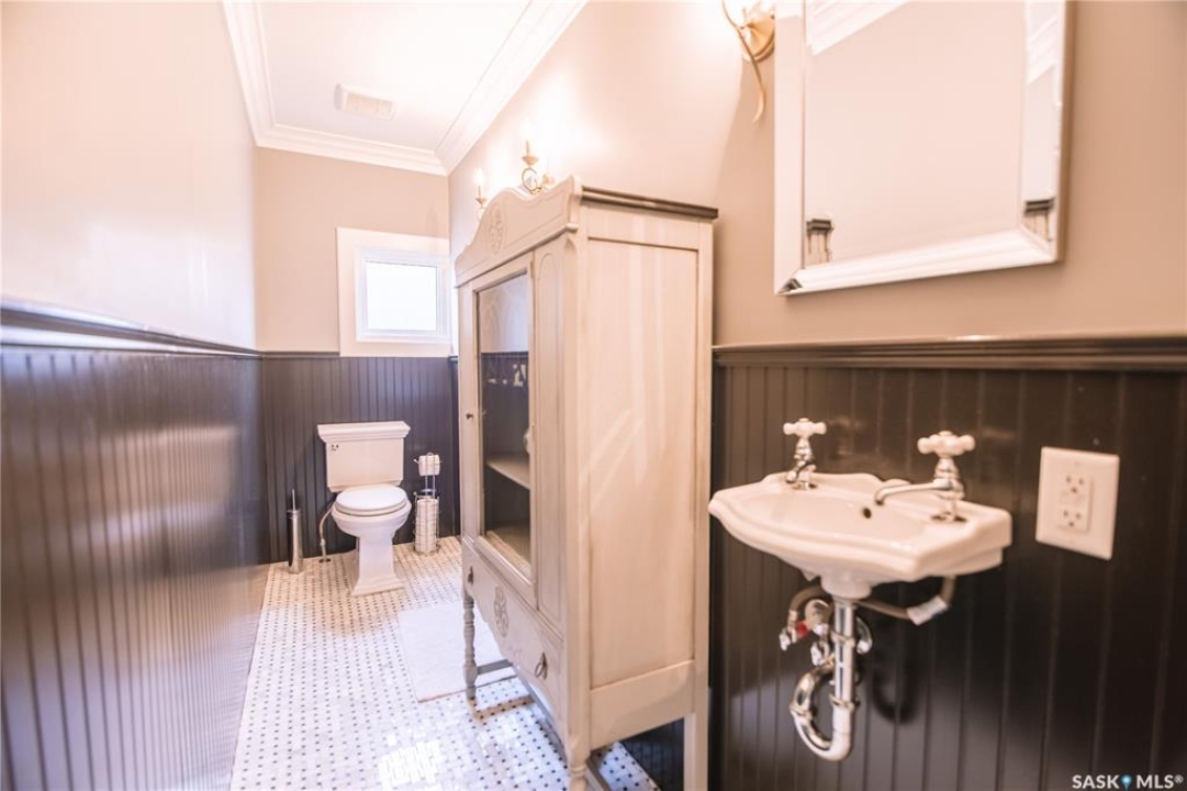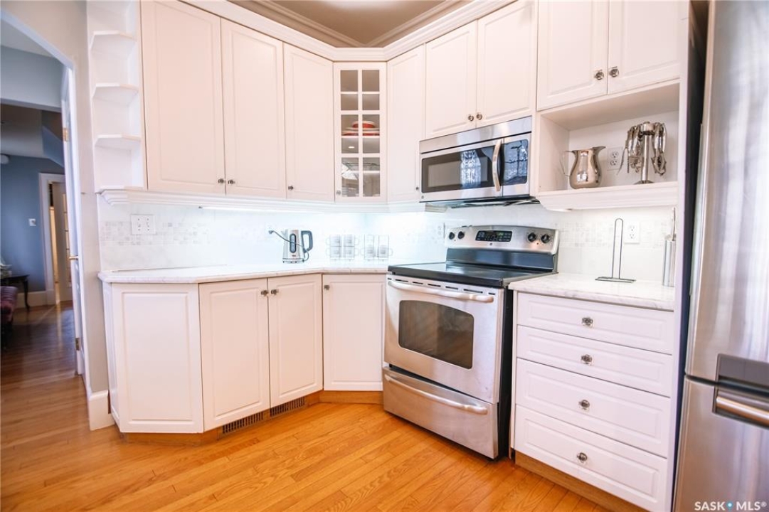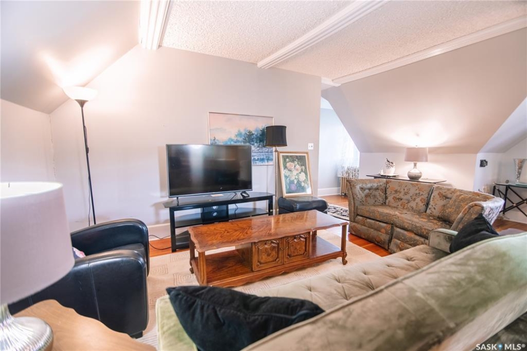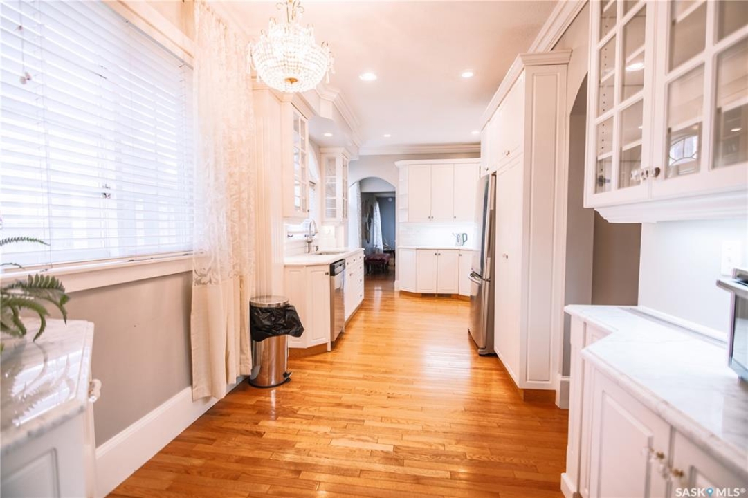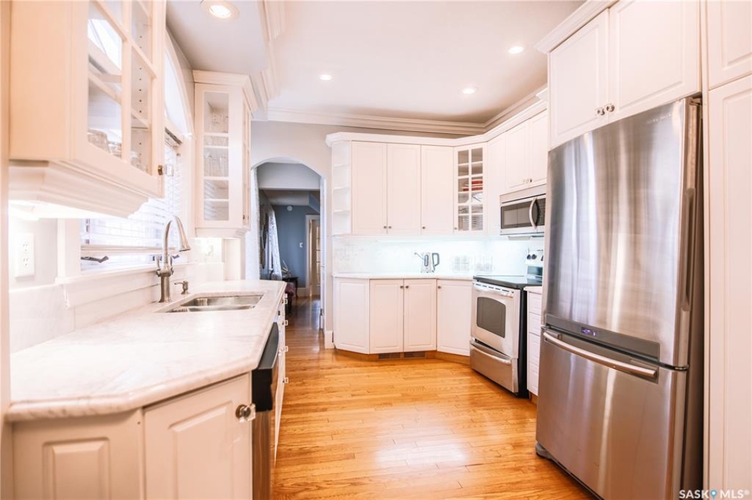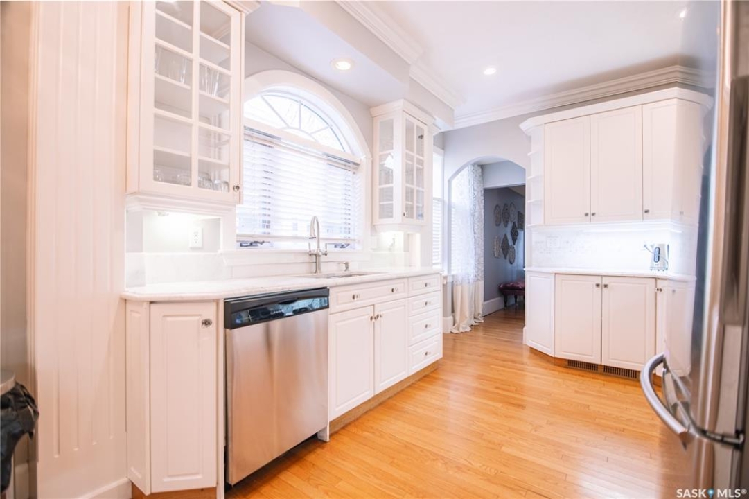 This remarkable 6-bedroom, 5-bathroom character home offers 3,795 sq. ft. of elegant living space, blending preserved 1913 architectural detail with extensive modern upgrades. Designed by renowned architect James Puntin for prominent Regina figure William Mason—eight-term city councillor and mayor from 1925–1926—this property stands as a true piece of Regina's history. The double attached insulated garage offers rare dual access from both Albert Street and the back alley. Classic features such as stained glass windows, wainscoting, crown moldings, claw-foot tubs, and antique vanities are paired with high-end updates including marble flooring, new lighting, custom wallpaper, window treatments, smart home technology (August lock, smart video doorbell, Ecobee thermostat), and an upgraded 200 amp electrical panel. A large heated porch leads to an impressive reception hall with a stunning open staircase and ceiling feature. The main floor includes a spacious living room, formal dining room, an upgraded white kitchen with included appliances, a 2-pc powder room, and a 2023-renovated laundry room with washer and dryer included. The second level features three generous bedrooms, including a primary suite with a sitting room, sunroom, walk-in closet, and a newly developed 4-pc ensuite. The third floor offers two bedrooms, a 3-pc bath, a living room, and a kitchenette—all furniture and accessories included. The fully developed basement contains a large one-bedroom non-regulation suite with its own kitchen and 3-pc bath (furniture included), ideal for extra income, multigenerational living, or a nanny suite. Additional updates include a new boiler (2014) and spray foam insulation in key areas. Furniture on the main and second floors is negotiable, making this home truly move-in ready. A rare combination of history, character, and modern comfort, this property is one of Regina's finest and most storied residences.