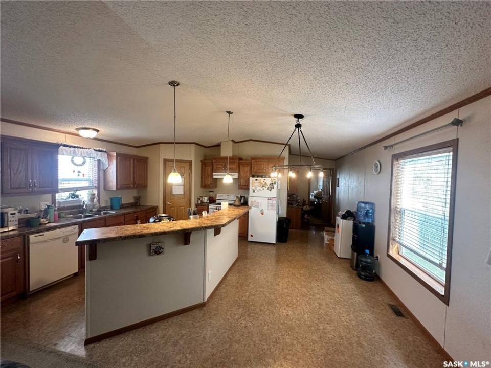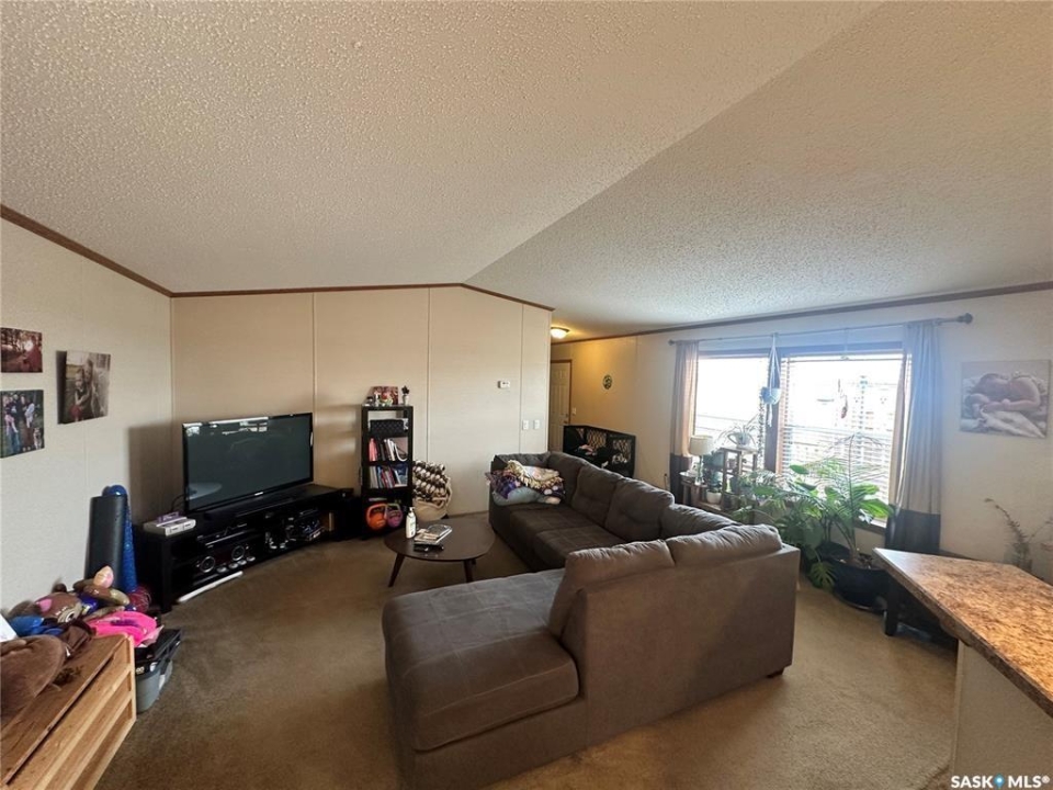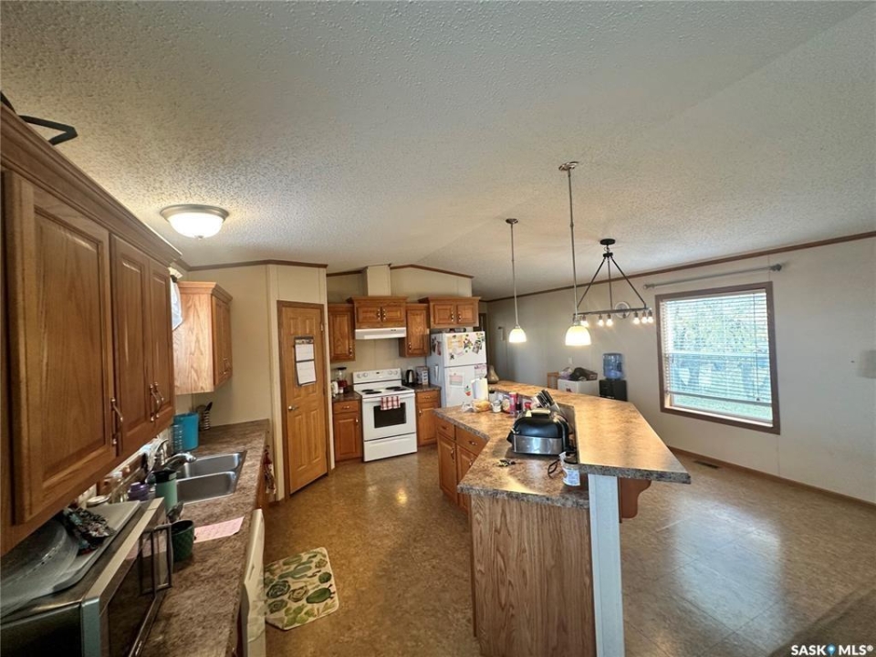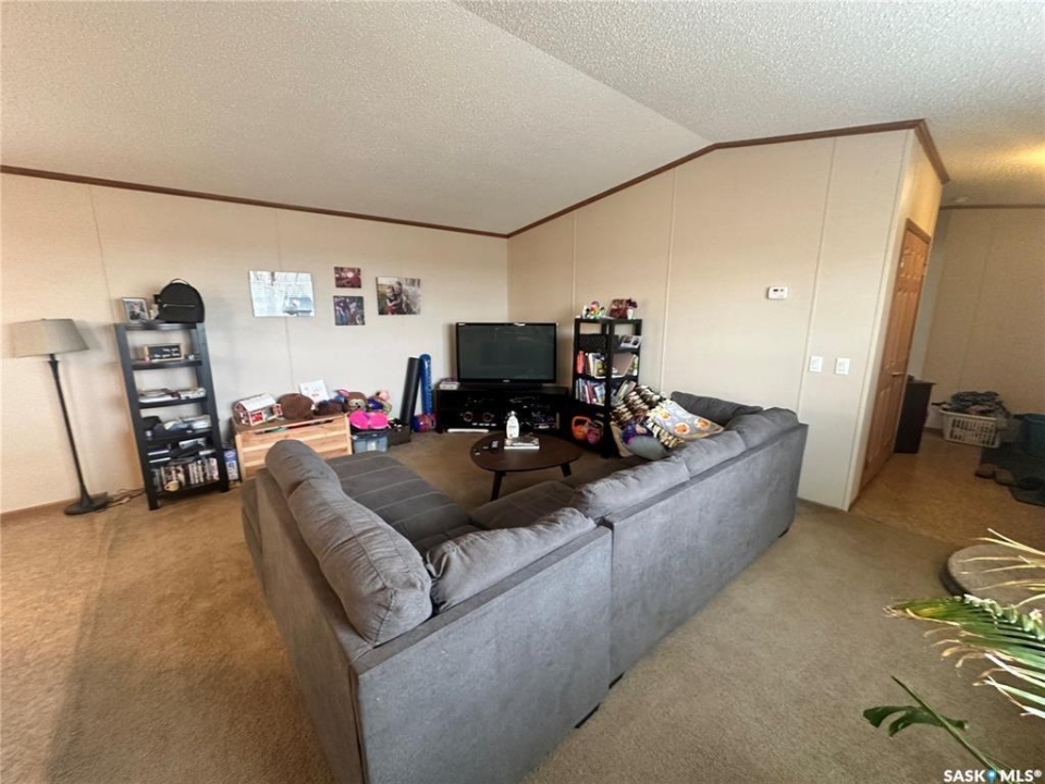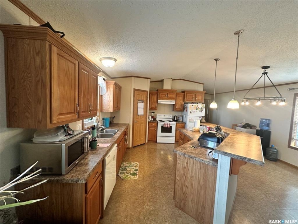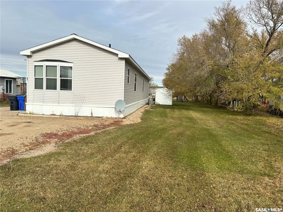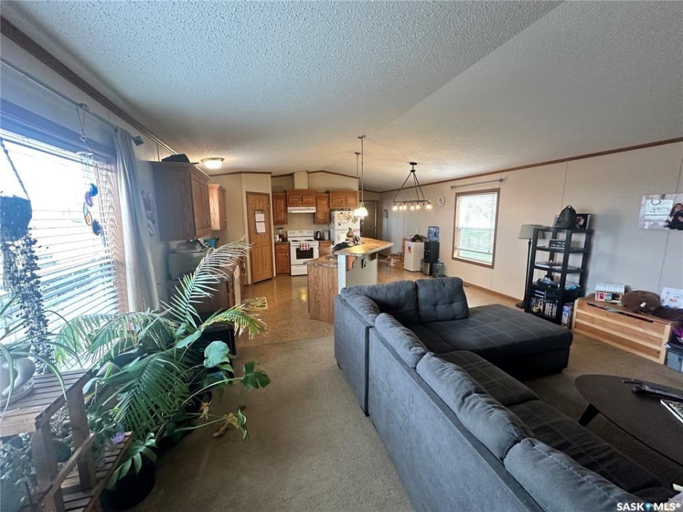 Welcome to your move-in ready retreat! Built in 2011, this beautifully maintained double-wide home offers effortless open-concept living, modern touches and generous outdoor space with a perfect blend of convenience and comfort. Step into a bright, open living area where the kitchen, dining and living room flow seamlessly together which is ideal for entertaining or family time. The gourmet-style kitchen features a large island with built-in seating, providing both workspace and casual dining. The vaulted ceilings enhance the sense of space and add a light, airy ambience throughout the main living zone. There are three spacious bedrooms. The primary suite is a true retreat: it includes a walk-in closet and an ensuite four-piece bathroom complete with a jetted tub, perfect for relaxing at day's end. The second full bathroom serves the household and guests with convenience and style. This property is nestled on an oversized lot, which gives you all the room you've been looking for an expansive yard space, plenty of parking and outdoor opportunity. The shed provides functional storage for garden tools, recreational gear or workshop space. Enjoy the outdoors on the deck — whether you're sipping morning coffee or hosting summer barbecues, it's the perfect spot to unwind. This property has ample driveway and parking area, there's no shortage of space for vehicles, toys, or guests!