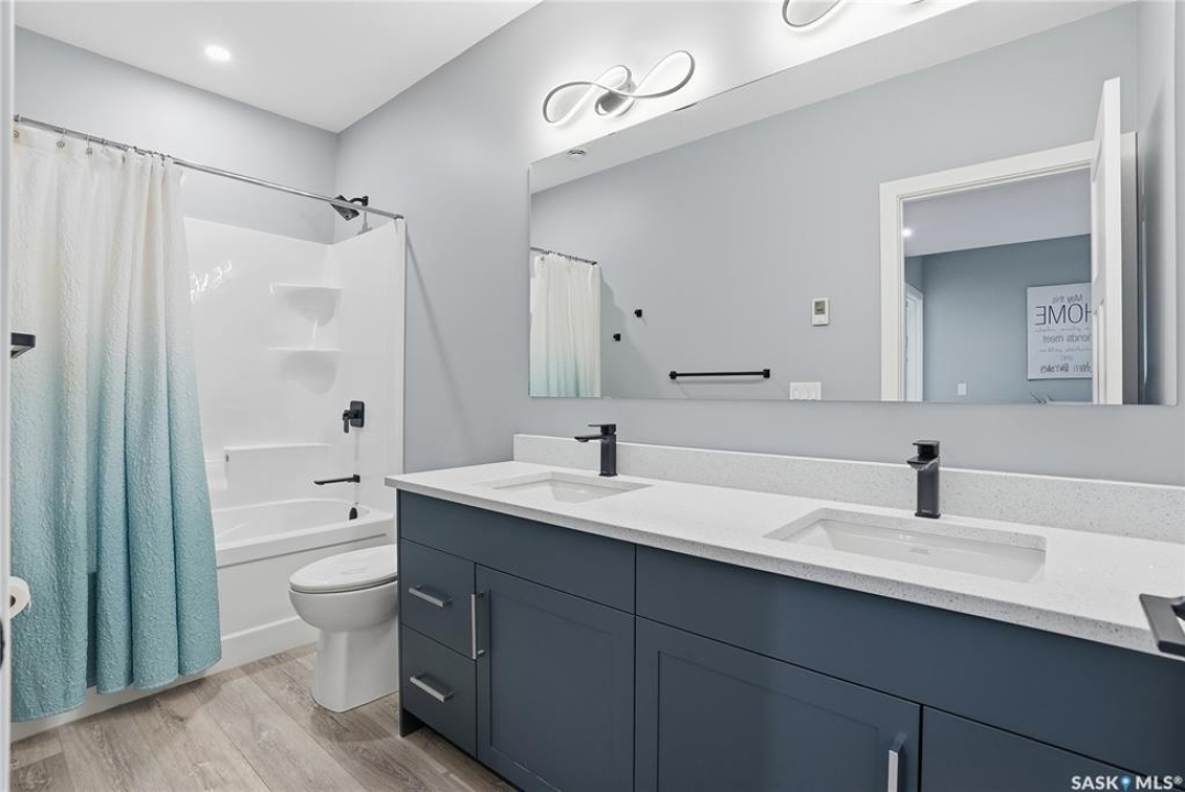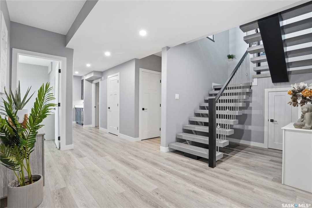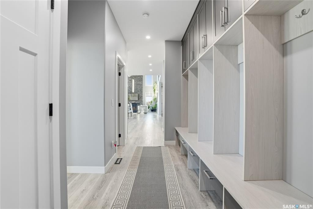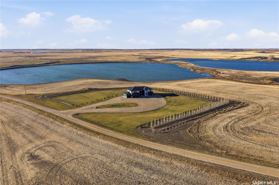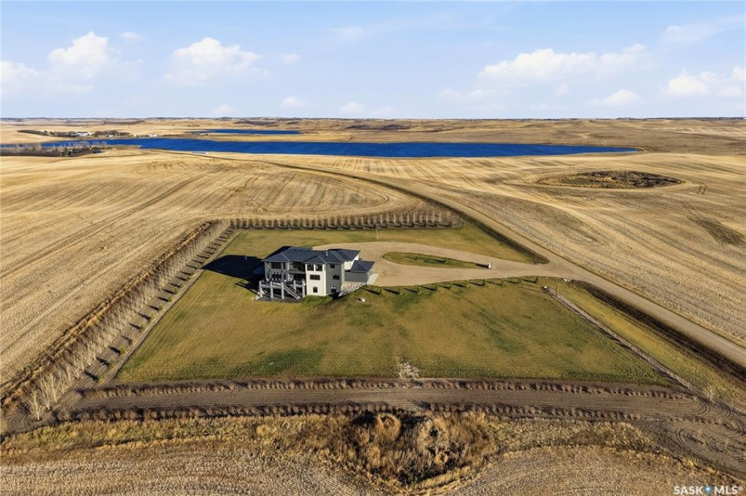 Located 30 minutes east of Saskatoon, this exceptional 2021 custom-built two-storey home spans over 3,700 sq. ft. above grade with a fully finished walkout basement, perfectly positioned to capture sweeping views of rolling hills and endless sunsets. The main floor's open-concept design showcases a chef-inspired kitchen, elegant dining area, and a grand great room with a striking gas fireplace framed by expansive windows. A spacious mudroom seamlessly connects to the heated 3-car garage, complemented by an additional single garage. The main level also features a private office, laundry, and powder room. Upstairs, discover an impressive bonus room and a luxurious primary bedroom complete with a spa-style 5-piece ensuite and a walk-in closet designed to impress, plus two additional bedrooms and a 4-piece bath. The walkout level extends the living space with two more bedrooms, a full bath, a family room with a gas fireplace and wet bar, and a fitness room. With city water, dual furnaces and A/C units, in-floor heat in the garage and basement, a mature shelterbelt, and absolute peace and privacy, this remarkable property redefines country luxury. You'll want to see this incredible property for yourself!