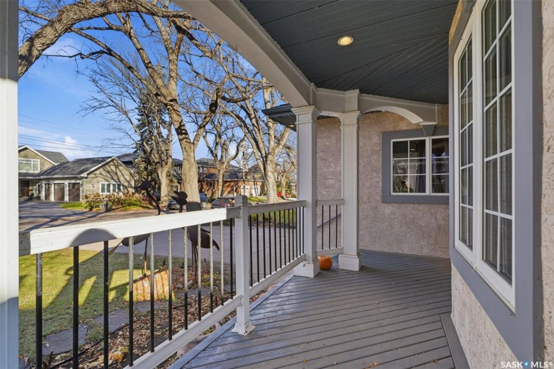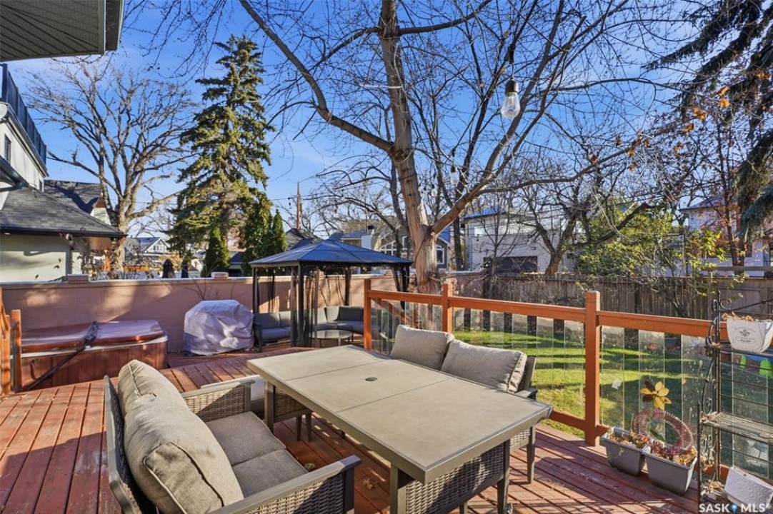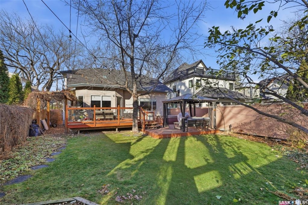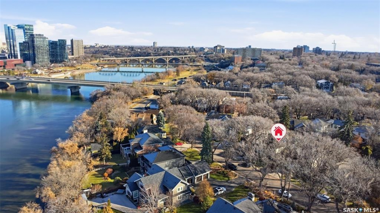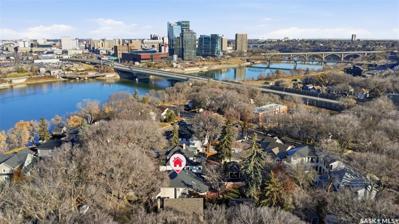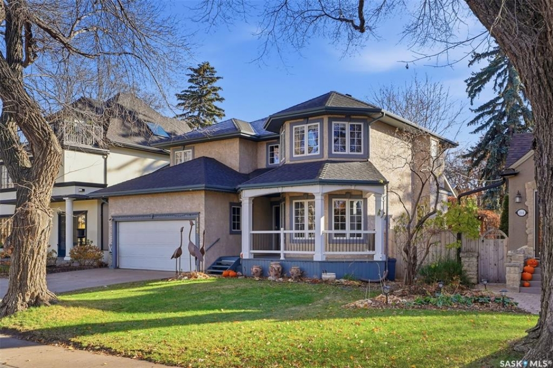 Quiet elegance is what you will feel in this stunning 2 storey located on a historic street close to the river with loads of curb appeal. The entrance leads you into a grand open concept living space with loads of natural light and vaulted ceilings that seem to go on forever. A bright skylight, stainless steel appliances, adjoining living room with fireplace and engineered hardwood flooring make this living space a place to gather with family and friends. What would make this gathering place even better? Main floor wet bar of course. This home has everything! There is main floor laundry, direct entry to garage as well as direct access to the backyard and 2 tiered deck with hot tub right off the dining room and kitchen. The primary suite boasts a stunning 5 piece ensuite with his and hers sinks, soaker tub and separate shower. There are 2 other good sized bedrooms and 4 pc bathroom. The finished basement is perfect for a family – loads of space for teens to occupy or for a young family to have a play area for small children. The backyard is an oasis with a hot tub, 2 tiered deck leading to lush grass and assorted foliage. The home is located steps away from the South Saskatchewan River and all the wonderful walking paths. Enjoy sunrises and sunsets on the front porch or back deck, either way, it is luxury at its finest! Call now to book your private showing.