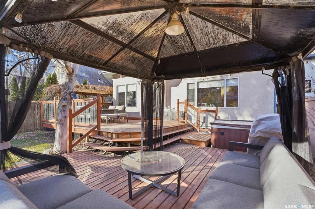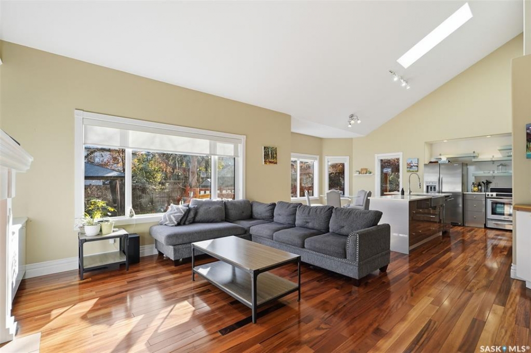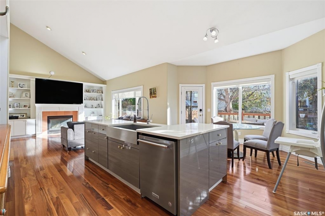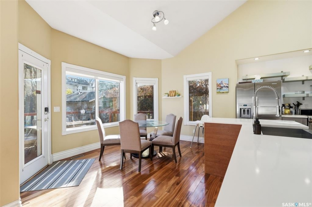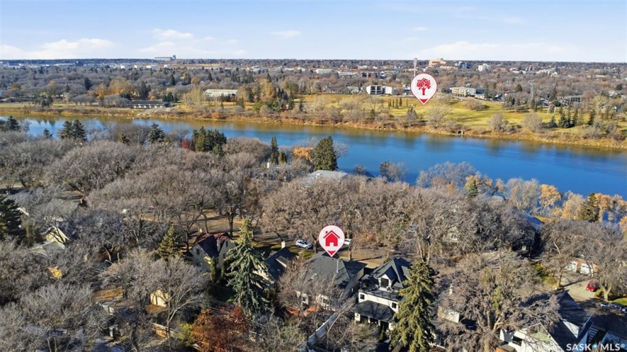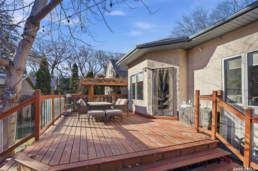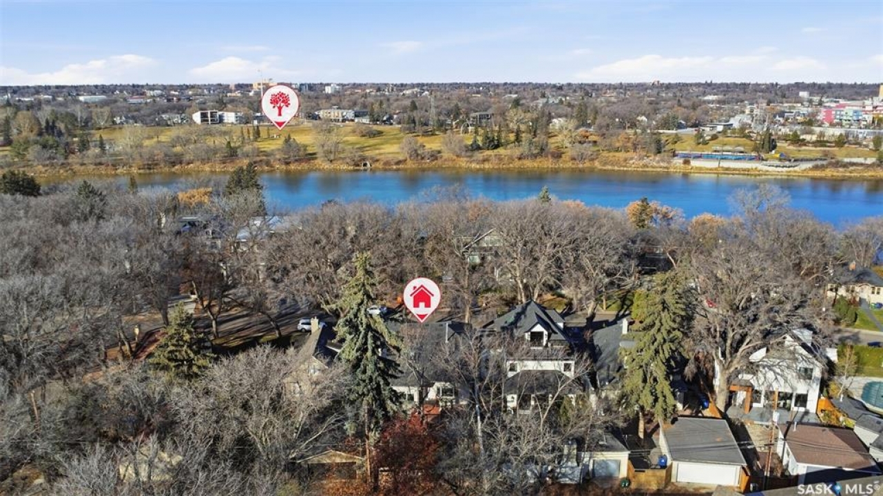 Quiet elegance is what you will feel in this stunning 2 storey located on a historic street close to the river with loads of curb appeal. The entrance leads you into a grand open concept living space with loads of natural light and vaulted ceilings that seem to go on forever. A bright skylight, stainless steel appliances, adjoining living room with fireplace and engineered hardwood flooring make this living space a place to gather with family and friends. What would make this gathering place even better? Main floor wet bar of course. This home has everything! There is main floor laundry, direct entry to garage as well as direct access to the backyard and 2 tiered deck with hot tub right off the dining room and kitchen. The primary suite boasts a stunning 5 piece ensuite with his and hers sinks, soaker tub and separate shower. There are 2 other good sized bedrooms and 4 pc bathroom. The finished basement is perfect for a family – loads of space for teens to occupy or for a young family to have a play area for small children. The backyard is an oasis with a hot tub, 2 tiered deck leading to lush grass and assorted foliage. The home is located steps away from the South Saskatchewan River and all the wonderful walking paths. Enjoy sunrises and sunsets on the front porch or back deck, either way, it is luxury at its finest! Call now to book your private showing.