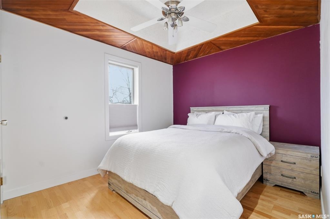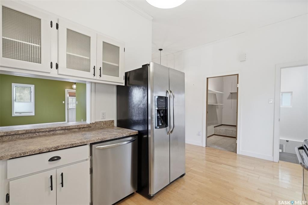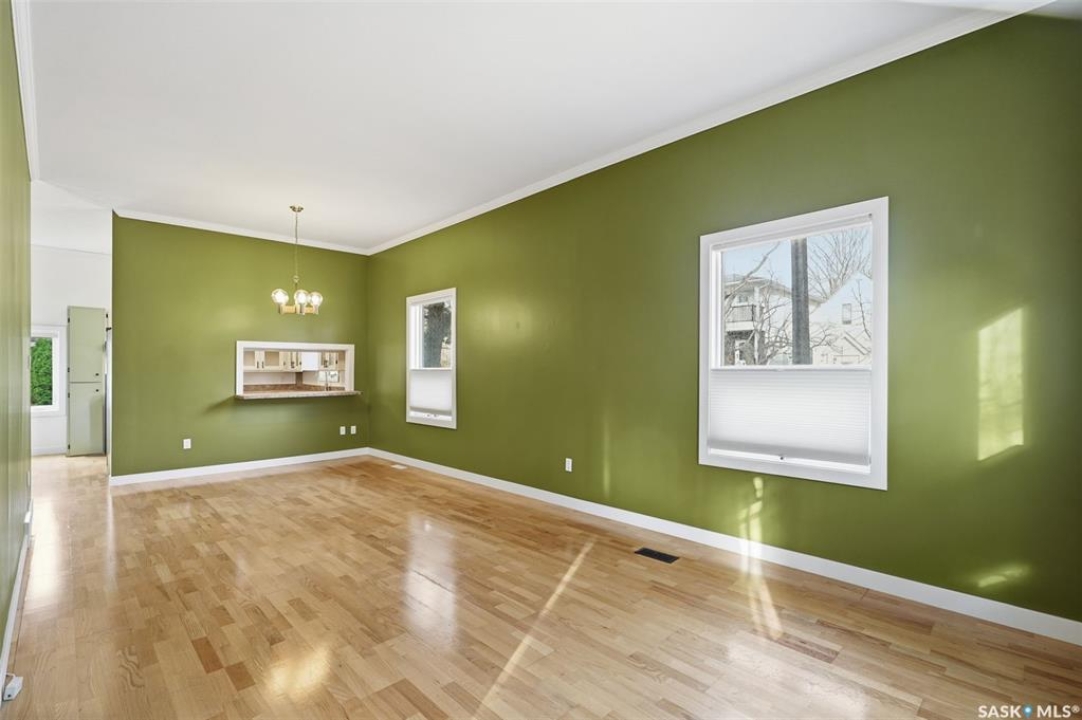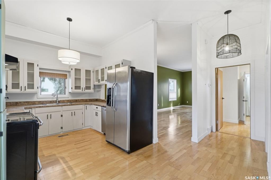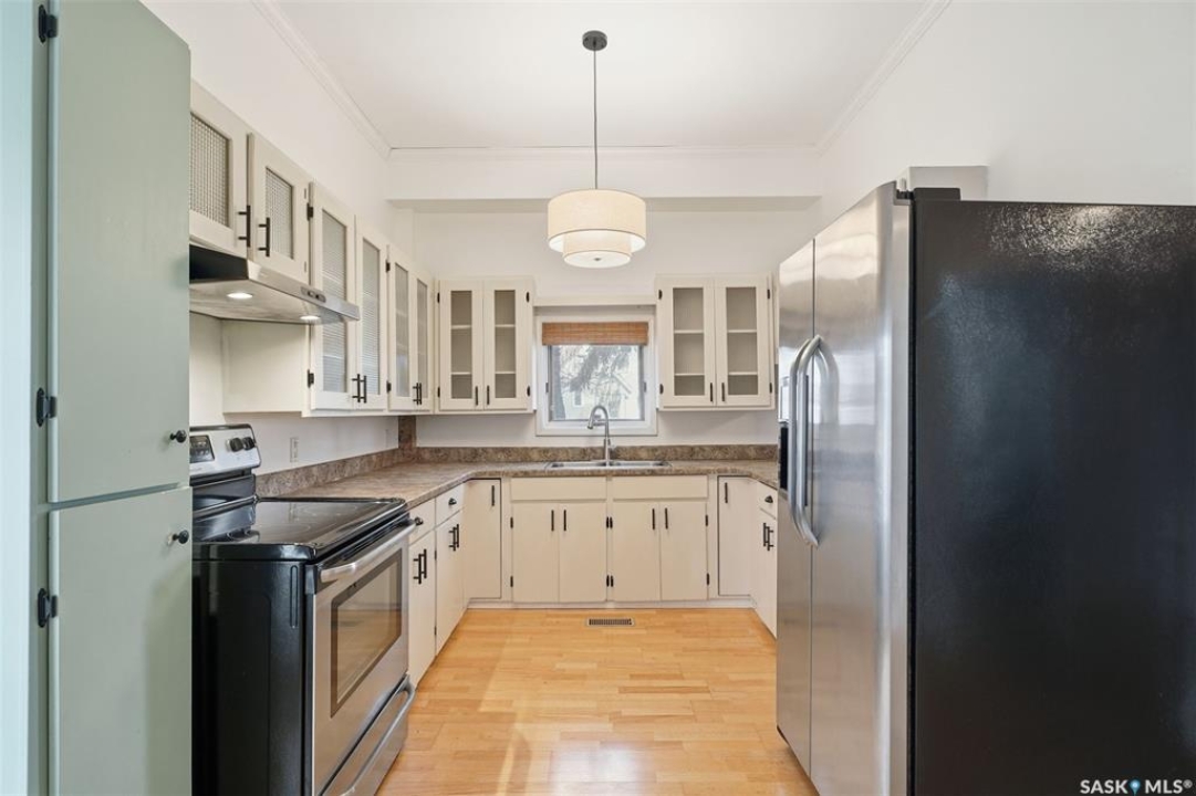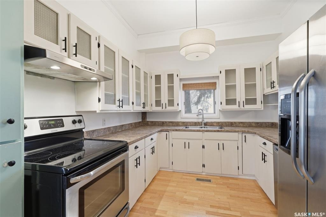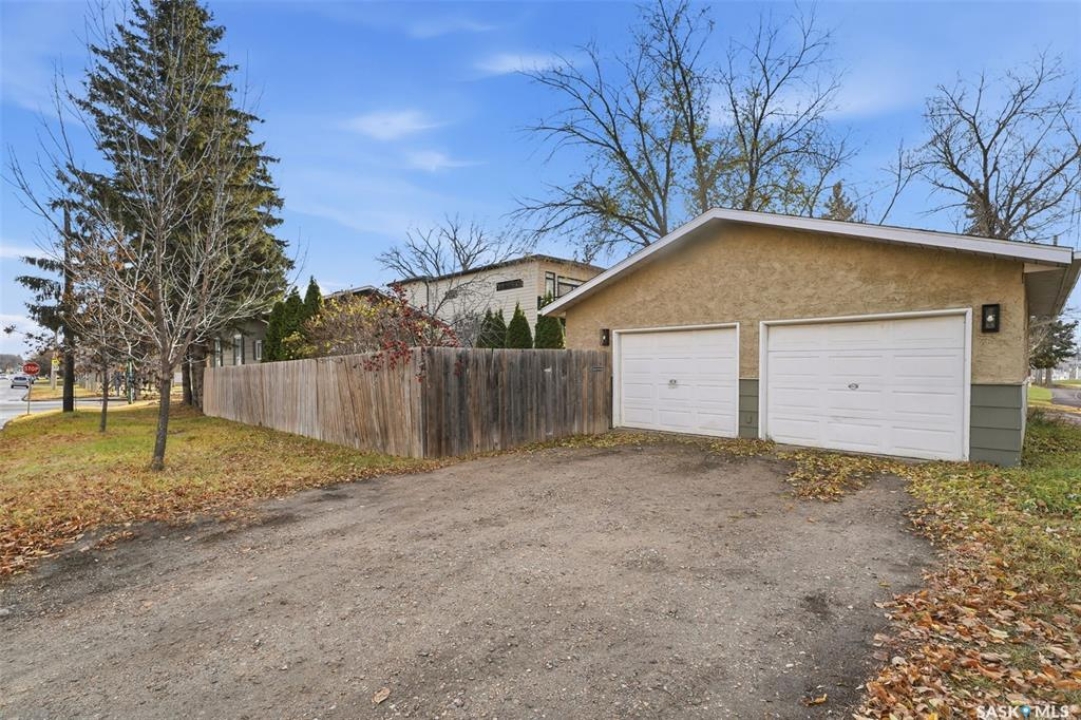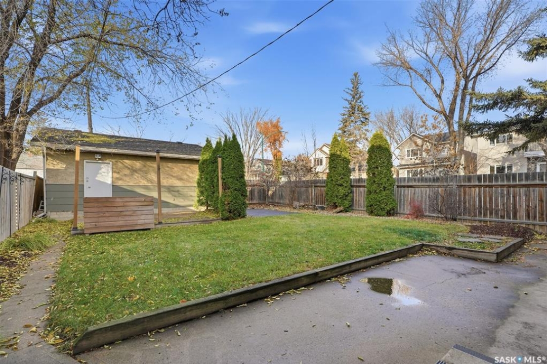 Welcome to 1423 7th Ave N, A raised bungalow with high ceilings and a bright basement with a fantastic location, A park across the street, the river within walking distance, and close to schools, the university, City Hospital and downtown, offering a convenient life, this beautiful 950 sq ft. 2+1-bedroom, 2-bath raised bungalow was completely rebuilt in the 70s and features an open dining and living room area and a classy kitchen with stainless steel appliances. The 10' ceilings with crown mouldings and the hardwood floors translate into charm and character. The lower level is fully developed with a bedroom, bath, family room, den, laundry and spacious storage area. The three large windows in the family room add plenty of natural light, Enjoy the gorgeous backyard, which features a deck, and fire pit stoned patio area, shrubs, and perennials. The detached two-car garage is 25x23 and is insulated and dry-walled for your vehicle, toys and hobbies. QUICK possession available