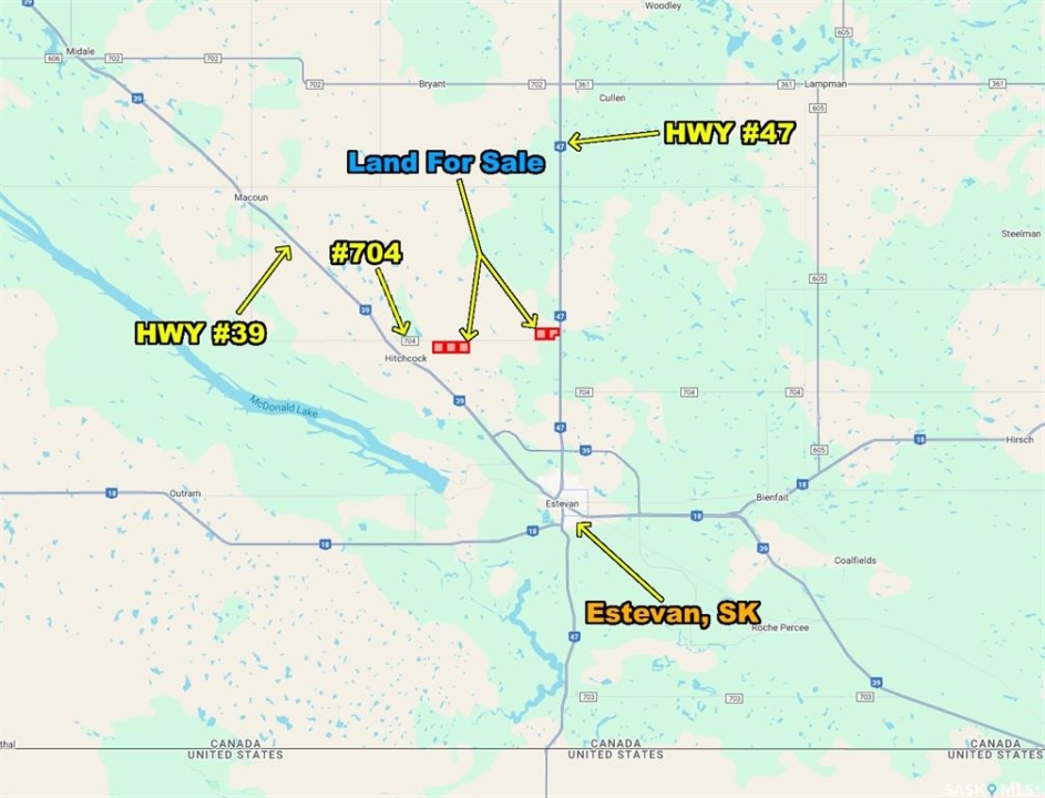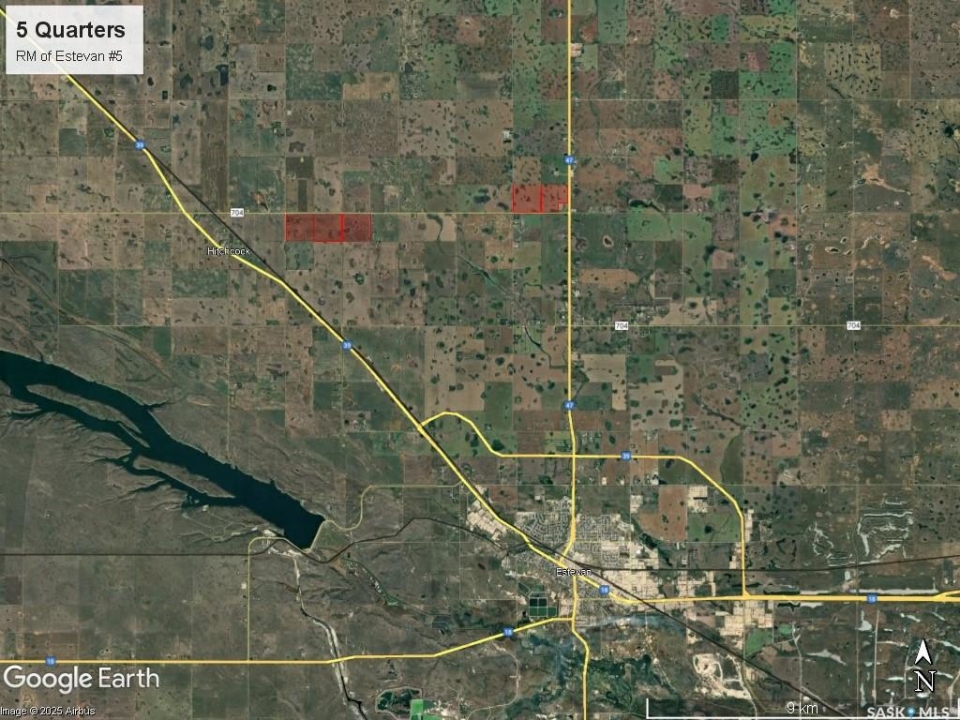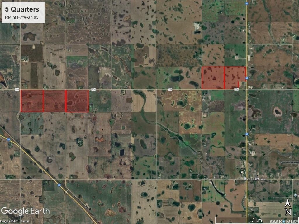 An exceptional opportunity to acquire 765 acres of highly productive farmland ideally located just outside the city of Estevan, Saskatchewan in the RM of Estevan #5. This land offers excellent accessibility and exposure along the 704 Grid, strategically positioned between Highways 47 and 39, with frontage along Highway 47. All five parcels have three phase power lines along the perimeters. The property is divided into two main blocks. Block 1: 473 contiguous acres running east–west, including a half section that can be farmed as a single field, with a grid road separating the third quarter. Block 2: 292 contiguous acres situated at the junction of Highway 47 and the 704 Grid. The acreage in the southeast corner of the SE 27-3-8 W2 is not owned by the seller and is not included. Land Details: According to SAMA Field Sheets, the land features approximately 663 cultivated acres with a soil final rating weighted average of 52.08. Topography is rated T1 (level to nearly level) and stones S2 (slight). Saskatchewan Crop Insurance classifications include three “H” quarters and two “J” quarters, reflecting strong productive capacity across the farm. Occupancy: The land is available to be farmed by the Buyer for the 2026 crop year, with no right of refusal in place. Sale Structure: Four quarters are being sold by way of share sale (NW 24-3-9 W2, NE 24-3-9 W2, NW 19-3-8 W2, Pt SE 27-3-8 W2 Ext 1), while one quarter will be sold by title transfer (SW 27-3-8 W2). While the owners preference is for the sale of shares for the four quarters they will also consider offers for the titles (non-share sale). For full details and transaction structure, contact agent.