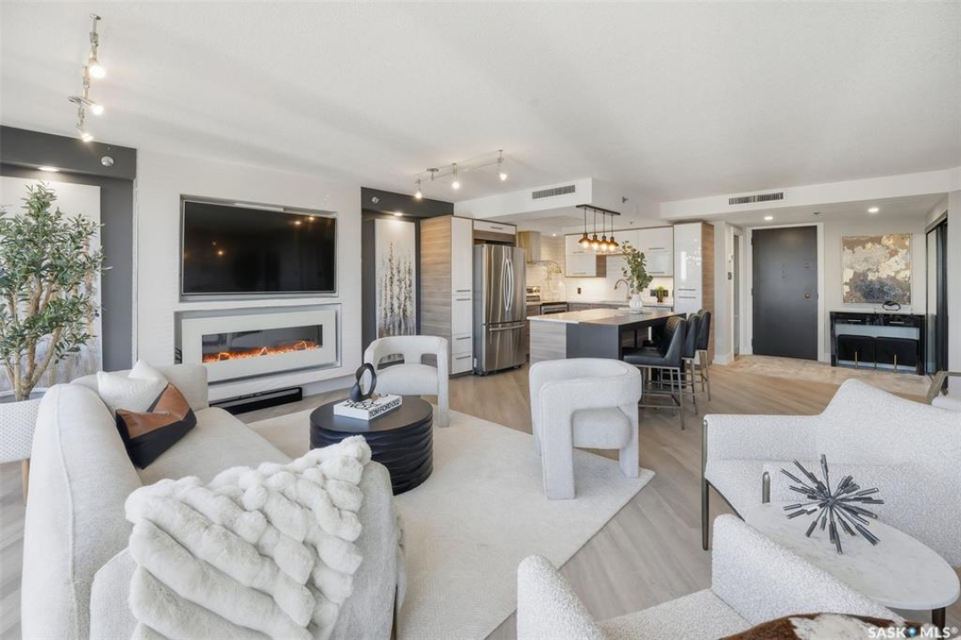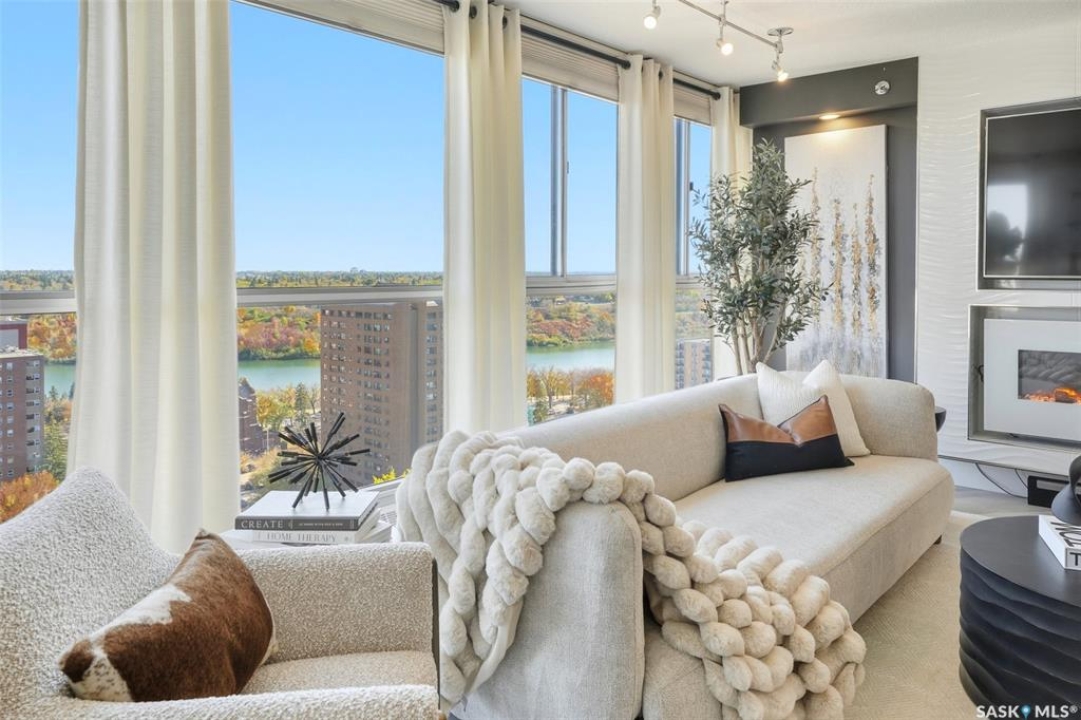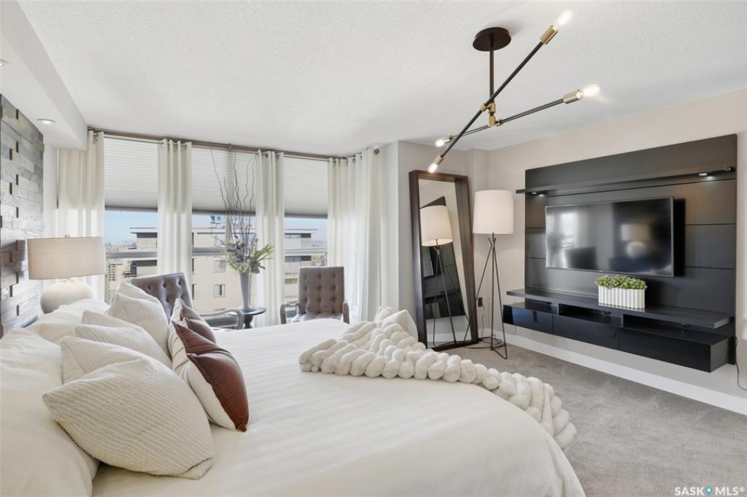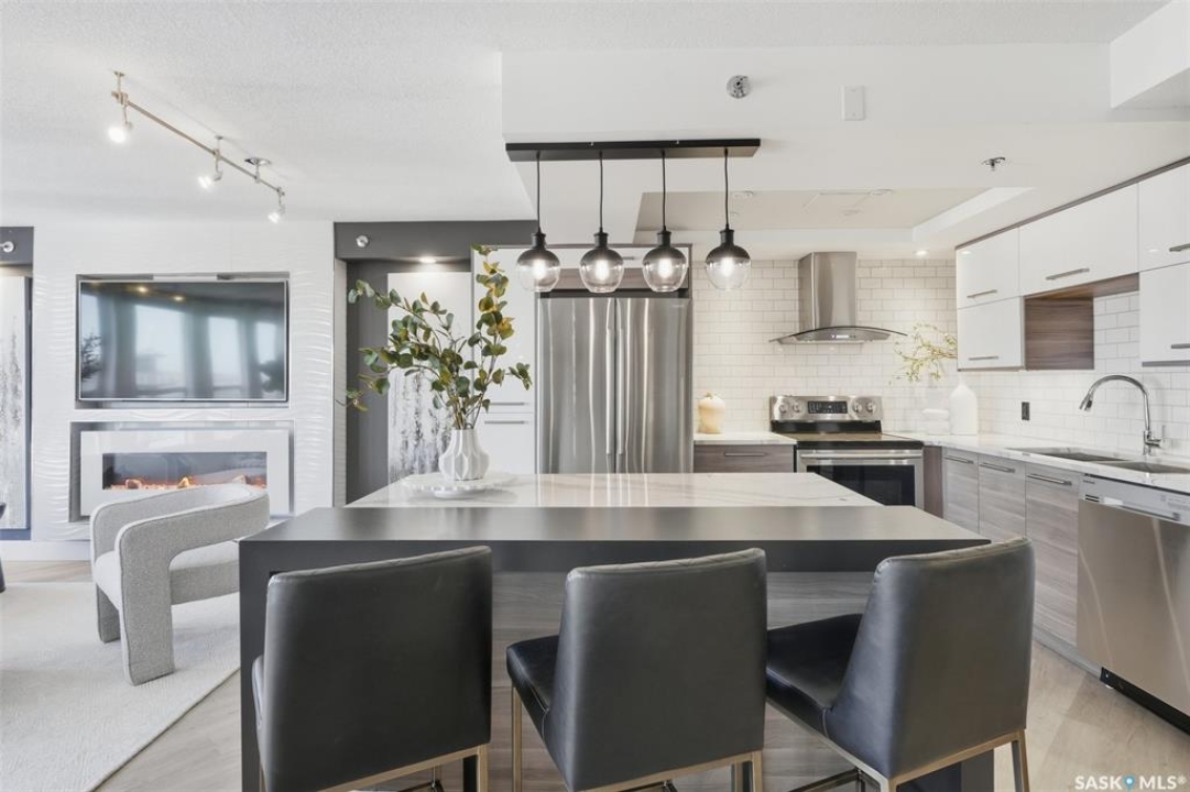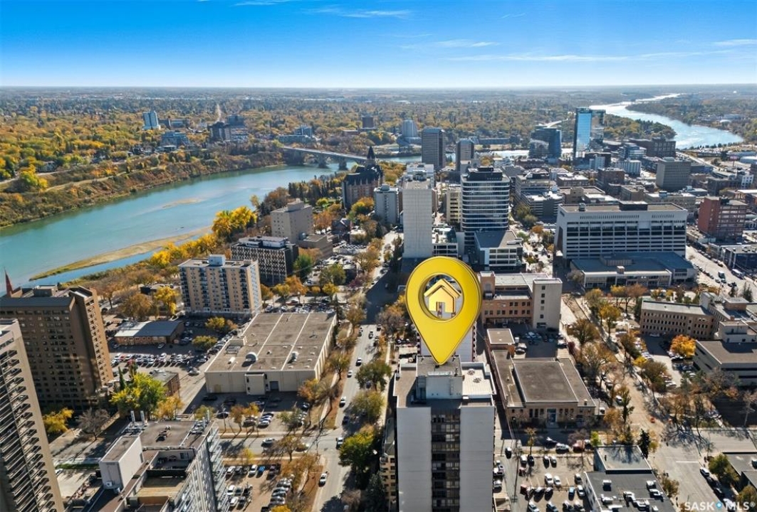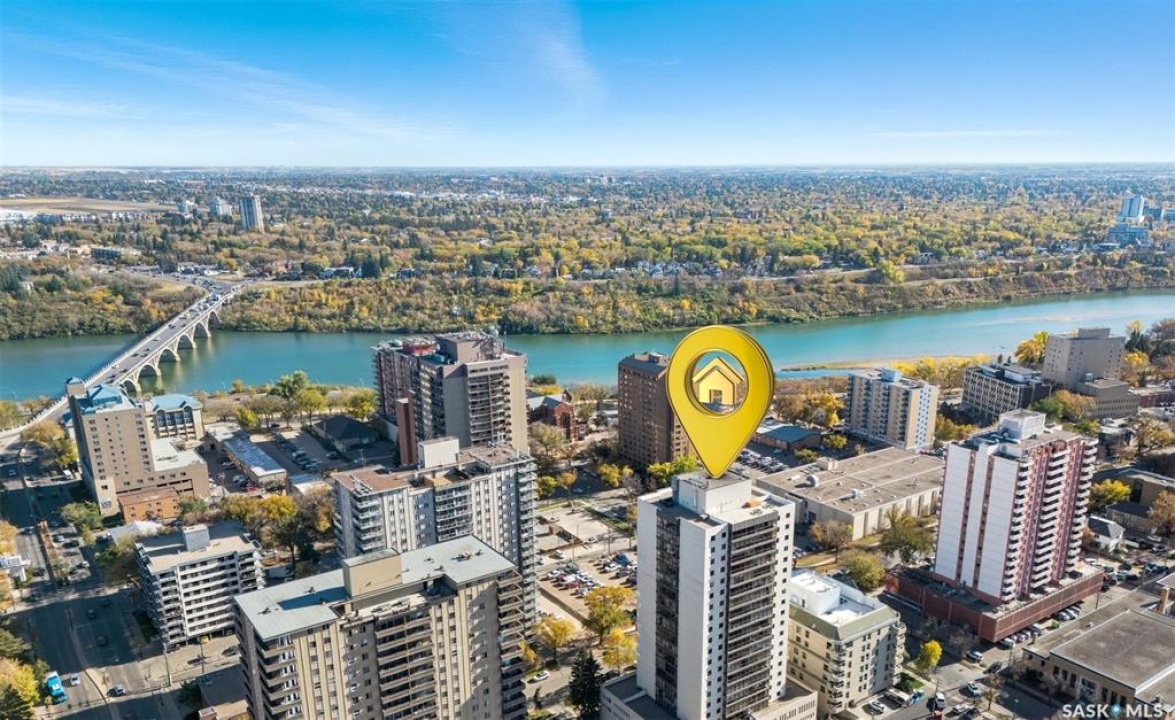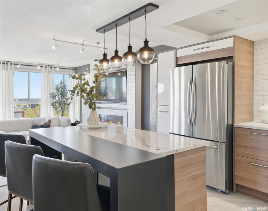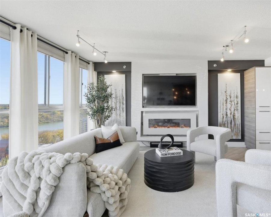 Experience Downtown Saskatoon Penthouse Living with an amazing View of the River! Indulge your desire for high-end, maintenance-free living with this breathtaking 1,528 sqft Penthouse Condominium in the vibrant core of Saskatoon. Far more than a home, this is a lifestyle defined by convenience and sophistication, boasting an enviable Walk Score of 96 and a Bike Score of 99. This professionally renovated sanctuary is a testament to modern design. The stunning kitchen is a chef's dream, featuring upgraded appliances, sleek quartz countertops, and a generous island with a sit-up bar that flows seamlessly into the main living space. The entire unit has been elevated with modern flooring, designer paint tones, and updated light fixtures, culminating in the removal & replacement of the dated ceiling for a smooth, contemporary finish. Designer touches by Fresco Interiors, including but not limited to custom drapery, add a final touch of tailored elegance. Upgraded blinds throughout give you privacy when you want it most. Step outside and immerse yourself in the city's best. You are mere steps from the 60 km of trails in the serene Meewasin Valley. Enjoy cultural gems like the Remai Modern, Persephone Theatre, and the charming seasonal Shakespeare on the Saskatchewan. Every amenity—from fine dining and popular taverns to museums and nature parks—is just a short, pleasant stroll away. The Terrace amenities redefine community living, offering a large facility with a swimming pool, hot tub, sauna, an adjacent indoor lounge, and an expansive outdoor patio with community barbecues. For an even more spectacular experience, retreat to the rooftop patio for breathtaking, panoramic city views. Your exclusive, heated covered parking spot means you can safely forget about your vehicle and embrace urban life. Don't just move... move up! Call today for a private viewing of this affordable, classy, and perfectly located penthouse on Fifth Avenue.