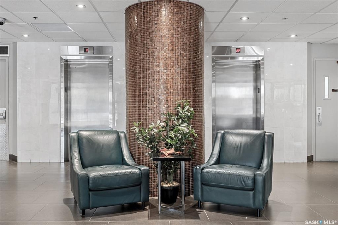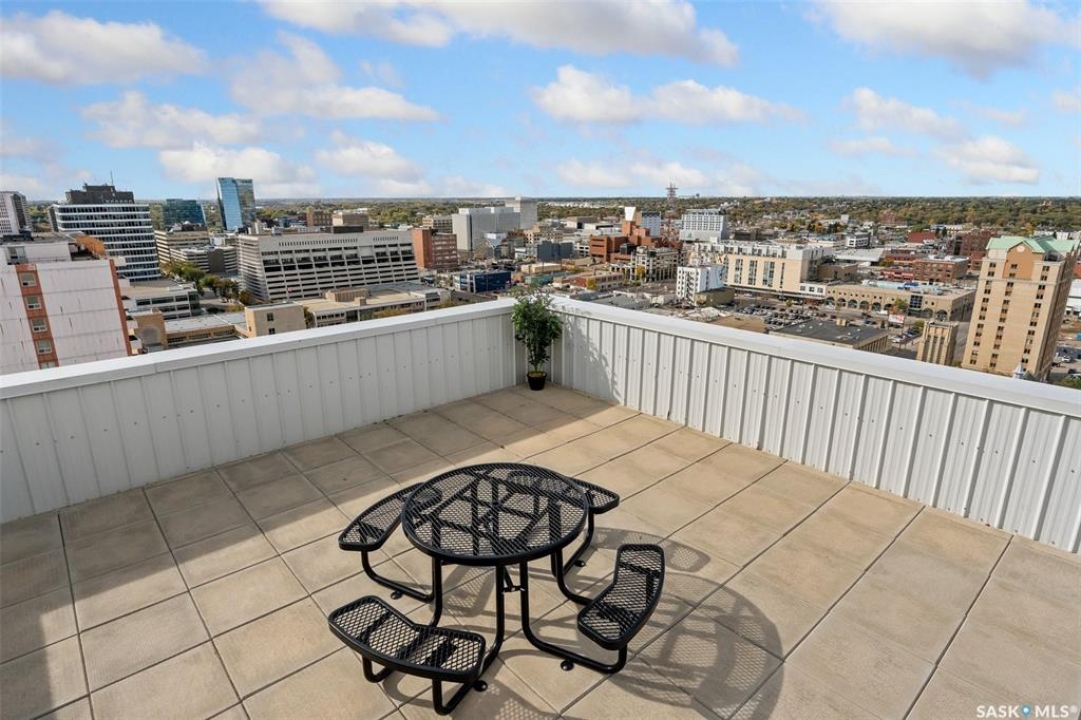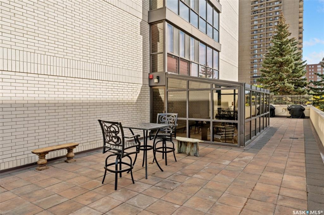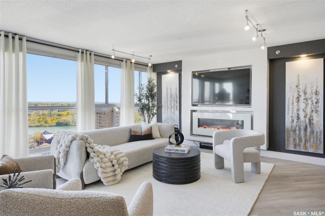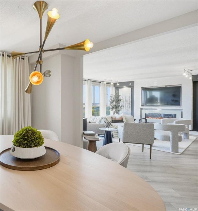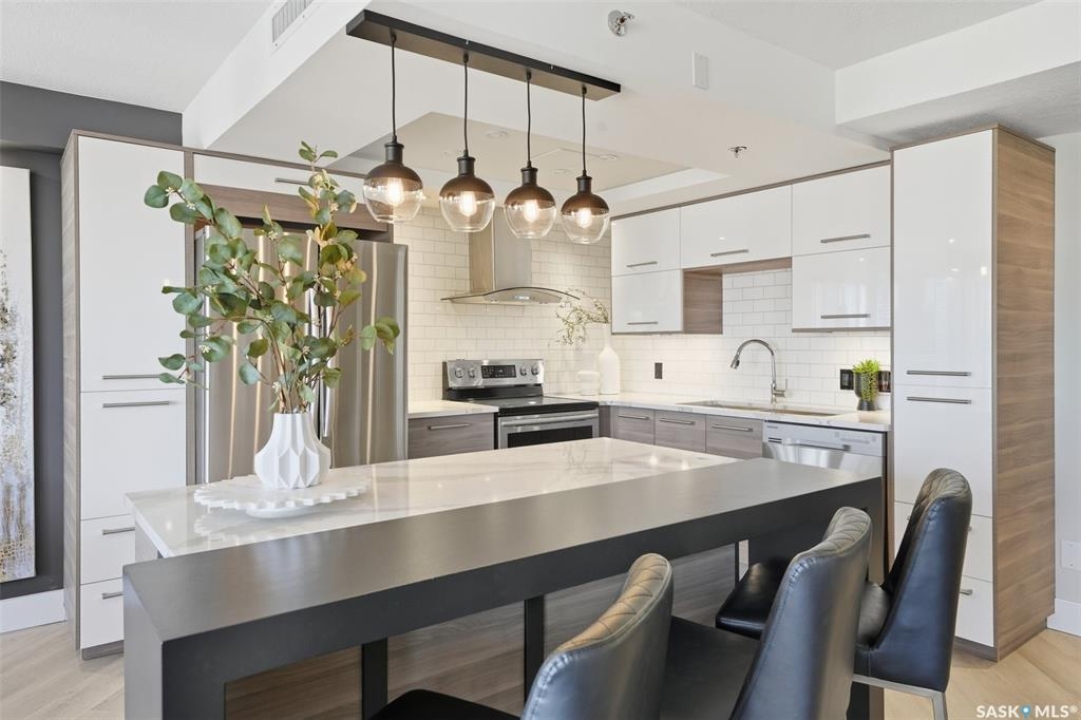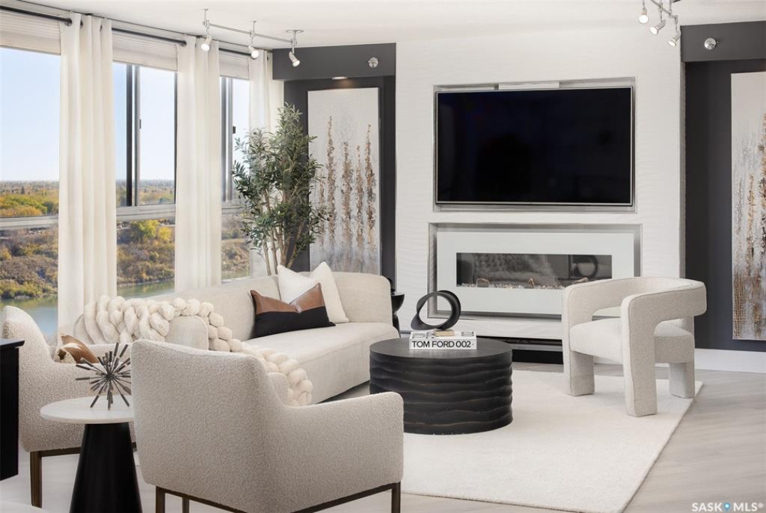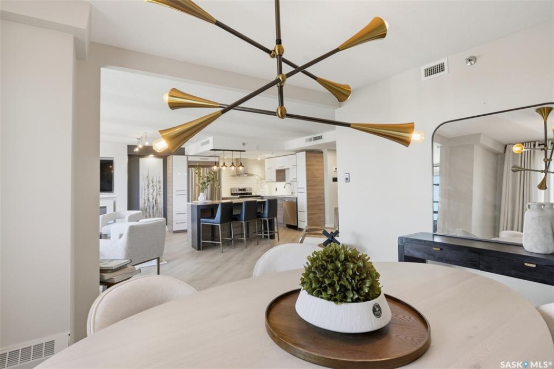 Experience Downtown Saskatoon Penthouse Living with an amazing View of the River! Indulge your desire for high-end, maintenance-free living with this breathtaking 1,528 sqft Penthouse Condominium in the vibrant core of Saskatoon. Far more than a home, this is a lifestyle defined by convenience and sophistication, boasting an enviable Walk Score of 96 and a Bike Score of 99. This professionally renovated sanctuary is a testament to modern design. The stunning kitchen is a chef's dream, featuring upgraded appliances, sleek quartz countertops, and a generous island with a sit-up bar that flows seamlessly into the main living space. The entire unit has been elevated with modern flooring, designer paint tones, and updated light fixtures, culminating in the removal & replacement of the dated ceiling for a smooth, contemporary finish. Designer touches by Fresco Interiors, including but not limited to custom drapery, add a final touch of tailored elegance. Upgraded blinds throughout give you privacy when you want it most. Step outside and immerse yourself in the city's best. You are mere steps from the 60 km of trails in the serene Meewasin Valley. Enjoy cultural gems like the Remai Modern, Persephone Theatre, and the charming seasonal Shakespeare on the Saskatchewan. Every amenity—from fine dining and popular taverns to museums and nature parks—is just a short, pleasant stroll away. The Terrace amenities redefine community living, offering a large facility with a swimming pool, hot tub, sauna, an adjacent indoor lounge, and an expansive outdoor patio with community barbecues. For an even more spectacular experience, retreat to the rooftop patio for breathtaking, panoramic city views. Your exclusive, heated covered parking spot means you can safely forget about your vehicle and embrace urban life. Don't just move... move up! Call today for a private viewing of this affordable, classy, and perfectly located penthouse on Fifth Avenue.