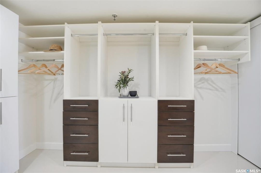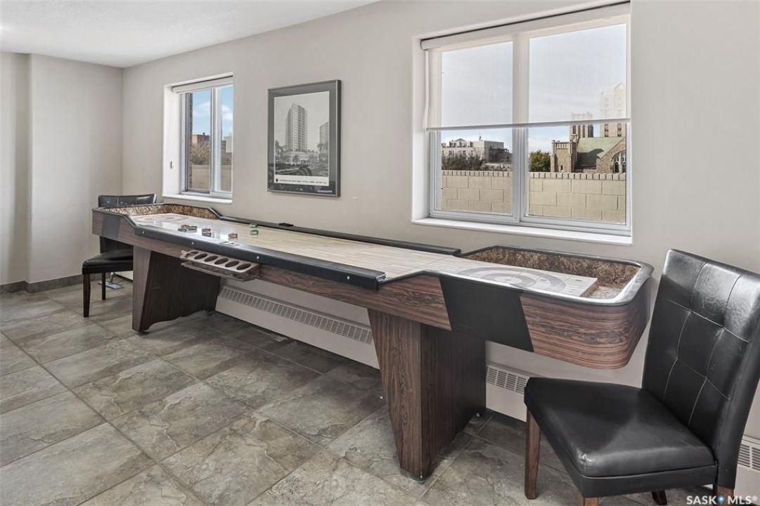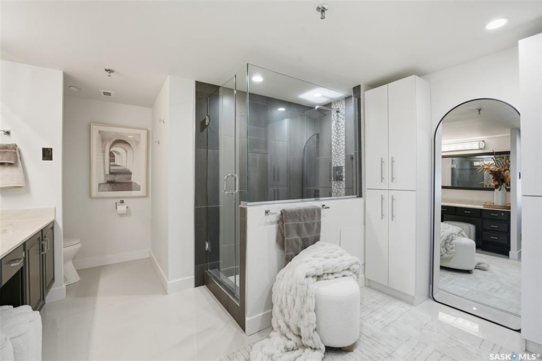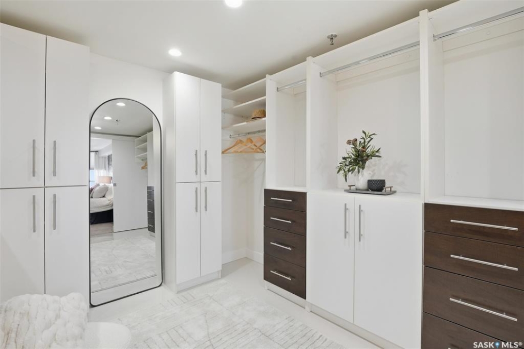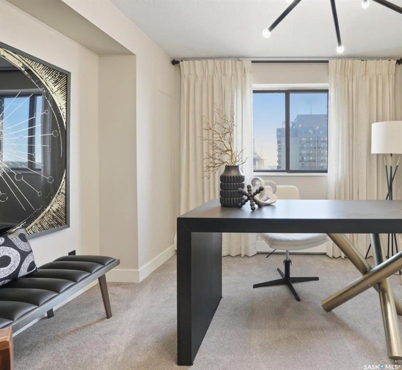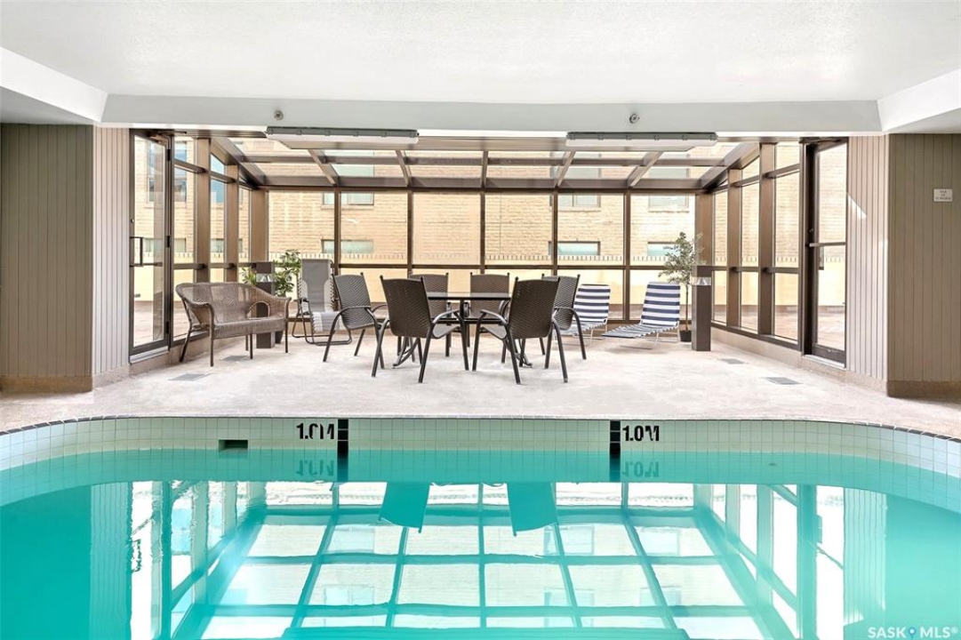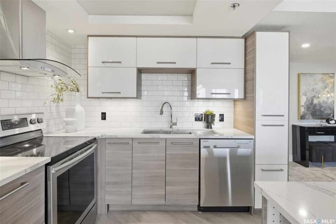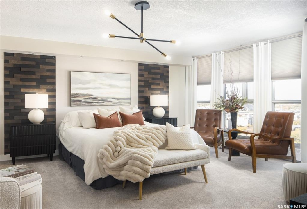 Experience Downtown Saskatoon Penthouse Living with an amazing View of the River! Indulge your desire for high-end, maintenance-free living with this breathtaking 1,528 sqft Penthouse Condominium in the vibrant core of Saskatoon. Far more than a home, this is a lifestyle defined by convenience and sophistication, boasting an enviable Walk Score of 96 and a Bike Score of 99. This professionally renovated sanctuary is a testament to modern design. The stunning kitchen is a chef's dream, featuring upgraded appliances, sleek quartz countertops, and a generous island with a sit-up bar that flows seamlessly into the main living space. The entire unit has been elevated with modern flooring, designer paint tones, and updated light fixtures, culminating in the removal & replacement of the dated ceiling for a smooth, contemporary finish. Designer touches by Fresco Interiors, including but not limited to custom drapery, add a final touch of tailored elegance. Upgraded blinds throughout give you privacy when you want it most. Step outside and immerse yourself in the city's best. You are mere steps from the 60 km of trails in the serene Meewasin Valley. Enjoy cultural gems like the Remai Modern, Persephone Theatre, and the charming seasonal Shakespeare on the Saskatchewan. Every amenity—from fine dining and popular taverns to museums and nature parks—is just a short, pleasant stroll away. The Terrace amenities redefine community living, offering a large facility with a swimming pool, hot tub, sauna, an adjacent indoor lounge, and an expansive outdoor patio with community barbecues. For an even more spectacular experience, retreat to the rooftop patio for breathtaking, panoramic city views. Your exclusive, heated covered parking spot means you can safely forget about your vehicle and embrace urban life. Don't just move... move up! Call today for a private viewing of this affordable, classy, and perfectly located penthouse on Fifth Avenue.