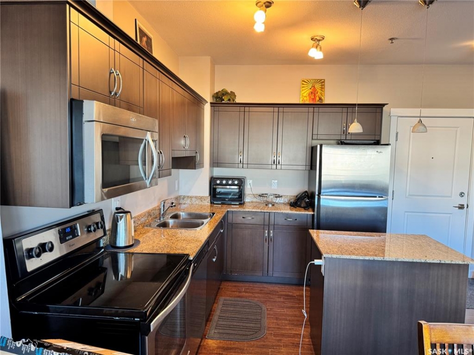 Affordable comfort meets modern convenience — your perfect start in Blairmore. Welcome to this stylish and functional 1-bedroom, 1-bathroom condo offering 580 sq ft of thoughtfully designed living space in the heart of Blairmore. With 9 ft ceilings and a bright open-concept layout, this second-floor unit feels spacious and inviting from the moment you walk in. The kitchen features sleek stone countertops and plenty of workspace, while the generous living area opens onto a large north-facing balcony — complete with a natural gas BBQ hookup for effortless outdoor dining. You'll love the oversized storage/laundry room that provides exceptional functionality and organization — a rare find in condo living! Enjoy the comfort of central air conditioning, a convenient surface parking stall, and elevator access in this well-kept building. Perfectly located within walking distance to all of Blairmore's shopping, restaurants, and amenities, this condo combines value and lifestyle in one package. Priced to sell — don't miss your chance! Book your showing today!