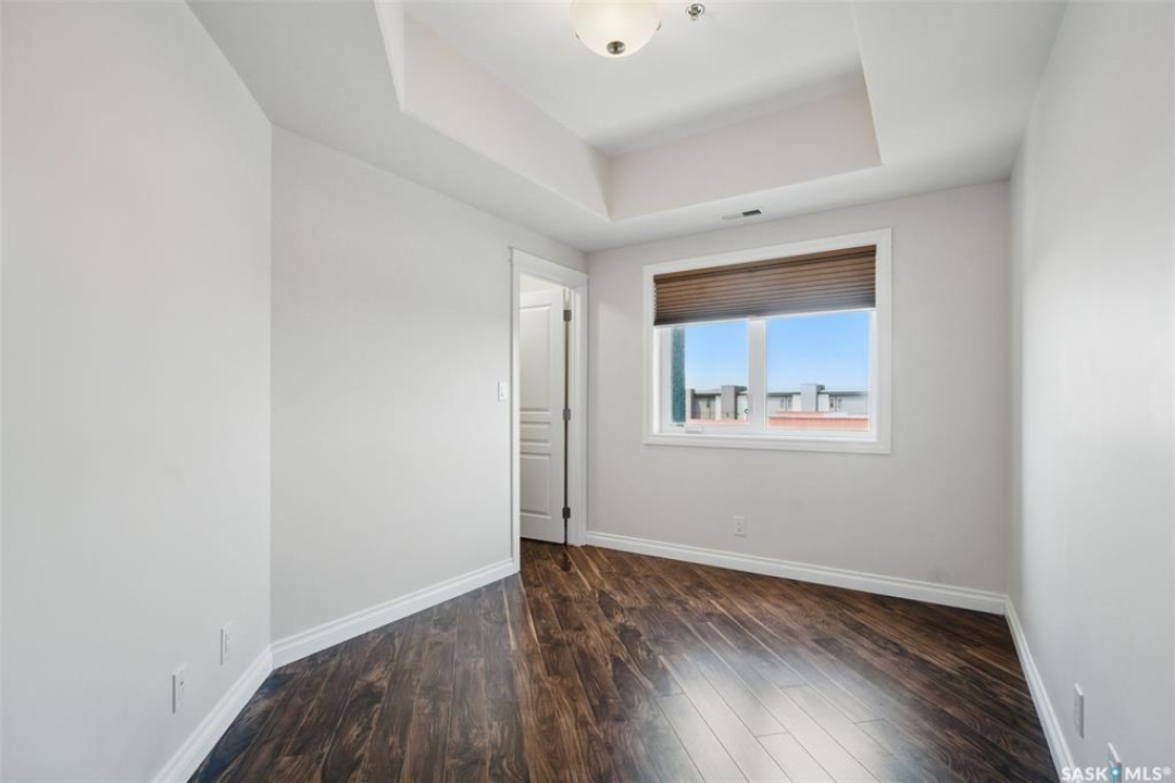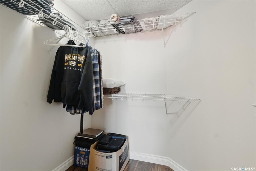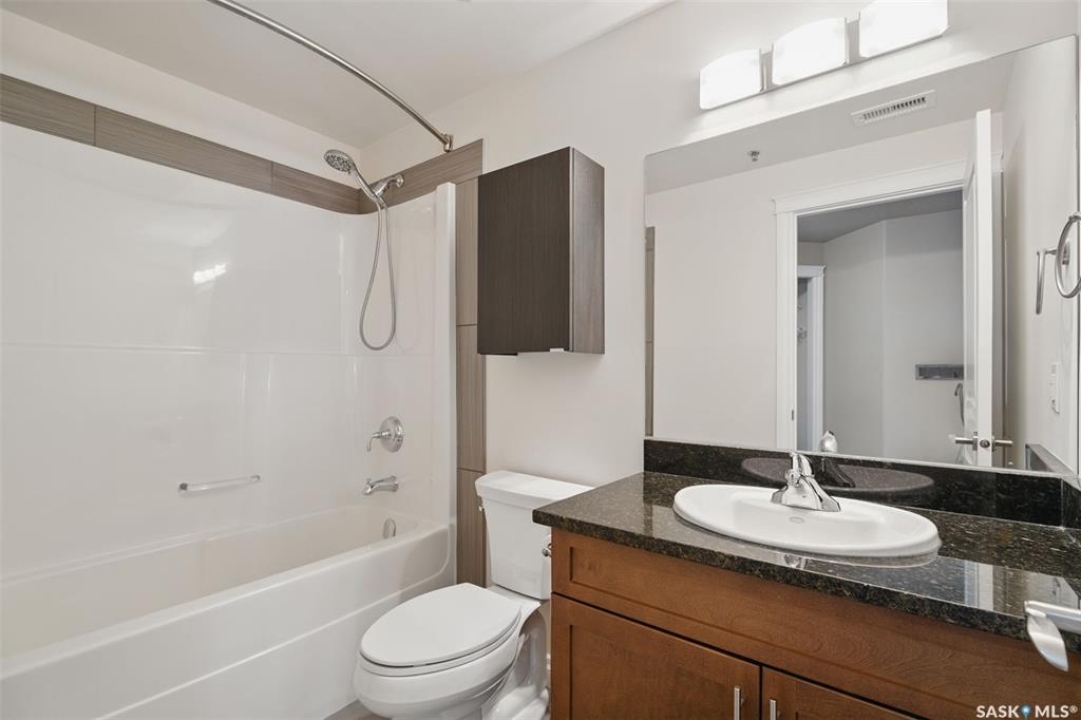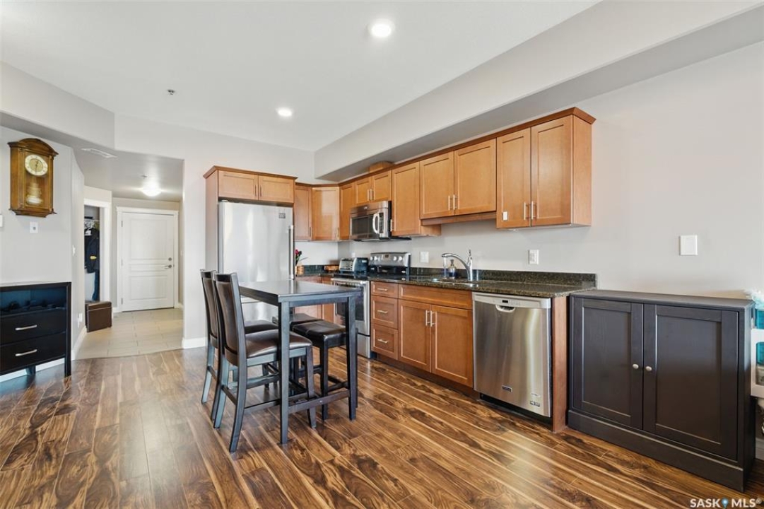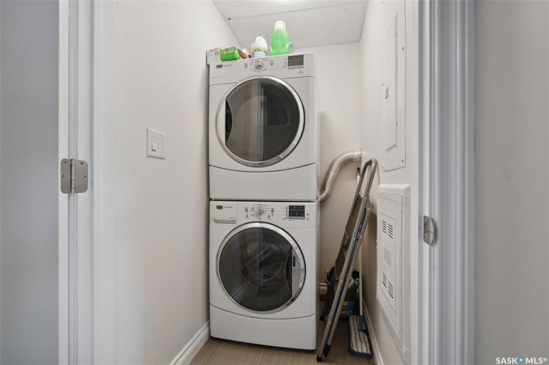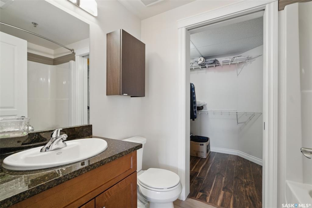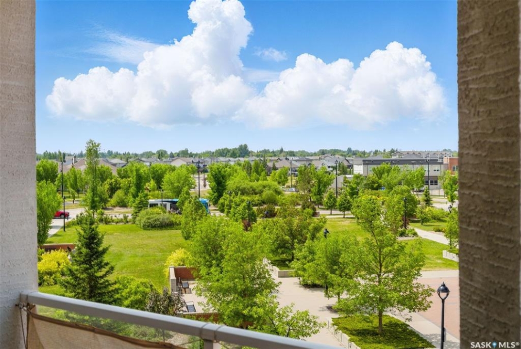 Experience top-floor living in this exceptional, west-facing, 2-bedroom, 2-bathroom condo, perfectly situated in the highly desirable neighbourhood of Willowgrove. This unit's features include a spacious and modern open concept with 9-foot ceilings that create an airy and expansive feel, granite countertops, stainless steel appliances, easy-to-care-for tile and laminate flooring, and Hunter Douglas blinds throughout. Enjoy the convenience and security of one underground parking stall, ensuring your vehicle is safe from the elements and ready to roll, saving you time and effort during the coldest of winters. The underground storage locker is perfect for storing your bikes and other gear. An abundance of visitor parking spots ensures your guests always have a place to park. For those who appreciate privacy, step outside and enjoy a 120-square-foot balcony that is afternoon and evening sunned. Relax and unwind on the largest balcony that the building offers with a tranquil view of the clock-square green space below and an unobstructed panorama of the skyline above—a perfect spot for your morning coffee or evening relaxation. The location is a true highlight. You'll find yourself within easy walking distance of a variety of grocery stores, banks, restaurants, and medical offices. With a bus stop right outside the building and a new daycare nearing completion across the street, this condo is a fantastic fit for both U of S students and small families seeking convenience and accessibility. Pets allowed with board approval. This condo truly has it all. Book your private showing today and discover your new home.