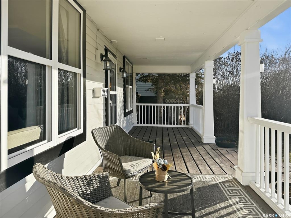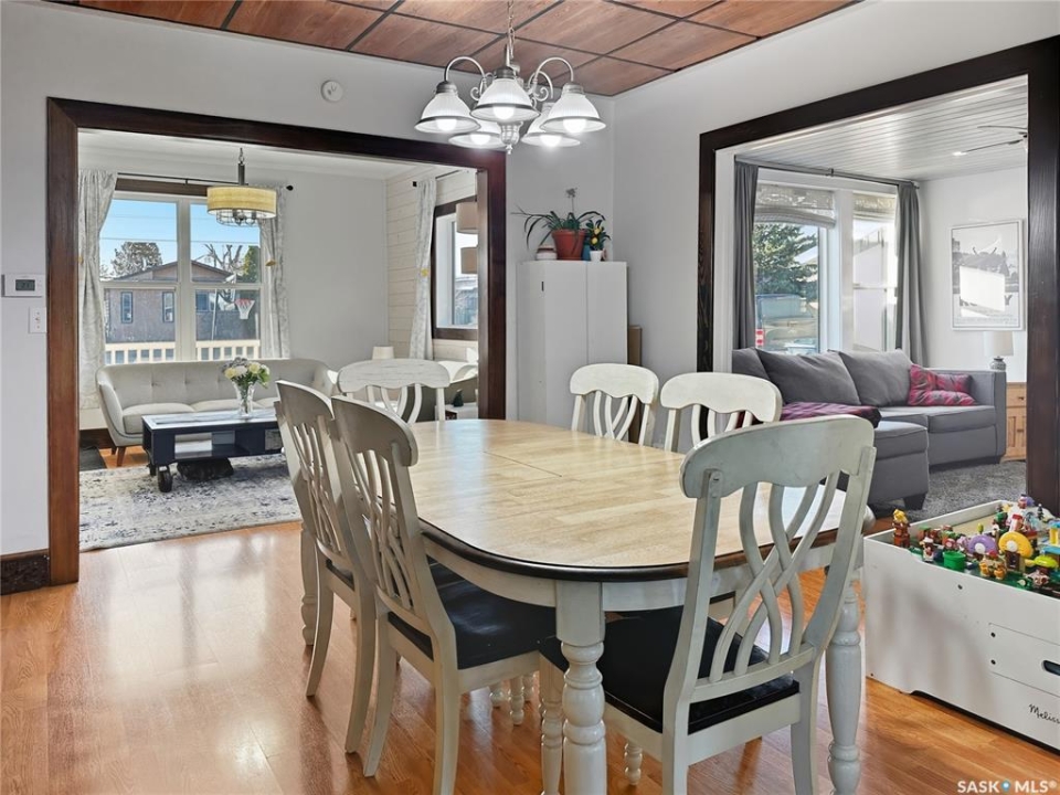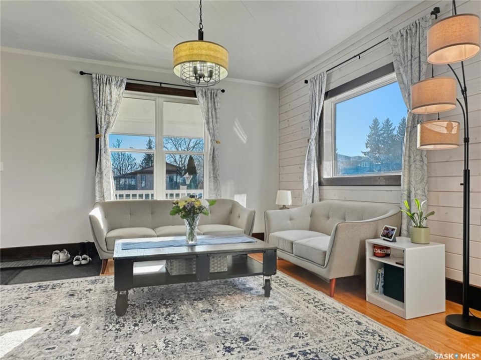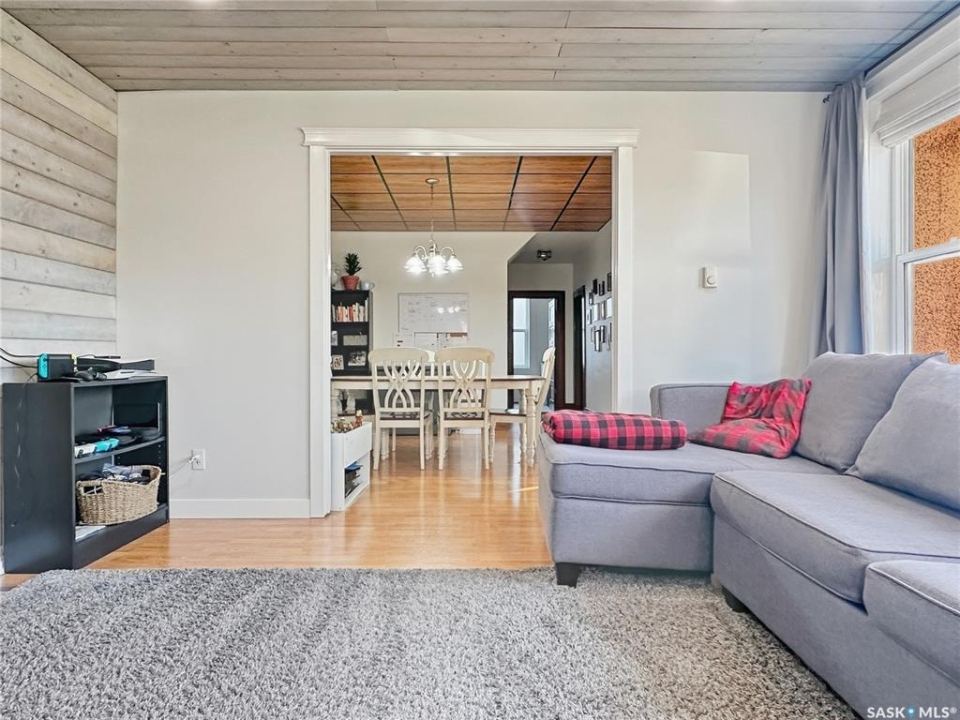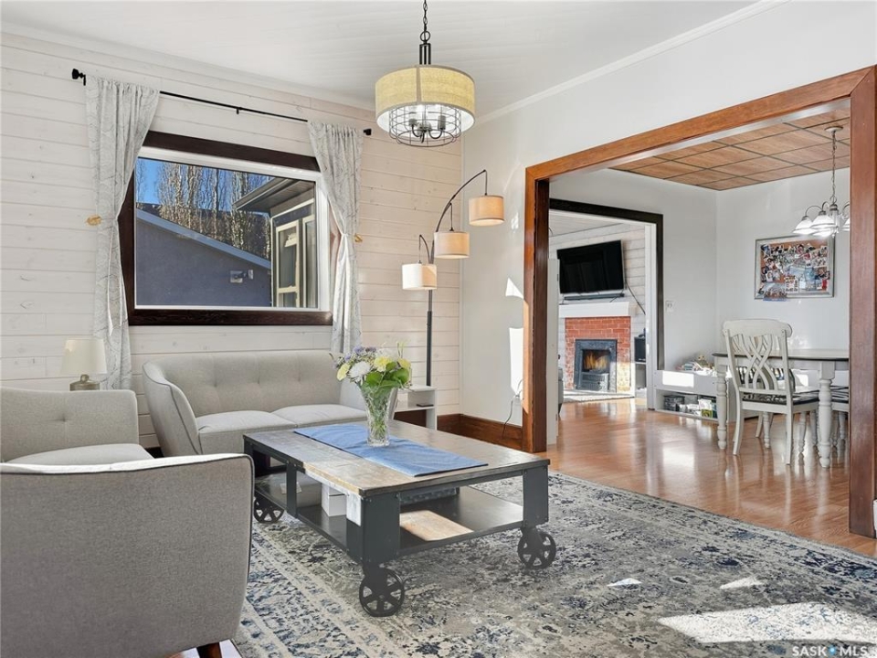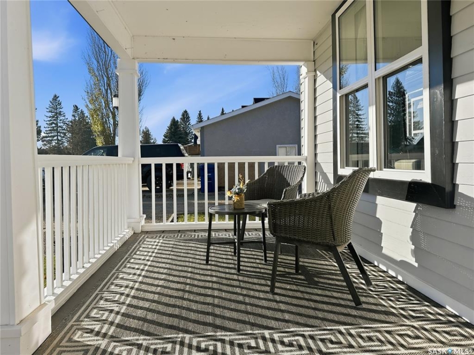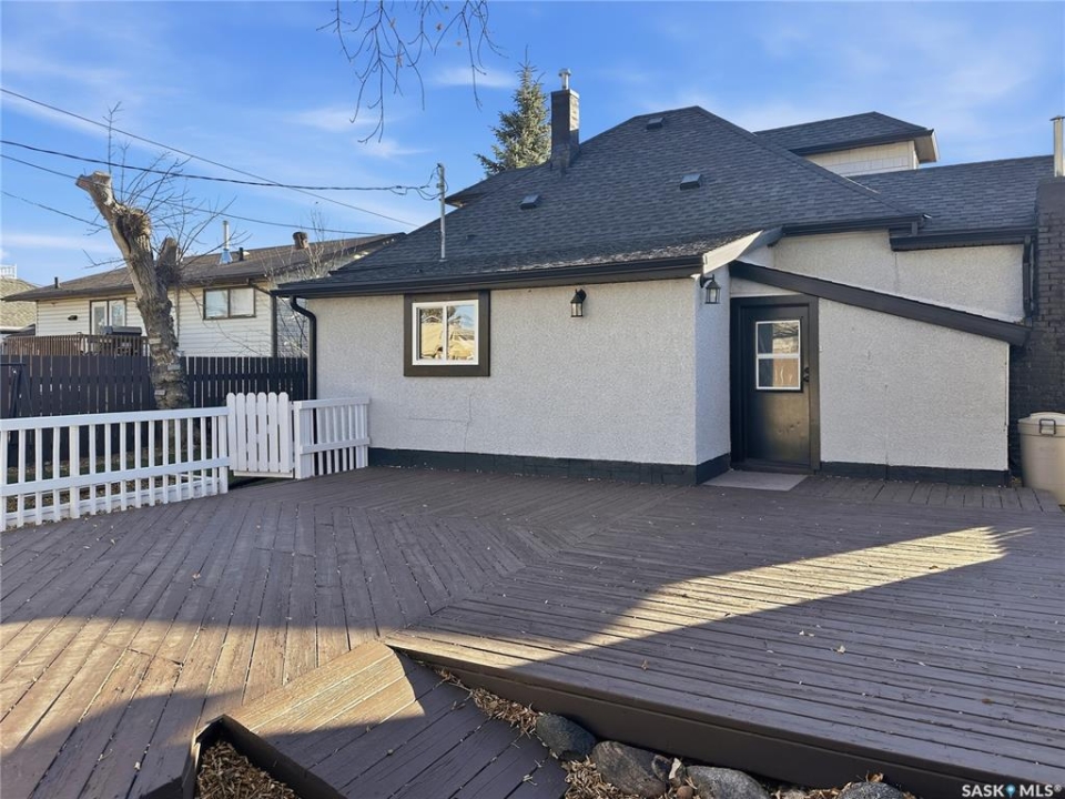 If these walls could talk… built in 1912, this solid and well-maintained home has countless stories to tell and all the character you've been searching for. Located in the beautiful Town of Battleford, this property blends timeless charm with thoughtful updates. Step inside and feel the warmth right away. The spacious layout features large entryways connecting each room, with natural light pouring through the updated windows. A stunning solid wood banister greets you at the front door—a classic hallmark of homes from this era. The living room is welcoming and flows seamlessly into the large dining area, perfect for hosting family and friends. Adjacent to the dining room is a cozy family room that was completely redone—taken down to the studs with new insulation, lighting, and a feature wall showcasing an electric fireplace set in the original brick surround. The kitchen offers excellent storage with an island, pantry, and plenty of cabinetry. Off the back door, you'll find a spacious mudroom ideal for winter gear and everyday use. The primary bedroom is conveniently located on the main floor, right next to the laundry area and a beautifully renovated 4-piece bathroom with quality finishes. Upstairs are two unique bedrooms, full of character and charm—each with cozy nooks perfect for reading or play. The partial basement is great for storage and houses the updated furnace, hot water heater, and electrical panel. Central air conditioning was just installed in 2025 for added comfort. Outside, enjoy a large deck for entertaining, a fenced yard with a play structure and garden shed, and a single detached garage with a brand-new overhead door. And after a long day's work, unwind on the quaint covered front porch—a perfect spot to relax and take in the peaceful surroundings. This one-of-a-kind Battleford home is filled with history, charm, and comfort—ready for its next story to begin. Call for your personal tour of this beautiful property today!
