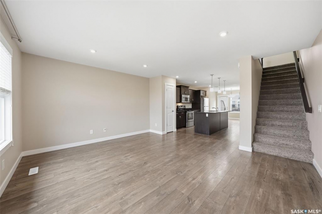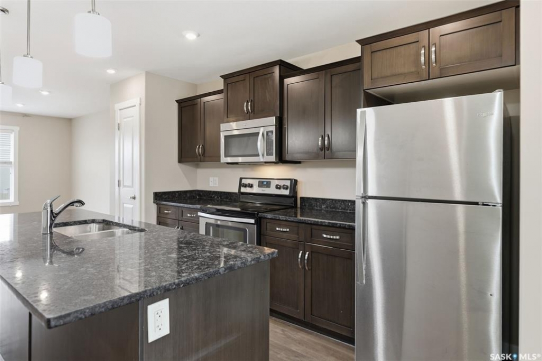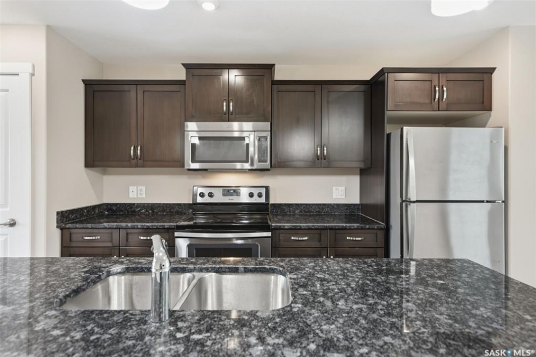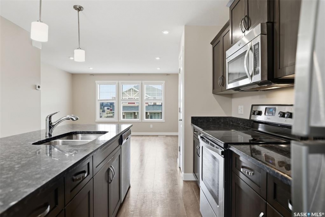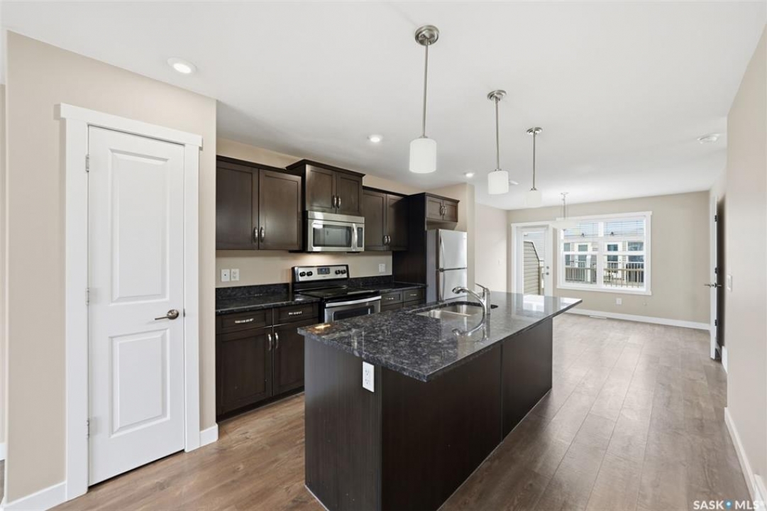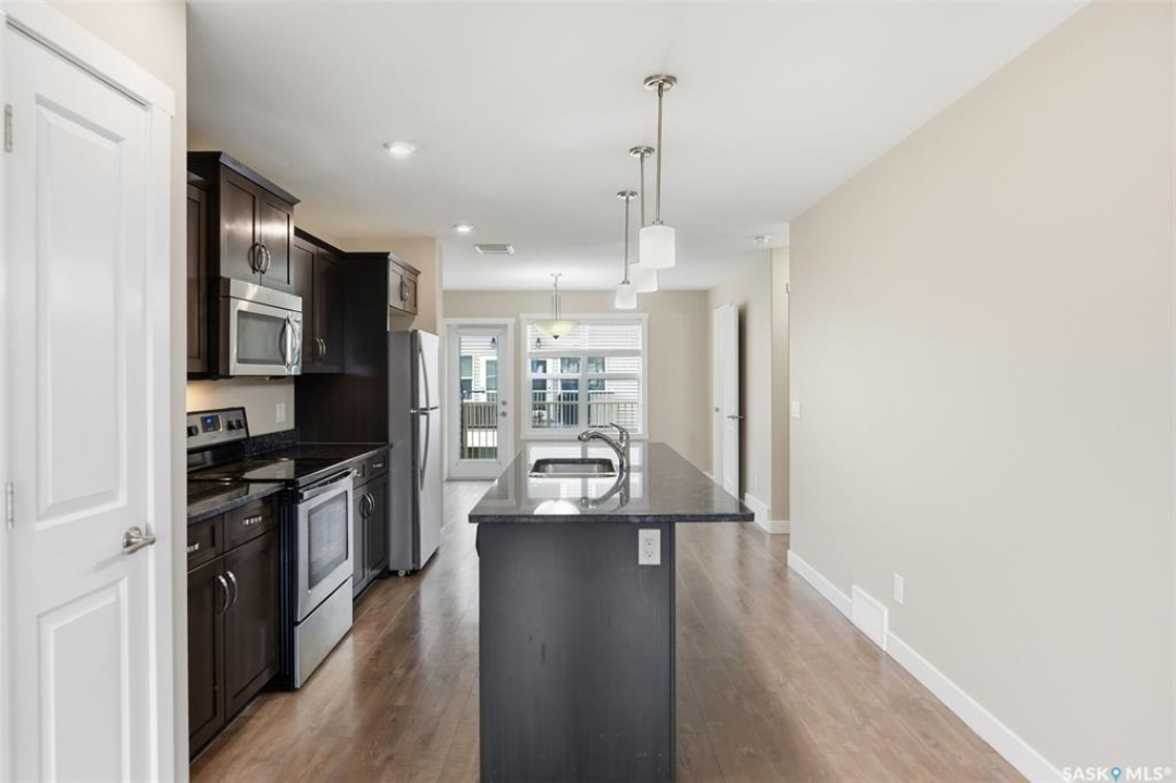 This townhouse in the Pinnacle complex offers a bright, open-concept main floor featuring laminate flooring and oversized windows providing lots of natural light. The central kitchen boasts stainless steel appliances, a large island with seating, and a walk-in pantry, all flowing seamlessly into the dining area with direct access to the back deck. A convenient powder room completes the main level. Upstairs, you'll find two generously sized bedrooms, each with its own ensuite bathroom and plenty of closet space. The upper floor also includes a dedicated laundry area with side-by-side washer and dryer for added convenience. The single tandem garage comfortably fits two vehicles and still provides room for storage or a workshop space. It also offers access to a covered back patio and the shared green space. Ideally located near parks, walking paths, schools, and all the amenities Stonebridge has to offer, this home is a must-see!