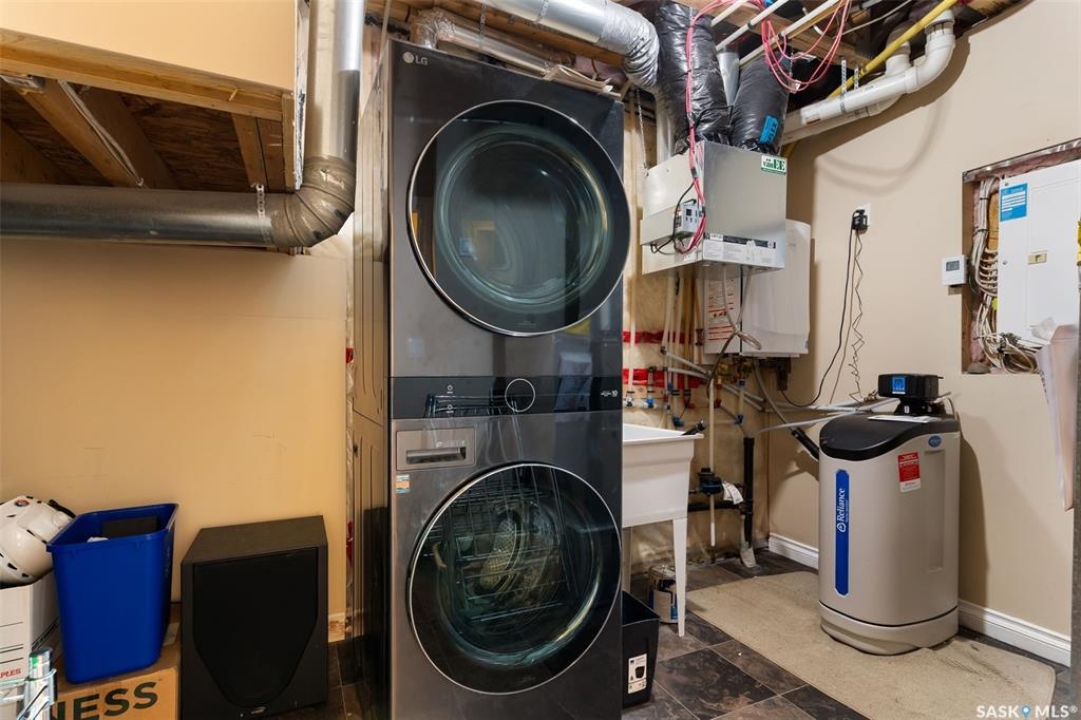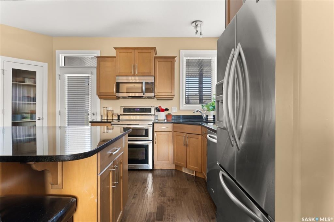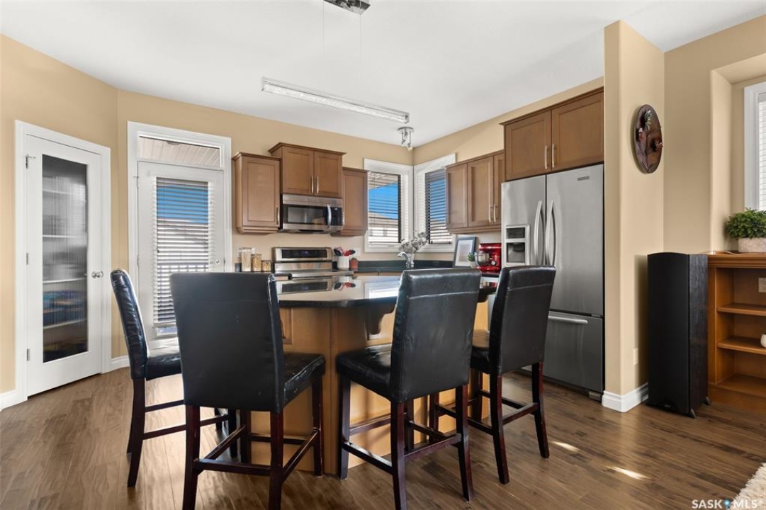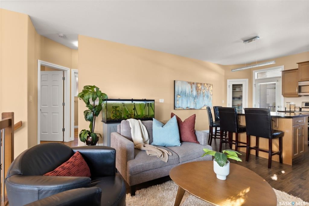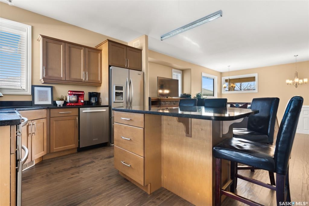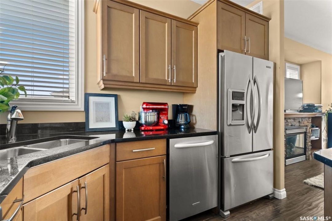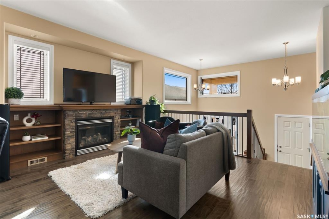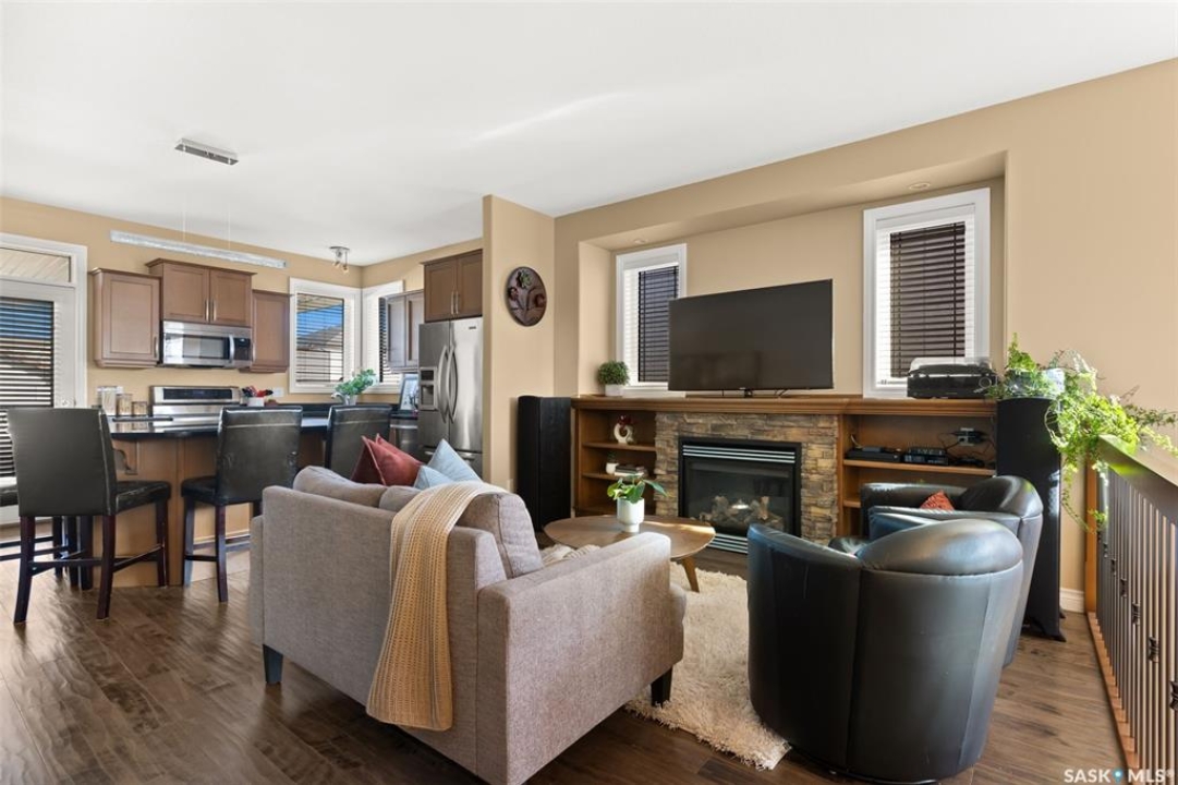Welcome to 5241 Aerial Crescent, a beautifully maintained bi-level home in the heart of desirable Harbour Landing. Built in 2012, this 1,011 sq ft home offers great curb appeal with its stucco exterior accented by brick and a double attached garage. Step inside to a bright and open-concept main floor featuring laminate flooring throughout the living room and kitchen. The spacious living room is highlighted by a cozy gas fireplace with built-in shelving. The kitchen is a chef's delight with stainless steel appliances including a double oven, sleek black granite countertops, a large island with seating, and a convenient corner pantry. From the kitchen, access the covered deck with gas hook-up, perfect for BBQ season! The yard is fully fenced and ready for kids, pets, and entertaining. The primary suite is generous in size and offers a walk-in closet and a 3-piece ensuite with a tiled walk-in shower. A second bedroom and a 4-piece main bath complete the main floor. Downstairs, large windows fill the space with natural light. The fully developed basement features a spacious family room wired with surround sound, two additional bedrooms, and a 3-piece bath. The home also includes thoughtful extras such as storage under the stairs, newer washer and dryer, high-efficiency furnace, on-demand hot water, and a water softener/HRV system (rented through Reliance Mackenzie). This is a move-in ready home in a great family-friendly neighbourhood close to parks, schools, and all amenities.