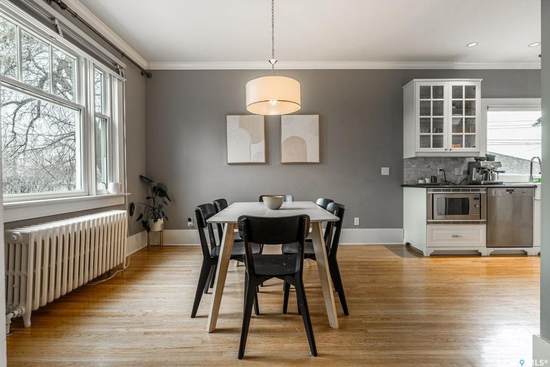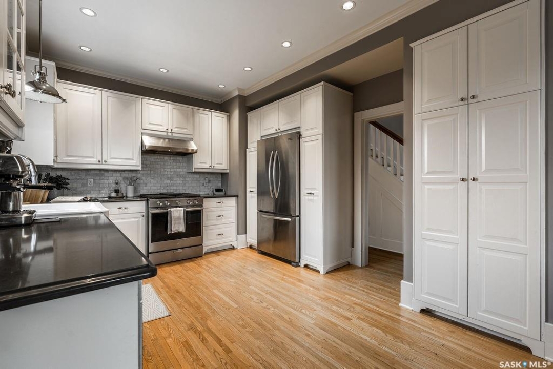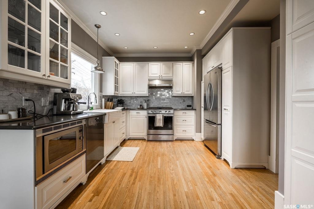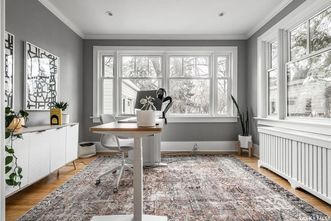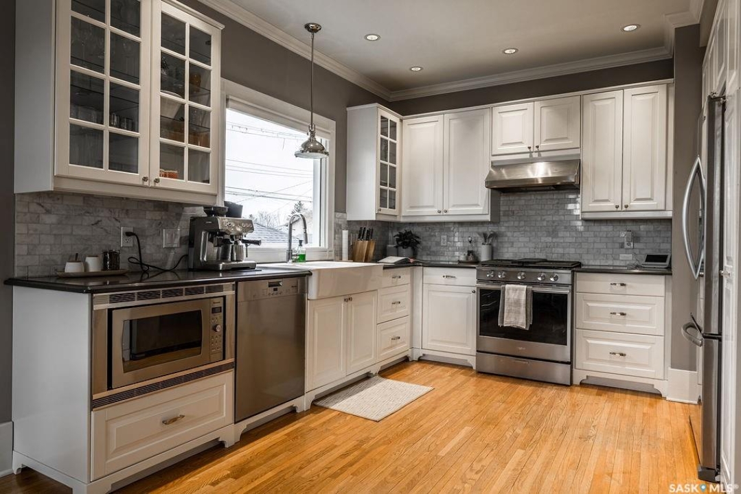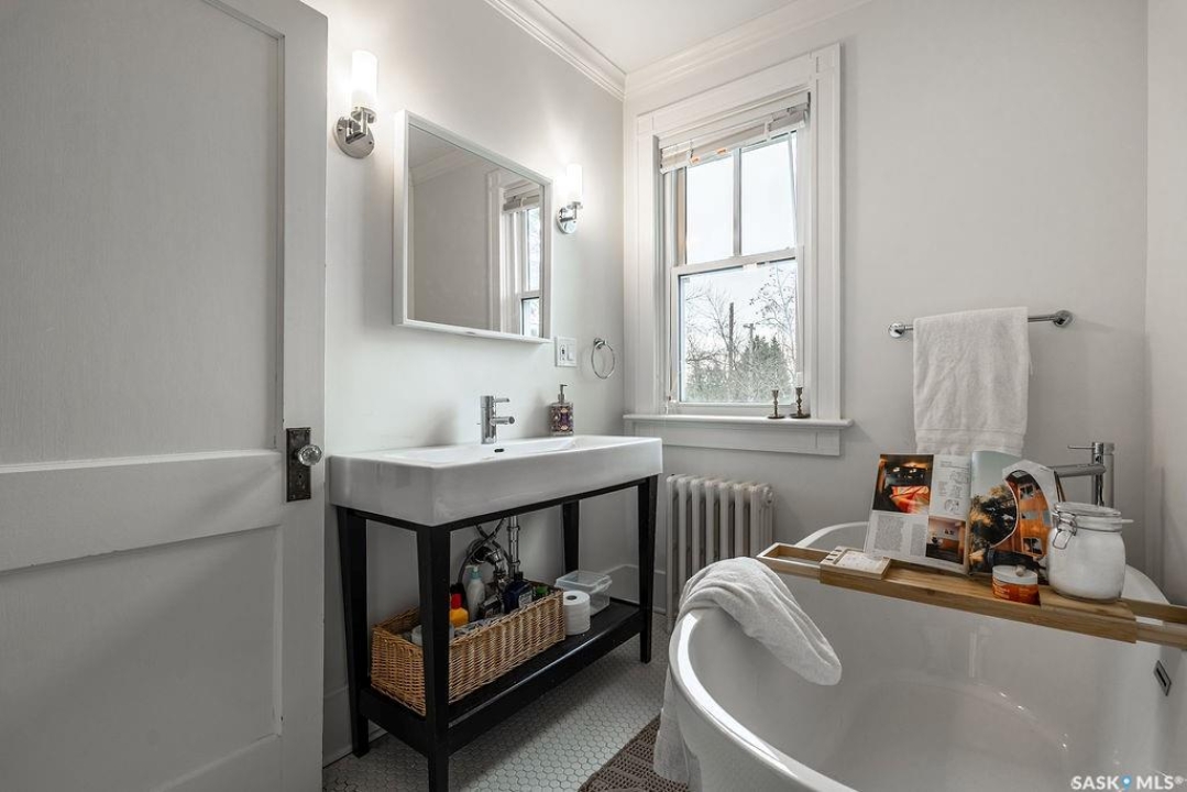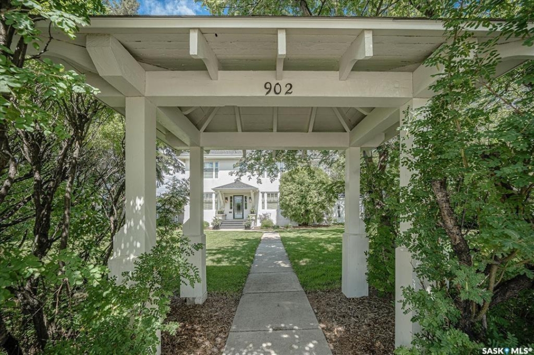 Like a private estate in the heart of the city, this beautifully updated 1,958 sqft two-storey captures your breathe from the moment you arrive. This huge lot has great street appeal with a 10ft hedge that surrounds the property. Step inside to a beautiful foyer that showcases the charming staircase. To the left of the foyer is a formal dining space and an updated modern kitchen with stainless steel appliances, gas range, built-in microwave and plenty of cabinetry. On the other side of the foyer there is a large living room with a wood burning fireplace, built-in cabinetry and two stained glass windows. A pair of french doors leads you into the bright sun-filled office. Upstairs, the primary bedroom features an electric fireplace and leads to a modern 3-pc ensuite with a walk-in tiled shower, and large walk-in closet. There are two more bedrooms and another 3-pc bathroom with a standalone soaker tub. Through one of the bedrooms is a bonus room with 2 walls of windows and tons of natural light, perfect for an office, another bedroom, sunroom or gym.. Downstairs, the fully finished basement has a spacious family room with an electric fireplace, another bedroom, a 3-pc bathroom, extra storage and a laundry room with a sink. The entire home has the perfect balance of original character details and modern updates. The yard leaves you wanting for nothing except more time outside with a firepit area, garden area, two large sheds, and tons of privacy. An oversized double detached garage with heated floors makes for easy convenience in the winters. There is also a long paved driveway perfect for RV parking. This private estate-style home is unique and impressive. Schedule your showing today!