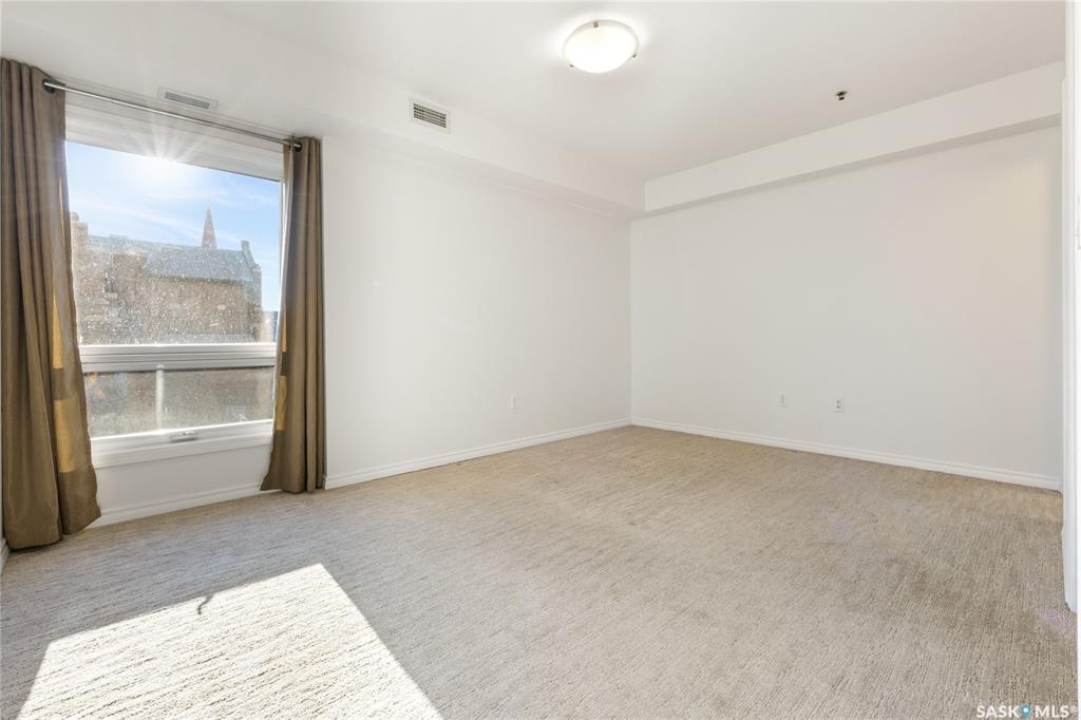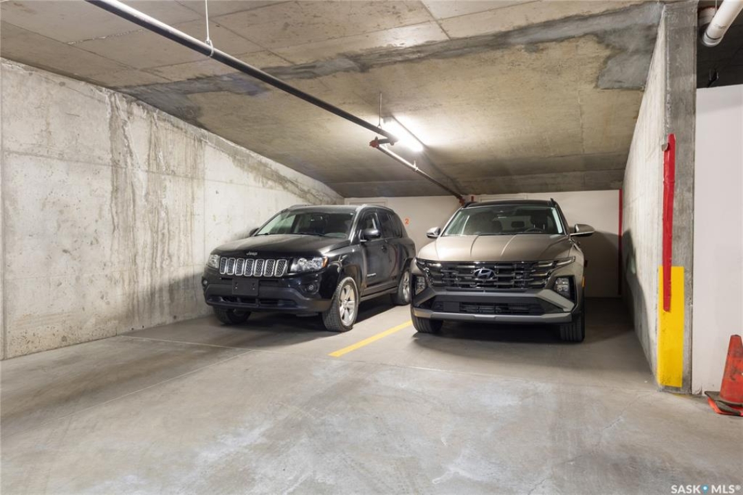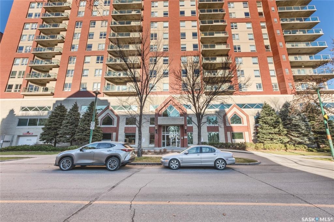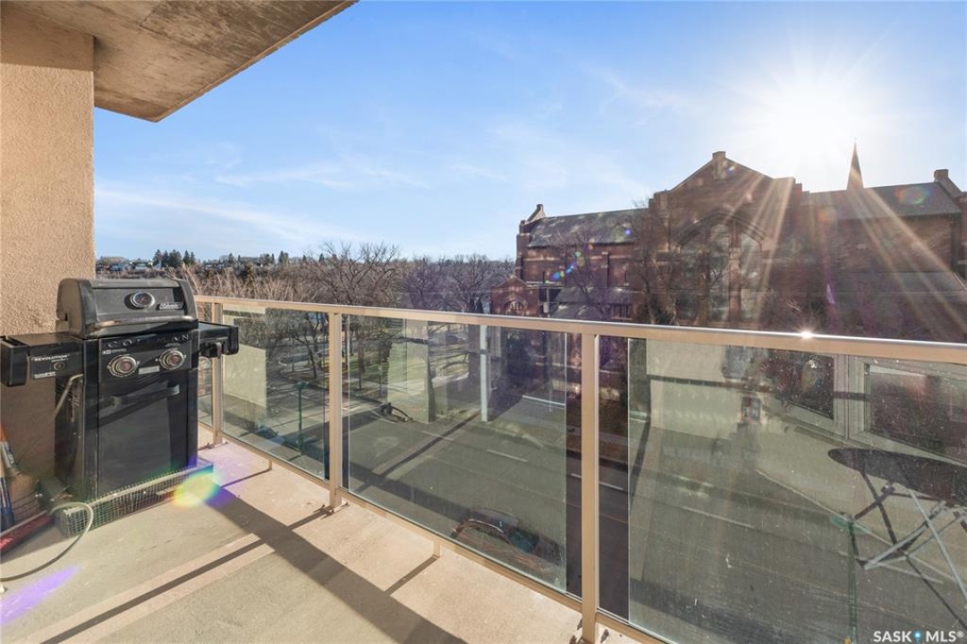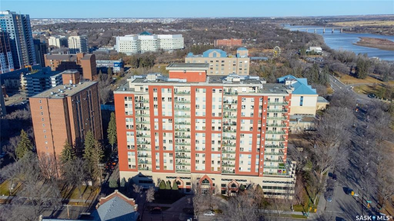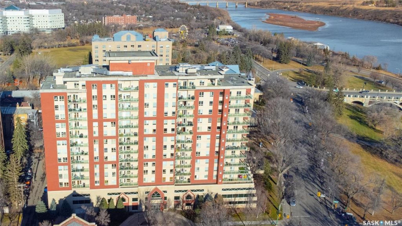 Welcome to Riverfront Living on Spadina Crescent! #402 is the perfect blend of comfort, style, and just enough personality to make you smile the moment you walk in. This south-facing, sun-loving condo is flooded with natural light—so much, in fact, you might find yourself retiring the lamps until winter. The bright, open layout features 2 spacious bedrooms and 2 full bathrooms, giving you plenty of room for guests, hobbies, or that treadmill you swear you'll start using. The large kitchen comes equipped with a functional peninsula (great for cooking, snacking, or contemplating life), and now features a brand-new backsplash that looks straight out of a design show. The unit has been freshly painted in a warm off-white tone—because your walls should be as fresh as your future start here—and the upgraded custom blinds let you control the sunshine like an absolute boss. Step outside onto your private deck and enjoy views of Knox United Church, Kiwanis Memorial Park, and even a bit of the South Saskatchewan River. It's the perfect spot to enjoy morning coffee, evening wine, or quietly judge joggers for being more active than you. Practical perks include Individually controlled central air and furnace (your thermostat, your rules) and Updated blinds. Option for a second heated underground parking stall—because you can never have too many parking spots in Saskatchewan winters. You're also on the same floor as two guest suites, a recreation/amenities room, and an exercise room with washrooms, making hosting visitors or starting fitness habits extremely convenient. Each floor also includes easy garbage access, so taking out the trash feels less like a chore and more like a quick stroll. The Riverfront complex is known for its excellent security—from the front entrance to the parkade—giving you peace of mind so you can focus on enjoying the river valley lifestyle. Bright, stylish, secure, and a little bit witty—Unit #402 might just be the best decision you make this year.