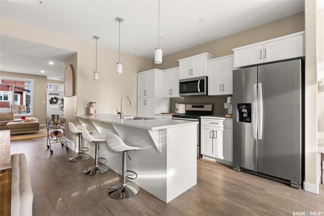 Welcome to 4233 E Keller Avenue, a beautifully designed freehold townhome with no condo fees located in The Towns. This property offers incredible value, modern finishes, and the ease of move-in-ready living. The exterior features contemporary curb appeal with low-maintenance siding and eye-catching stone accents. Step inside to a spacious front foyer with a double closet for convenient storage. The main floor boasts an airy, open-concept layout finished with 9 ft ceilings and luxury vinyl plank flooring. A large picture window brightens the living room, which flows seamlessly into the dining area overlooking the fully fenced backyard. The stylish kitchen is equipped with crisp white cabinetry, a generous sit-up island, quartz countertops, a double sink, accent lighting, and a full stainless steel appliance package. A 2-piece powder room, mudroom and access to the backyard complete the main level. Upstairs, plush carpet leads you to a cozy loft—perfect for a home office or reading nook. The primary bedroom offers plenty of space, complete with a walk-in closet and a 4-piece ensuite featuring a deep soaker tub and quartz-topped vanity. Two additional bedrooms, a second 4-piece bath, and convenient second-floor laundry complete this floor. The basement is framed and insulated along exterior walls, includes a rough-in for a future bathroom, and offers excellent storage or development potential. Outside, the fully fenced PVC yard includes a gate leading to the double parking pad with laneway access—making a future garage a great option. Added features include central air, owned water softener (2019) and new water heater (2025). Move in and enjoy!