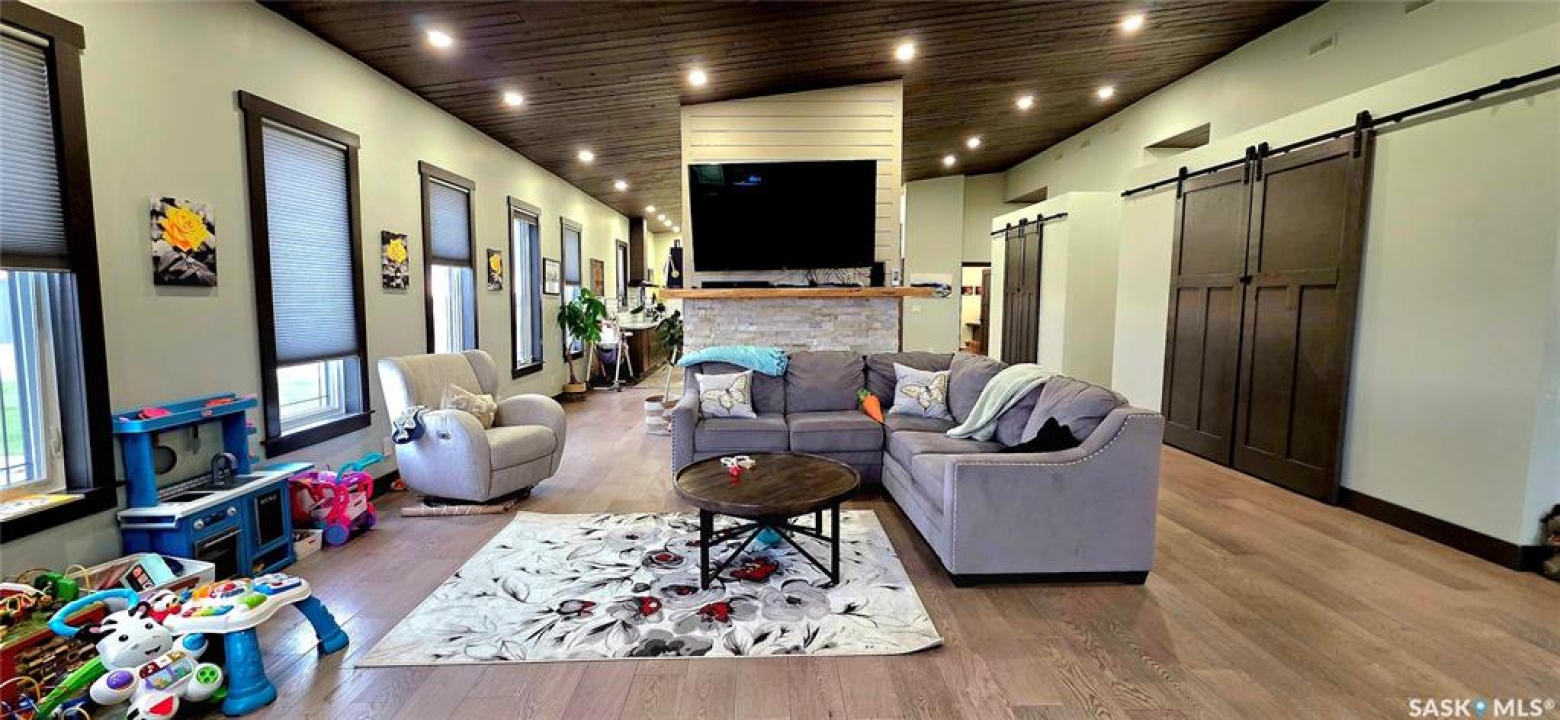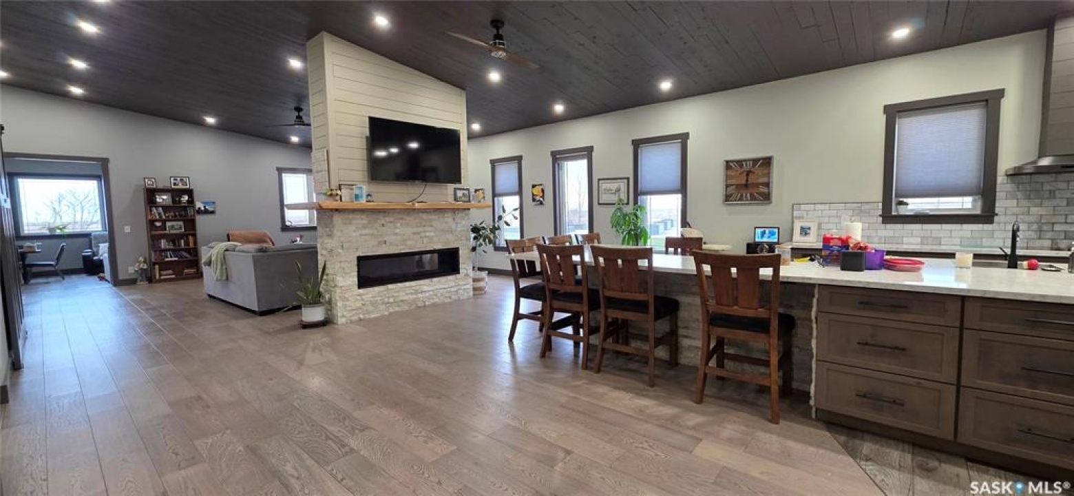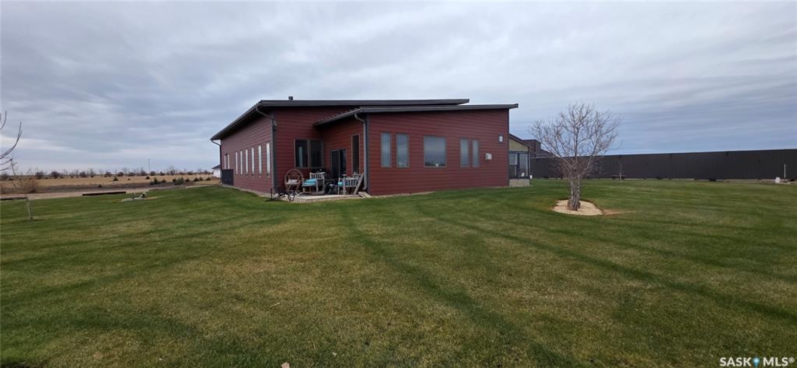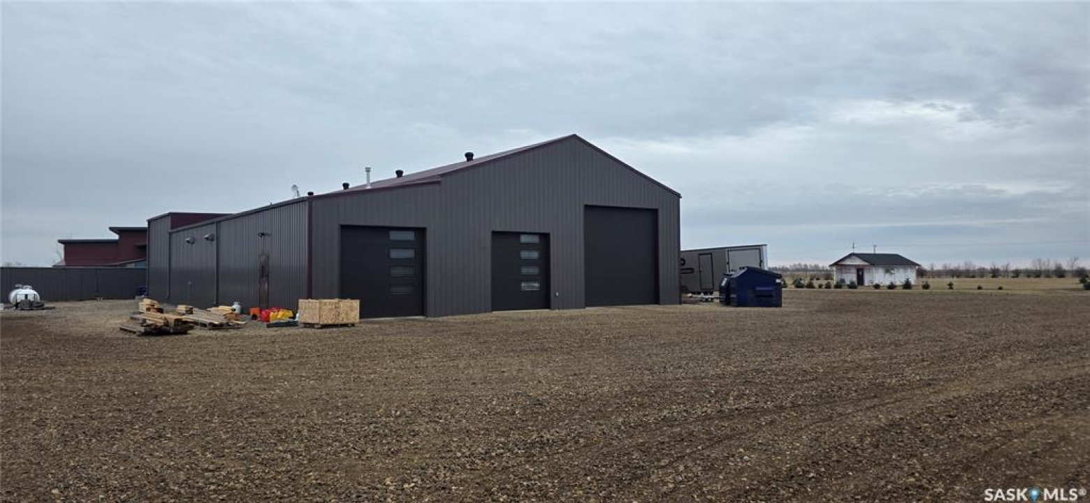 One-of-a-kind acreage located just 15 minutes from Estevan. Situated on 5 acres This 4,800 sq. ft. home offers two separate living quarters, ideal for multi-generational living, large families, or guest accommodation. The property features a total of 6 bedrooms, 4 bathrooms, and dedicated office space. Both primary bedrooms include stunning full en suite baths finished with beautiful tile flooring and tiled shower/tub accents. Interior finishes include engineered hardwood throughout the main living areas and tile in kitchens and bathrooms, stylish lighting, and wood moldings. The home is equipped with in-floor heat, high vaulted ceilings, and large windows throughout that provide excellent natural light. Each living room offers a fireplace, including one double-sided model open to a massive chef's kitchen. Additional living spaces include a cool bar/games room surrounded by windows, this space is perfect for entertaining or watching the game. Additionally there is a closed-in hot tub room overlooking the beautiful yard. The attached heated shop totals approximately 5,500 sq. ft. and is currently divided into three separate shop spaces, each with overhead door access—ideal for personal or commercial use. The shop space adjacent to the home (2200 sq ft) has an additional bathroom with laundry hookups, perfect for washing up, and a commercial grade exhaust fan so you can use your smoker year round out of the elements! The 5-acre yard site is fully manicured and serviced by multiple sprinkler zones supplied by the well. Automatic watering can be programmed from your phone for the lawn, trees, garden, raised beds, and flower areas. A detached outbuilding with concrete floor and tin siding is currently used as a chicken coop but is easily adaptable for various uses. This acreage offers exceptional space, functionality, and potential for residential or commercial needs. Must be seen to be appreciated!