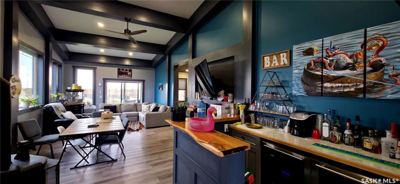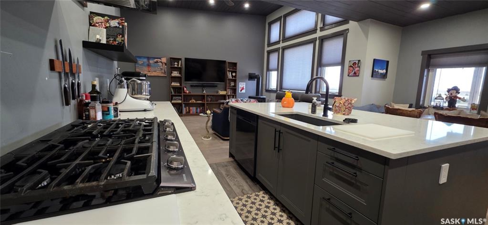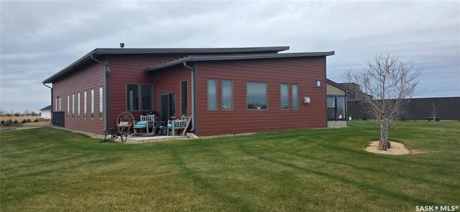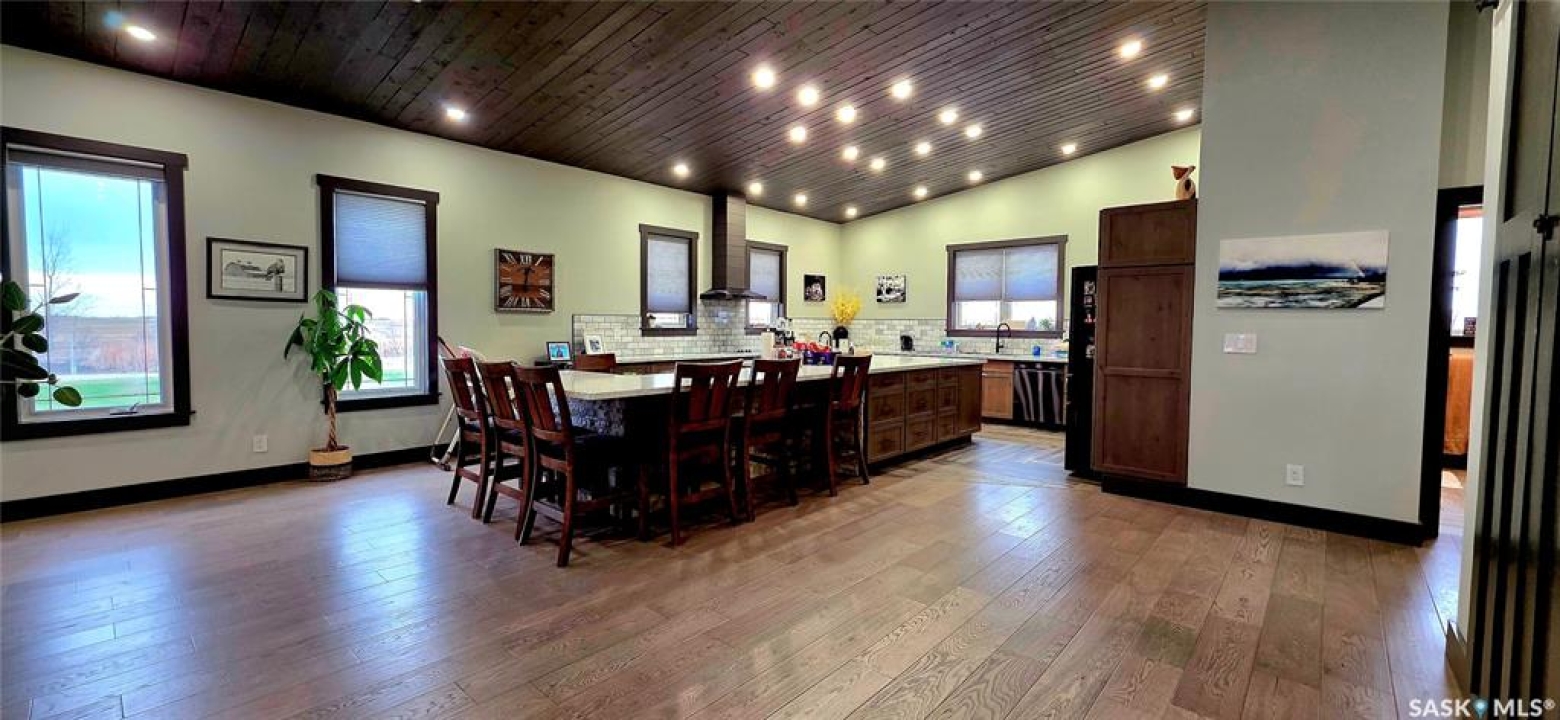 One-of-a-kind acreage located just 15 minutes from Estevan. Situated on 5 acres This 4,800 sq. ft. home offers two separate living quarters, ideal for multi-generational living, large families, or guest accommodation. The property features a total of 6 bedrooms, 4 bathrooms, and dedicated office space. Both primary bedrooms include stunning full en suite baths finished with beautiful tile flooring and tiled shower/tub accents. Interior finishes include engineered hardwood throughout the main living areas and tile in kitchens and bathrooms, stylish lighting, and wood moldings. The home is equipped with in-floor heat, high vaulted ceilings, and large windows throughout that provide excellent natural light. Each living room offers a fireplace, including one double-sided model open to a massive chef's kitchen. Additional living spaces include a cool bar/games room surrounded by windows, this space is perfect for entertaining or watching the game. Additionally there is a closed-in hot tub room overlooking the beautiful yard. The attached heated shop totals approximately 5,500 sq. ft. and is currently divided into three separate shop spaces, each with overhead door access—ideal for personal or commercial use. The shop space adjacent to the home (2200 sq ft) has an additional bathroom with laundry hookups, perfect for washing up, and a commercial grade exhaust fan so you can use your smoker year round out of the elements! The 5-acre yard site is fully manicured and serviced by multiple sprinkler zones supplied by the well. Automatic watering can be programmed from your phone for the lawn, trees, garden, raised beds, and flower areas. A detached outbuilding with concrete floor and tin siding is currently used as a chicken coop but is easily adaptable for various uses. This acreage offers exceptional space, functionality, and potential for residential or commercial needs. Must be seen to be appreciated!
