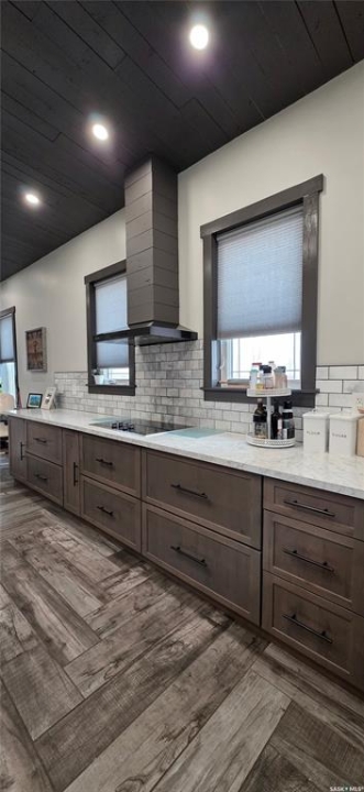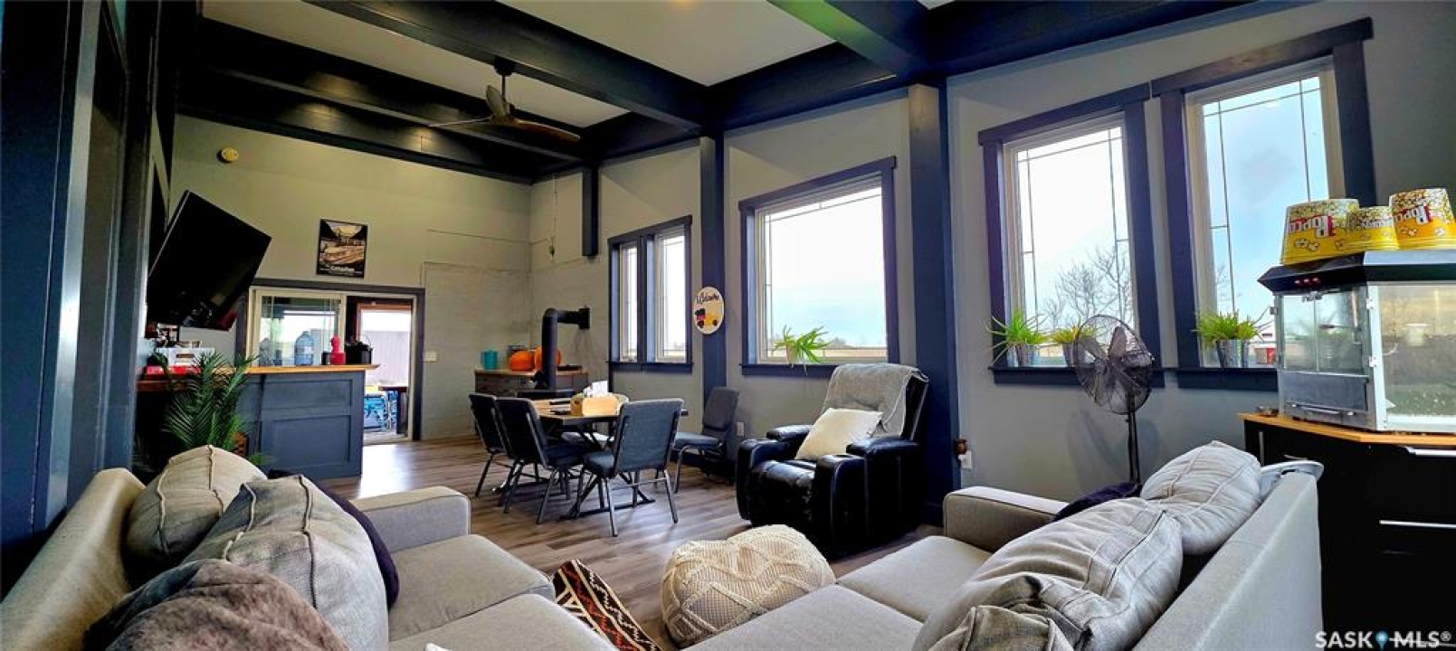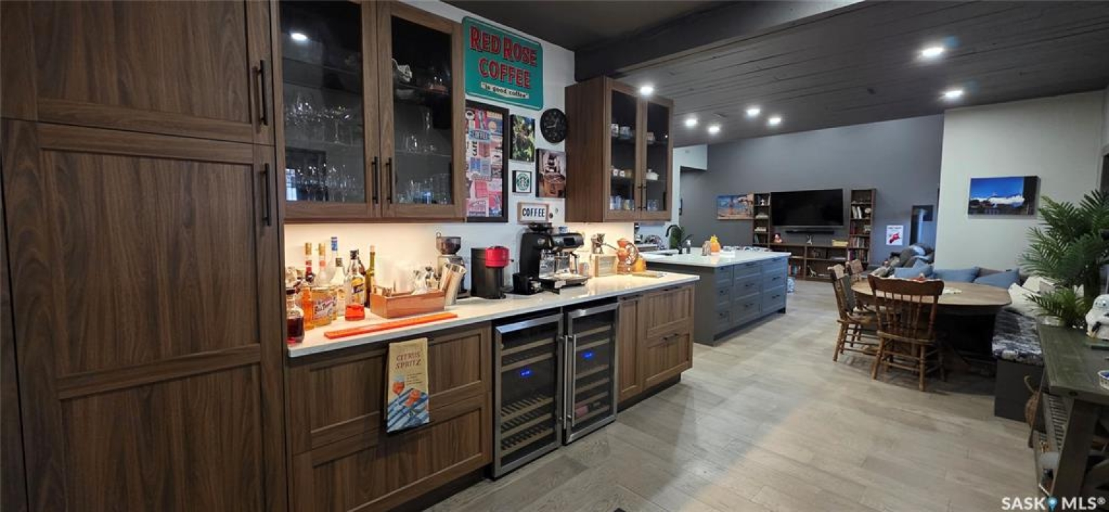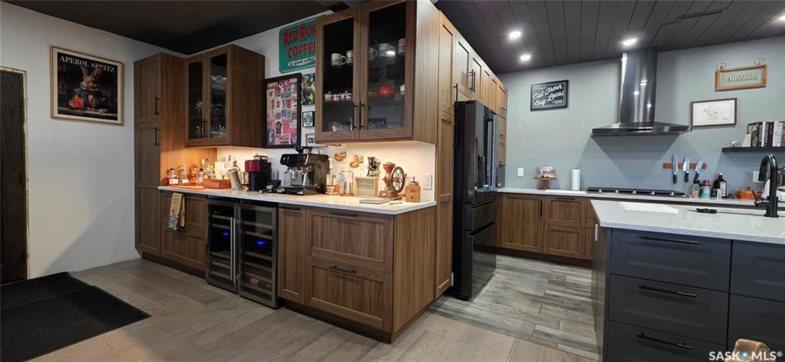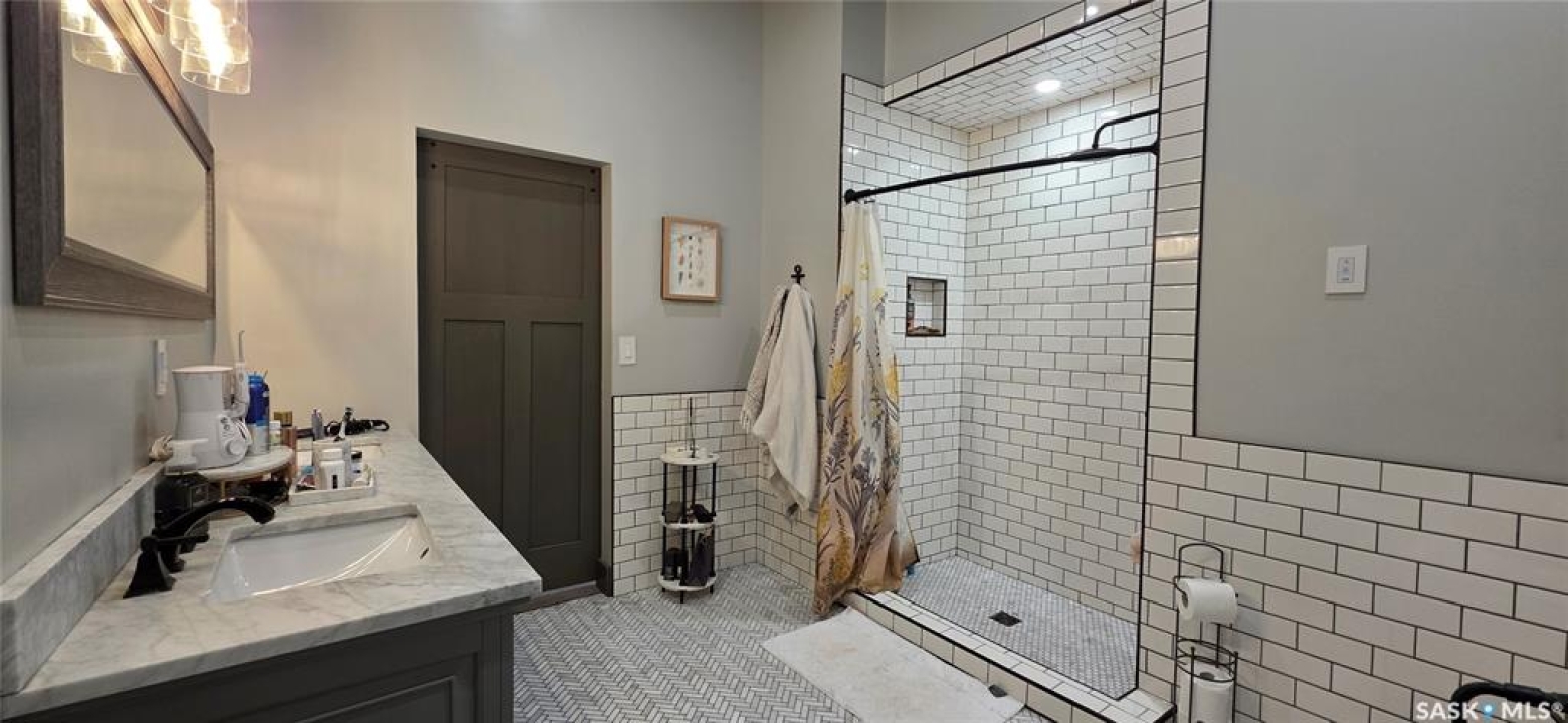 One-of-a-kind acreage located just 15 minutes from Estevan. Situated on 5 acres This 4,800 sq. ft. home offers two separate living quarters, ideal for multi-generational living, large families, or guest accommodation. The property features a total of 6 bedrooms, 4 bathrooms, and dedicated office space. Both primary bedrooms include stunning full en suite baths finished with beautiful tile flooring and tiled shower/tub accents. Interior finishes include engineered hardwood throughout the main living areas and tile in kitchens and bathrooms, stylish lighting, and wood moldings. The home is equipped with in-floor heat, high vaulted ceilings, and large windows throughout that provide excellent natural light. Each living room offers a fireplace, including one double-sided model open to a massive chef's kitchen. Additional living spaces include a cool bar/games room surrounded by windows, this space is perfect for entertaining or watching the game. Additionally there is a closed-in hot tub room overlooking the beautiful yard. The attached heated shop totals approximately 5,500 sq. ft. and is currently divided into three separate shop spaces, each with overhead door access—ideal for personal or commercial use. The shop space adjacent to the home (2200 sq ft) has an additional bathroom with laundry hookups, perfect for washing up, and a commercial grade exhaust fan so you can use your smoker year round out of the elements! The 5-acre yard site is fully manicured and serviced by multiple sprinkler zones supplied by the well. Automatic watering can be programmed from your phone for the lawn, trees, garden, raised beds, and flower areas. A detached outbuilding with concrete floor and tin siding is currently used as a chicken coop but is easily adaptable for various uses. This acreage offers exceptional space, functionality, and potential for residential or commercial needs. Must be seen to be appreciated!