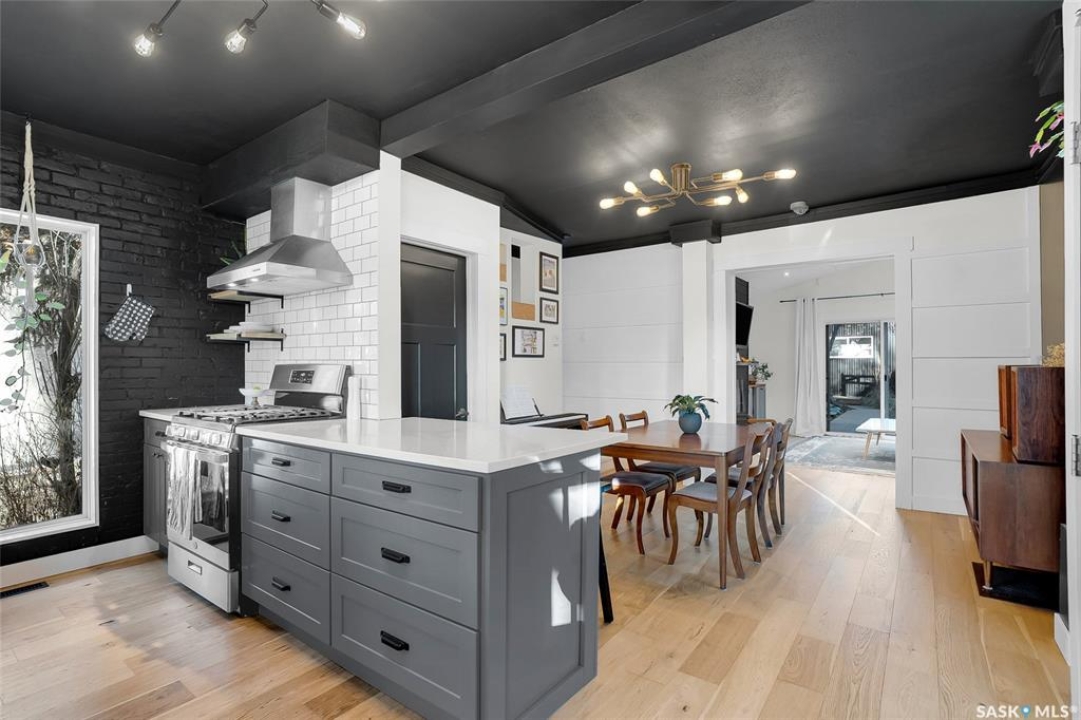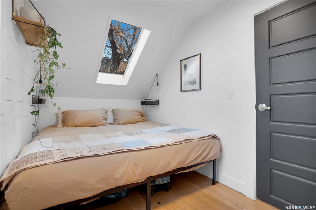 Welcome to this charming one-and-a-half-storey home in Caswell Hill. Start your day with coffee on the sunny, south-facing front porch. The renovated kitchen boasts quartz countertops, stainless steel appliances including a gas range, hood fan, and fridge with water/ice dispenser, plus an eat-up peninsula and brick feature wall. Gorgeous engineered hardwood floors flows from the dining room into the bright living room with its vaulted ceiling, fireplace, and sliding patio door to the yard. The main floor also features a unique 3-piece bathroom with copper penny flooring and backsplash, as well as side entry and laundry. Upstairs, you'll find two cozy bedrooms with brand-new skylights and another stylish 3-piece bathroom, with a slight view of the Bessborough Hotel from one bedroom window. Extras include a front concrete driveway, quality windows, updated doors, koi pond, new fence and deck, garden boxes, firepit, and gazebo for summer evenings. A spacious 24 x 24 garage is ready for your finishing touches, perfect for cars and storage. This little gem is not to be missed!
