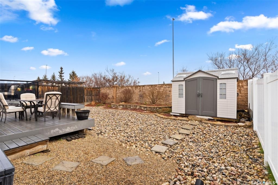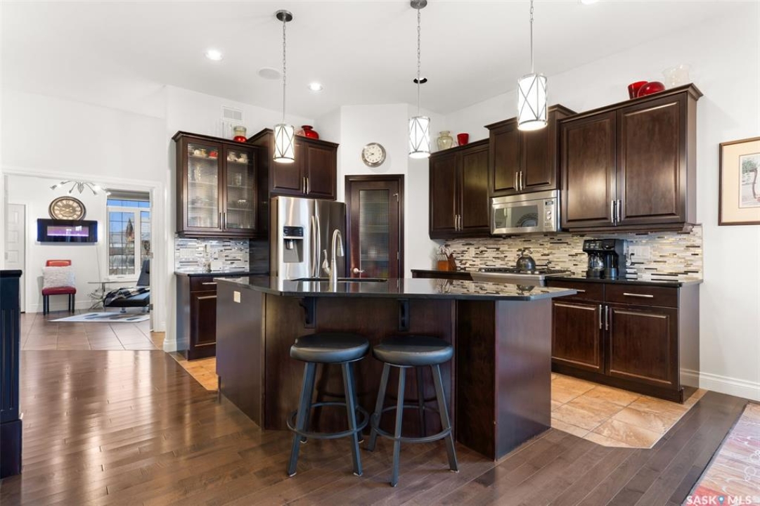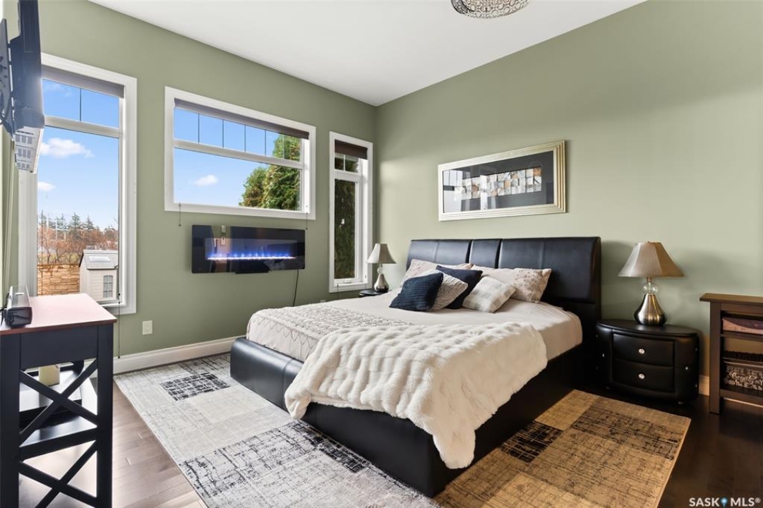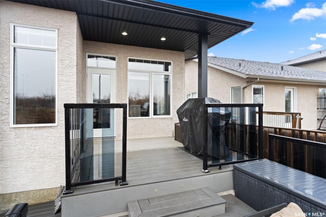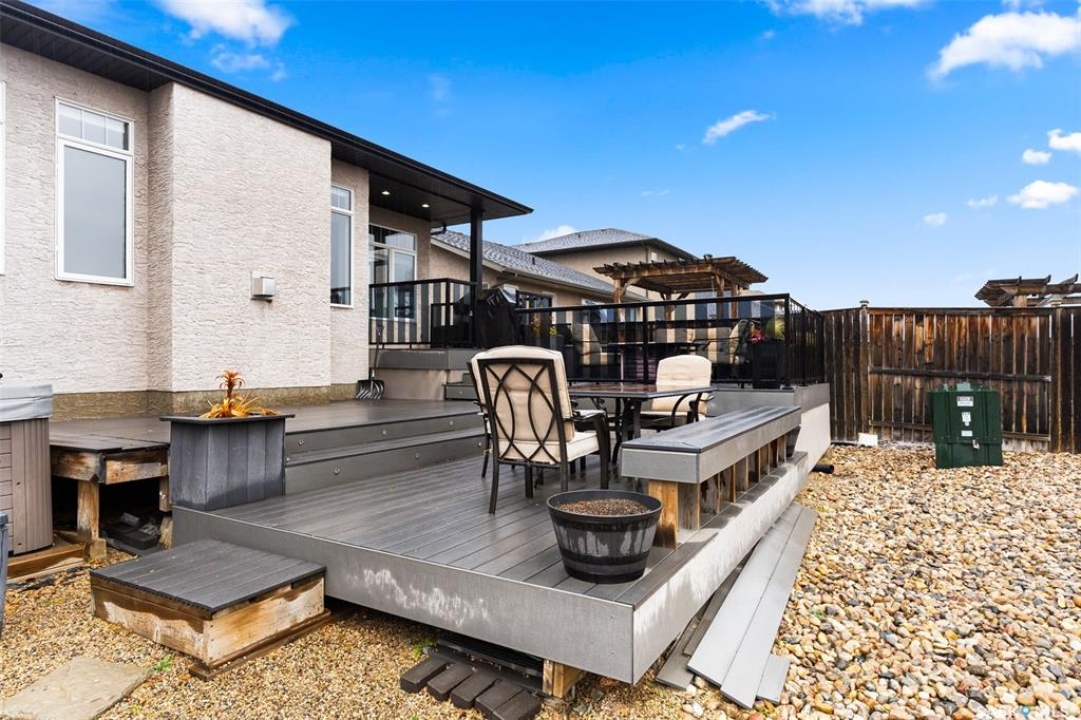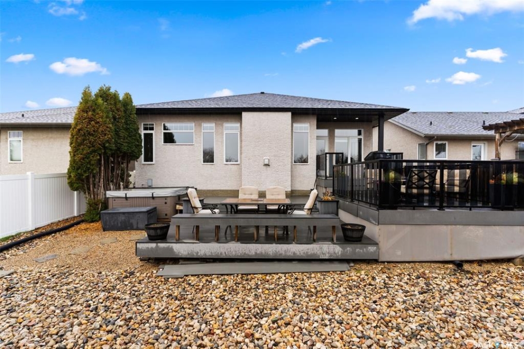 Built in 2011 on one of Harbour Landing's original crescents, this executive bungalow offers 1,700 sq. ft. on the main floor & over 3,400 sq. ft. of finished living space, including 6 bedrooms & 3 bathrooms. Designed for elegance and practicality, it suits families, multi-generational living, or those needing work-from-home flexibility. A spacious tiled foyer with 10' ceilings and built-in surround sound leads to a bright front office/bedroom with fireplace, large windows, a sink, ideal for a studio or salon. A 2nd bedroom and full bath sit privately down the hall. The main-floor laundry room offers ample storage & access to the double attached garage. Hardwood and ceramic tile span the main living areas. The open-concept kitchen, dining, and living room form the heart of the home, featuring quartz countertops, a large island, extensive cabinetry, a corner pantry & stainless steel appliances with a gas stove. The dining area opens to the backyard, while the living room includes a stone-surround gas fireplace. The primary suite provides a peaceful retreat with an electric fireplace, Smart TV, walk-in closet & a luxurious ensuite with double sinks, jetted tub & walk-in shower. The private, low-maintenance backyard has no rear neighbours and includes four composite decks, hot tub, raised perennial beds with drip irrigation & a garden shed. The lower level offers 8-ft ceilings, large windows, laminate flooring & an open layout with a library/games area, family room with projection screen, and a well-equipped wet bar with full fridge/freezer. Three generous bedrooms—two with walk-in closets—and a full bath with double sinks complete the space. Built on thirty-one 12" diameter piles, the home provides exceptional stability, along with an owned on-demand water heater, water filtration and softening systems, underground sprinklers, and drip irrigation. This home delivers space, privacy, and versatility in one of Harbour Landing's most desirable locations.