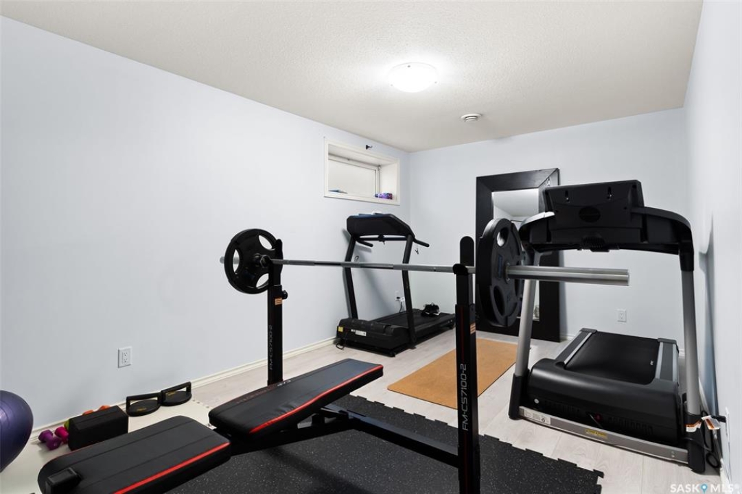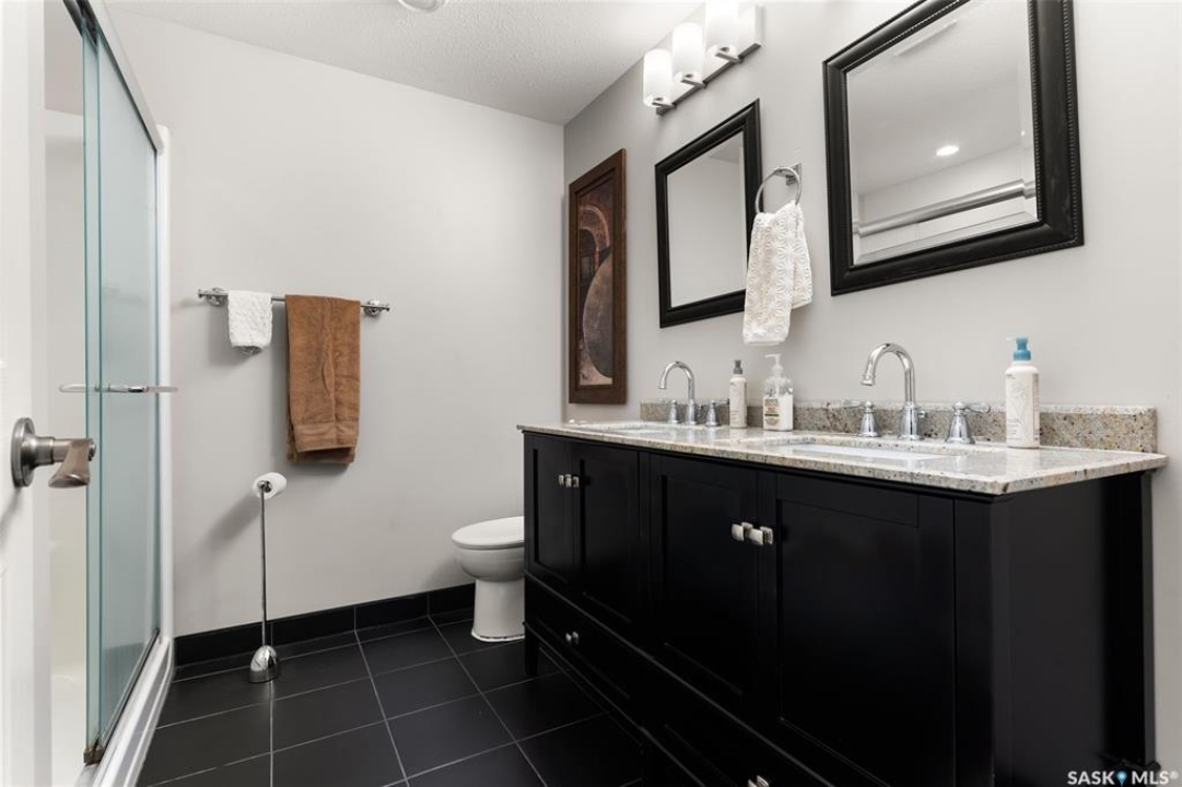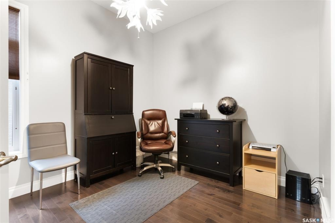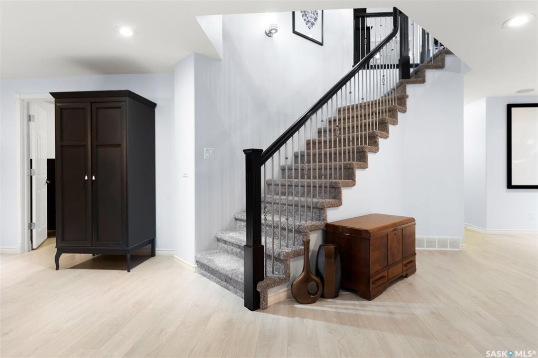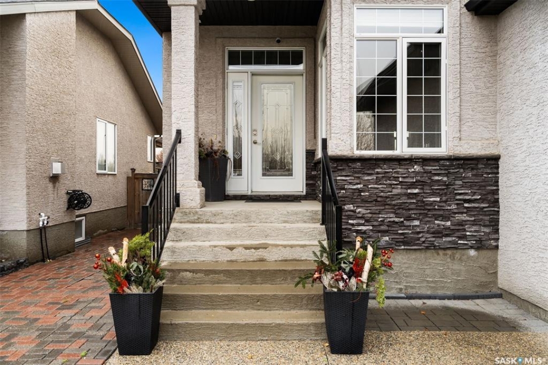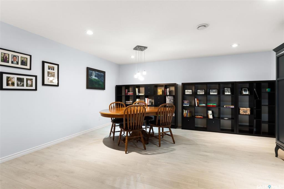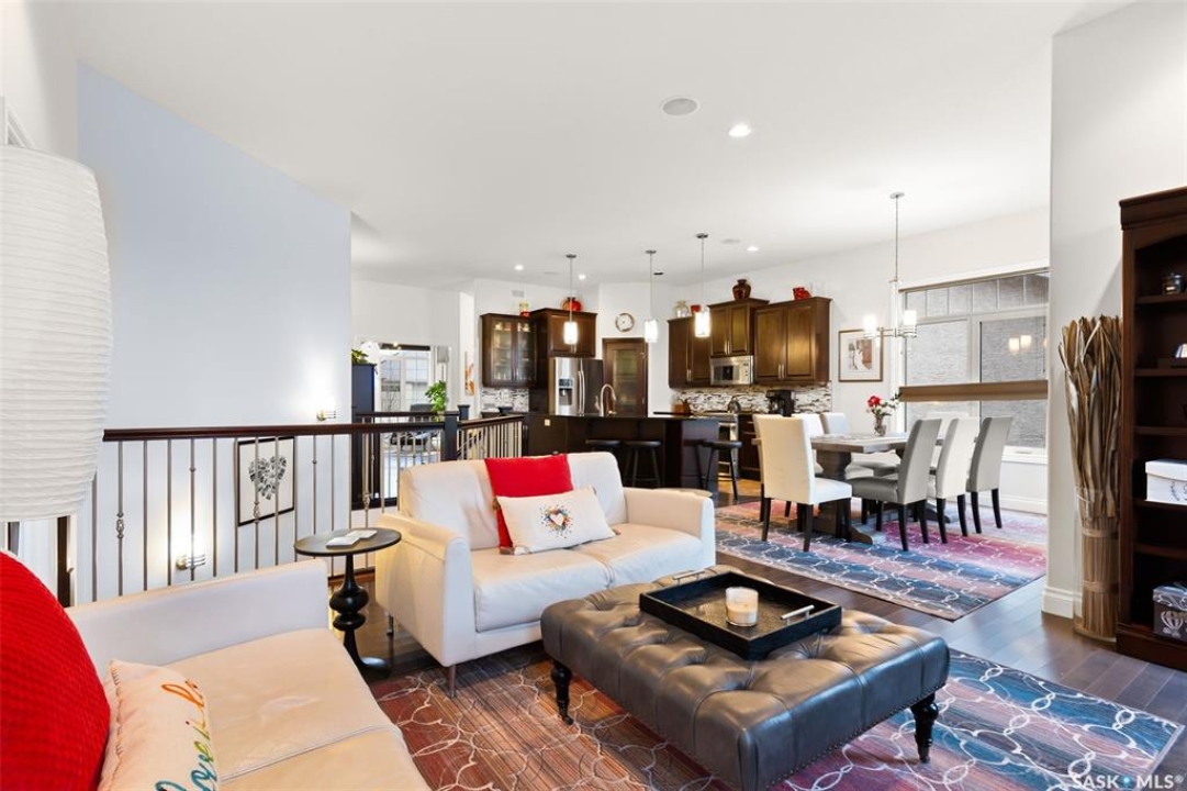 Built in 2011 on one of Harbour Landing's original crescents, this executive bungalow offers 1,700 sq. ft. on the main floor & over 3,400 sq. ft. of finished living space, including 6 bedrooms & 3 bathrooms. Designed for elegance and practicality, it suits families, multi-generational living, or those needing work-from-home flexibility. A spacious tiled foyer with 10' ceilings and built-in surround sound leads to a bright front office/bedroom with fireplace, large windows, a sink, ideal for a studio or salon. A 2nd bedroom and full bath sit privately down the hall. The main-floor laundry room offers ample storage & access to the double attached garage. Hardwood and ceramic tile span the main living areas. The open-concept kitchen, dining, and living room form the heart of the home, featuring quartz countertops, a large island, extensive cabinetry, a corner pantry & stainless steel appliances with a gas stove. The dining area opens to the backyard, while the living room includes a stone-surround gas fireplace. The primary suite provides a peaceful retreat with an electric fireplace, Smart TV, walk-in closet & a luxurious ensuite with double sinks, jetted tub & walk-in shower. The private, low-maintenance backyard has no rear neighbours and includes four composite decks, hot tub, raised perennial beds with drip irrigation & a garden shed. The lower level offers 8-ft ceilings, large windows, laminate flooring & an open layout with a library/games area, family room with projection screen, and a well-equipped wet bar with full fridge/freezer. Three generous bedrooms—two with walk-in closets—and a full bath with double sinks complete the space. Built on thirty-one 12" diameter piles, the home provides exceptional stability, along with an owned on-demand water heater, water filtration and softening systems, underground sprinklers, and drip irrigation. This home delivers space, privacy, and versatility in one of Harbour Landing's most desirable locations.