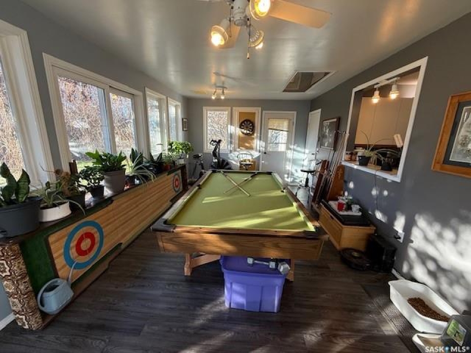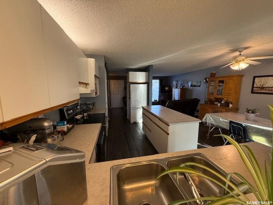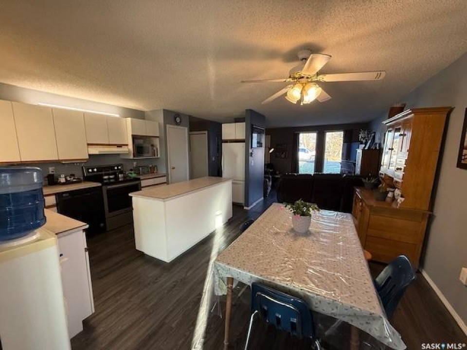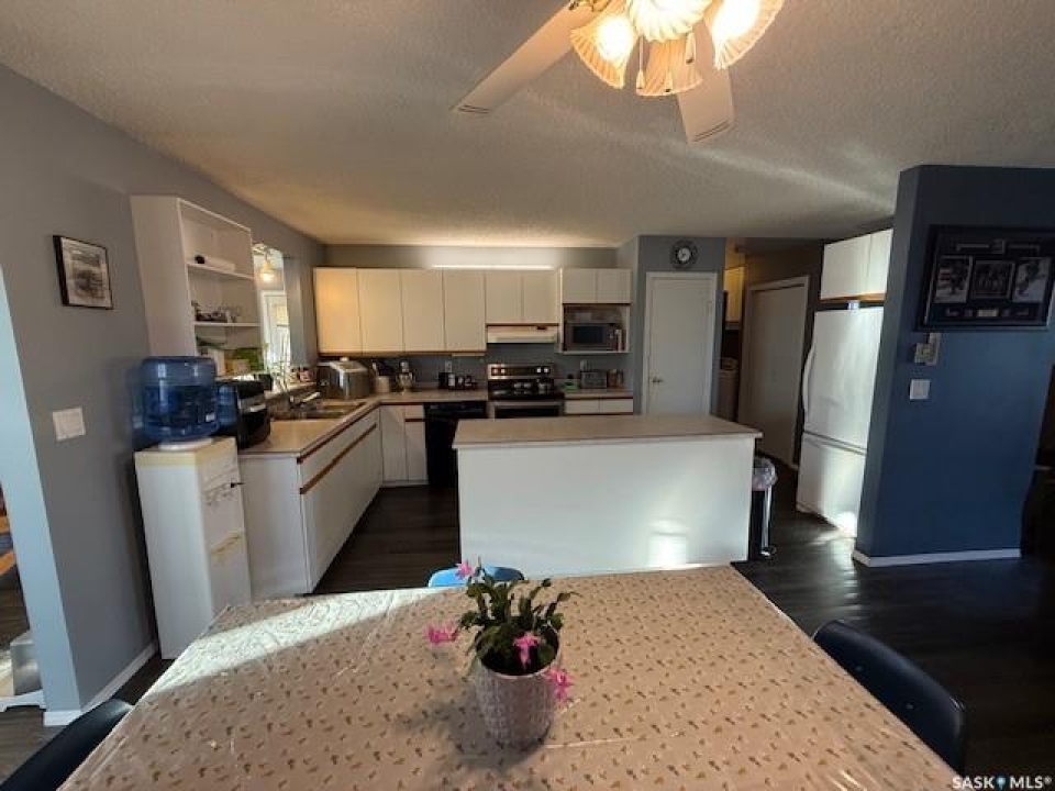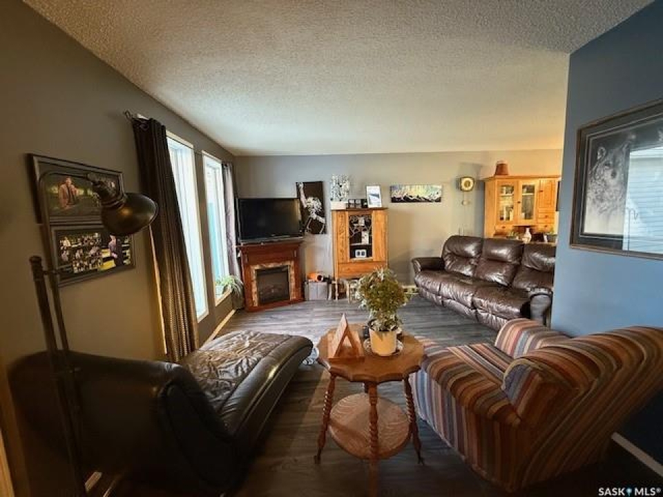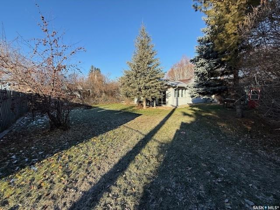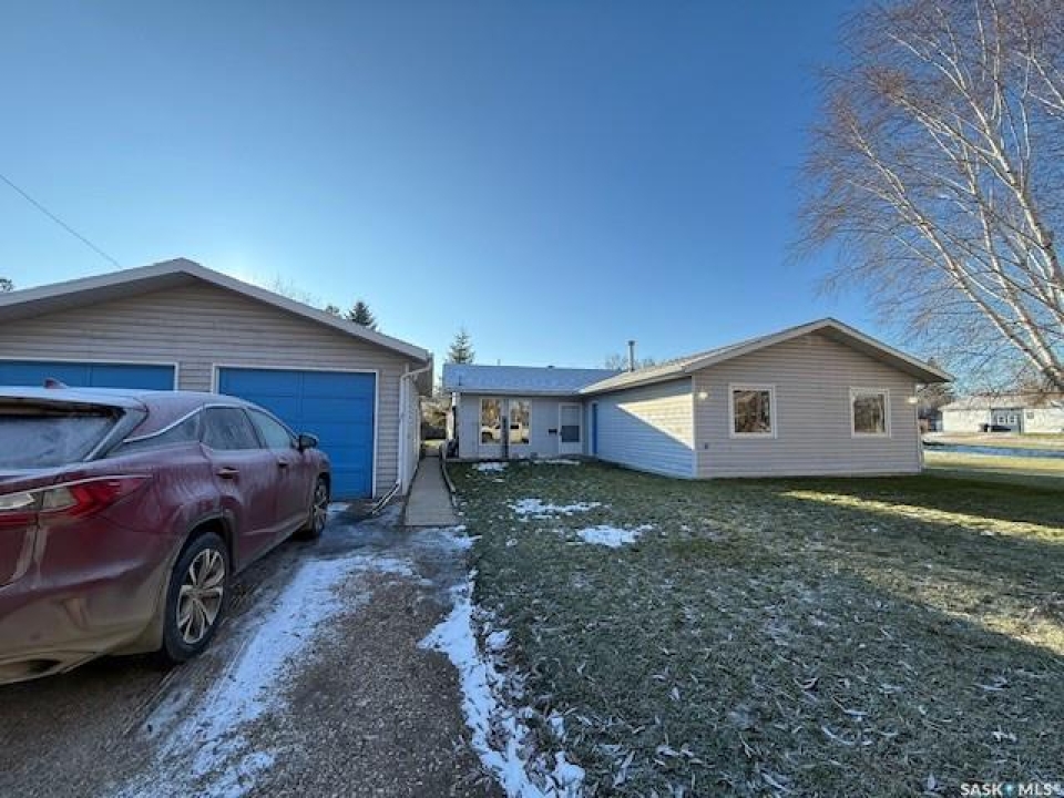 Welcome home to this spacious 1,880 sq ft bungalow nestled in a quiet, small community on a generous lot and a half. Built in 1996 and thoughtfully updated, this inviting residence features heated slab on grade floors for year-round comfort, five bedrooms (one currently set up as an office), and two bathrooms—including a 4-piece main bath and a 3-piece ensuite that connects seamlessly to an expansive recreation room. The heart of the home is a bright, open-concept kitchen, dining, and living area, boasting a large island, abundant cabinetry, a large pantry, and plenty of space for family gatherings. The sunlit rec room is surrounded by windows and opens through patio doors to the fully fenced backyard—perfect for entertaining with its patio area, fire pit, pergola, garden shed, and convenient back-alley access. A heated, detached two-car garage (built in 1990) with a gas furnace offers ample parking and workspace. Enjoy peace of mind with upgrades such as new flooring (2019), front and office windows (2025), hot water tank (2017), and shingles (2021). The original attached garage was cleverly converted to living space in 2007, enhancing the family space. Additional highlights include main floor laundry, gas boiler heat, 100-amp electrical service, and generous closet storage in every room. Ideal for families or those seeking accessible, ground-floor living with no stairs, this property combines comfort, space, and versatility in a welcoming community setting.