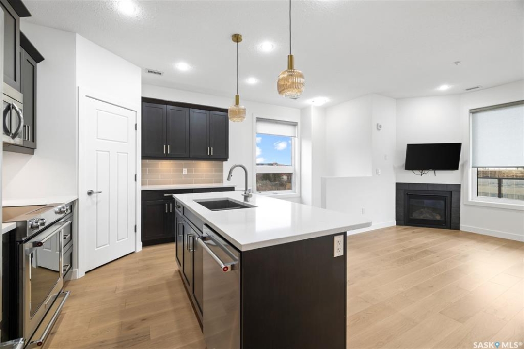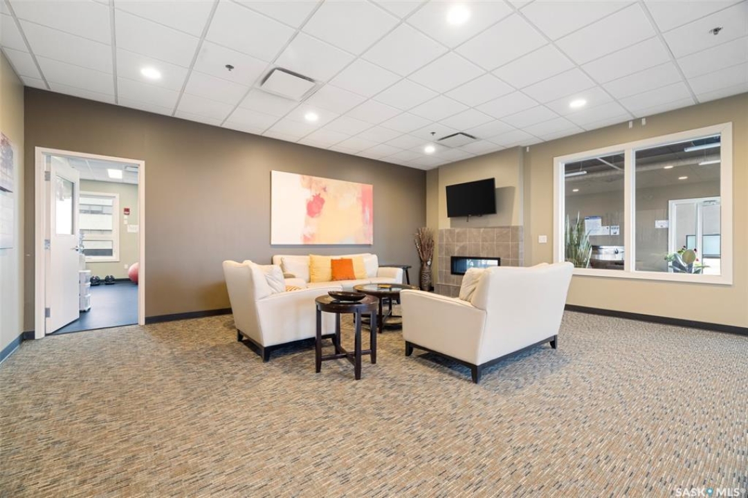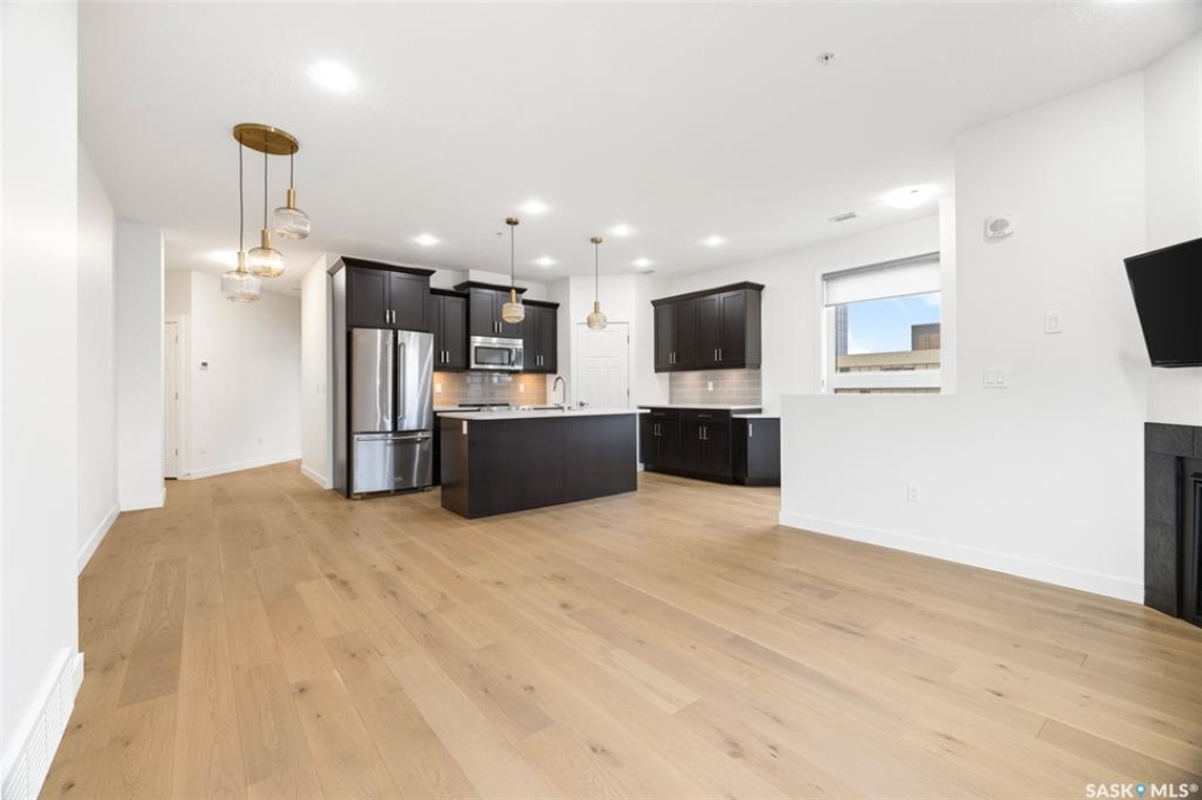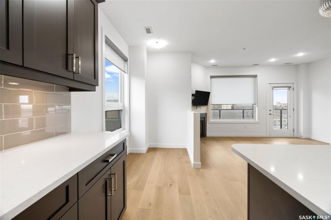 Welcome to The Gardens on Rose, where luxury meets convenience in the heart of downtown. This beautifully renovated 2-bedroom, 2-bathroom condo sits on the 6th floor with impressive city skyline views and a bright, open-concept layout. A major renovation completed in September 2025 brings a fresh, modern feel throughout the home. Updates include engineered hardwood flooring, plush carpet in the bedrooms, new paint and baseboards, countertop adjustments, new stainless-steel stove and dishwasher with fridge only 2 years old. The kitchen features rich cabinetry, stone counters, a large island, and stylish pendant lighting, opening seamlessly to the living and dining areas. A cozy gas fireplace, oversized windows, and access to the private balcony make the main living space both warm and inviting. A dedicated office nook is ideal for working from home. The spacious primary suite offers a generous walk-through closet and 4-piece ensuite. The second bedroom is perfect for guests or a roommate, with a full bathroom nearby. Enjoy the convenience of in-suite laundry. A rare offering downtown, this unit includes TWO underground parking (heated) stalls, adding exceptional value and peace of mind. Residents enjoy premier amenities: a rooftop fireplace lounge, rooftop gardens, a spa-inspired hot tub area, fitness centre, and a main-floor coffee and pastry bar. The building is secure and fully equipped with elevators. Move-in ready and thoughtfully upgraded, this condo delivers modern living, urban comfort, and amenities you won't find anywhere else downtown. Some Virtually Staged Photos are labeled.