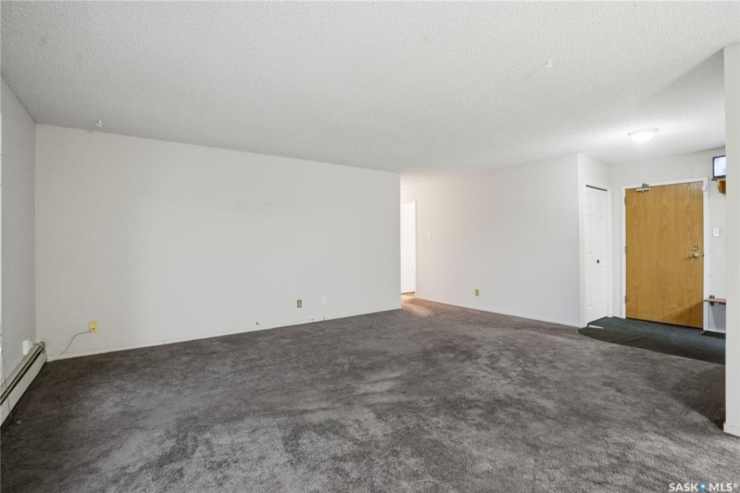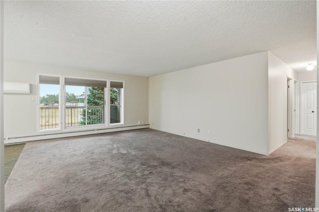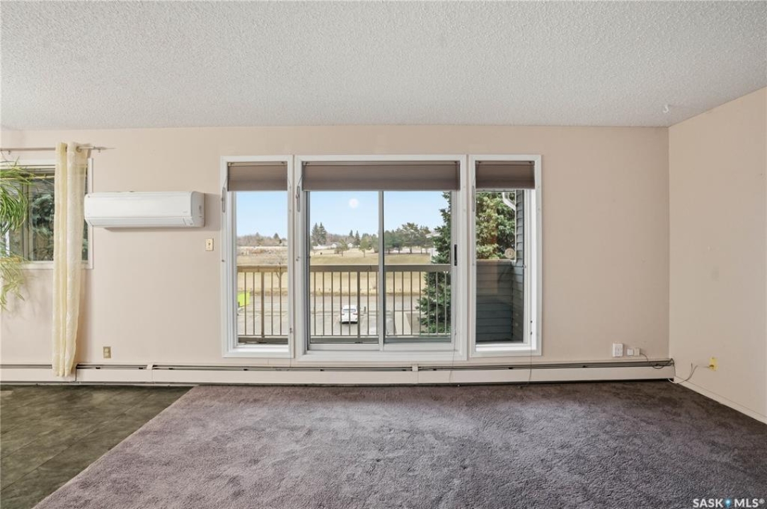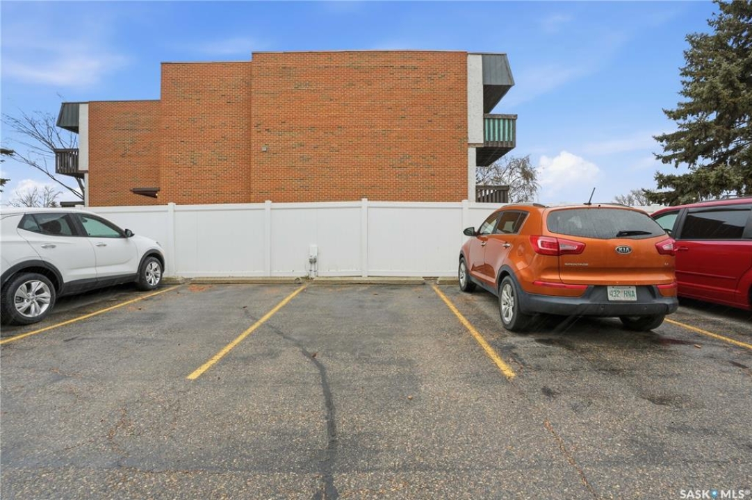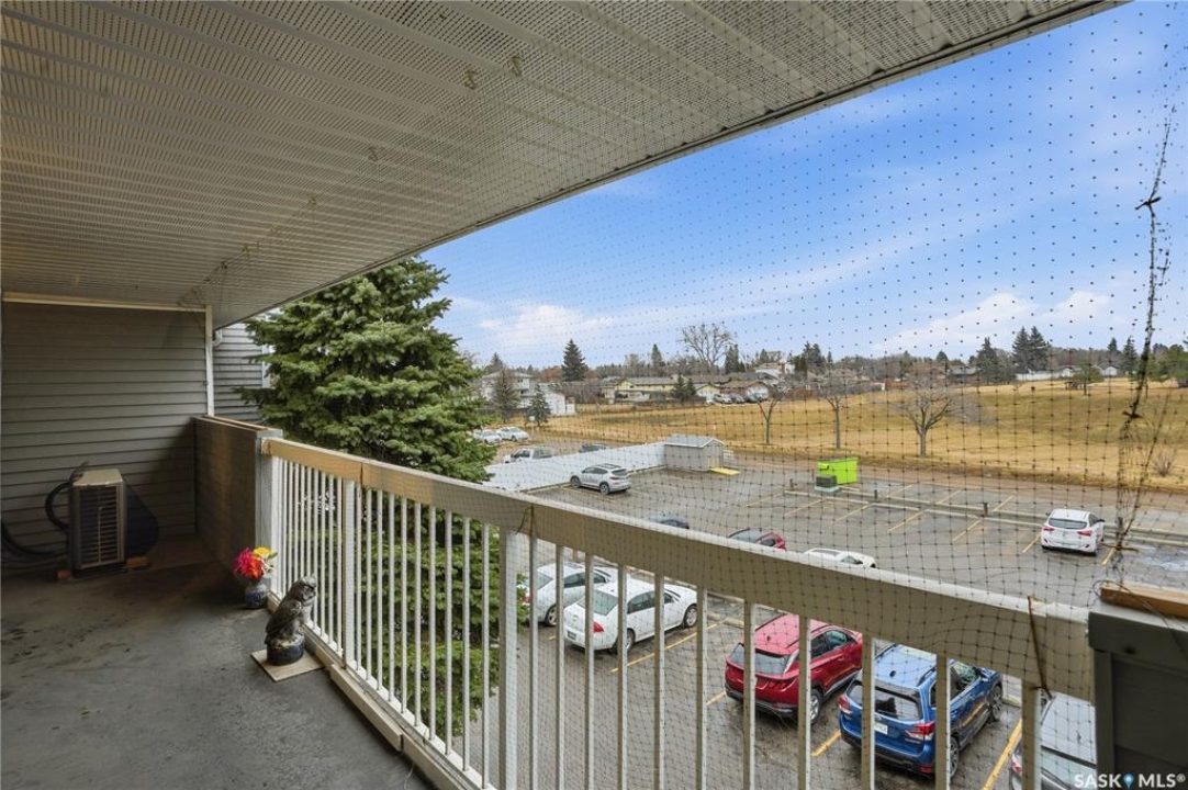Elevator access, Park-view top-floor condo in Parkside Place! This bright 1,376 sq ft 2-bed, 2-bath unit offers an open layout with morning sun and direct park views from the living room. Features include a large in-suite laundry room, wall A/C, spacious balcony with storage, , and one electrified parking stall. Prime location near Confederation Mall, parks, schools, and Circle Drive. Vacant and move-in ready!