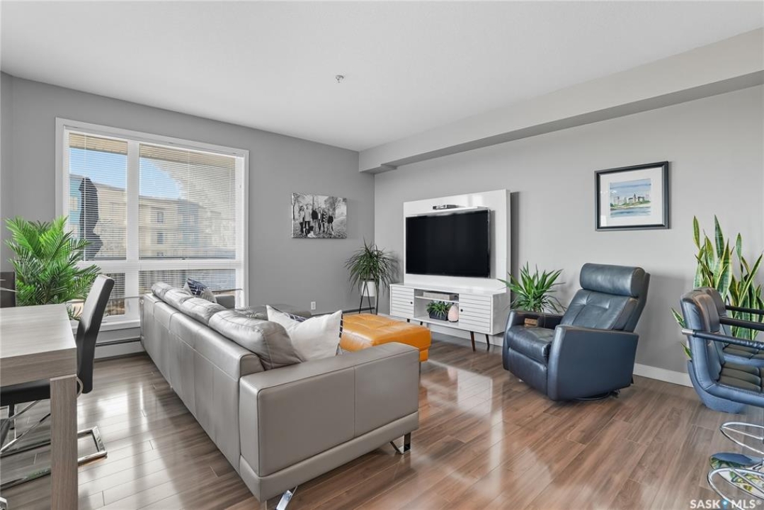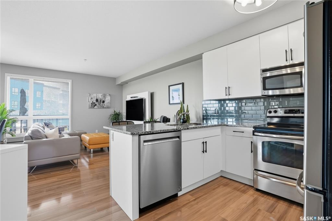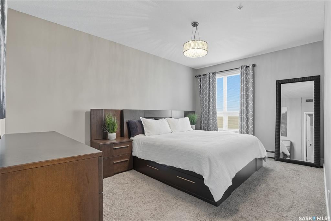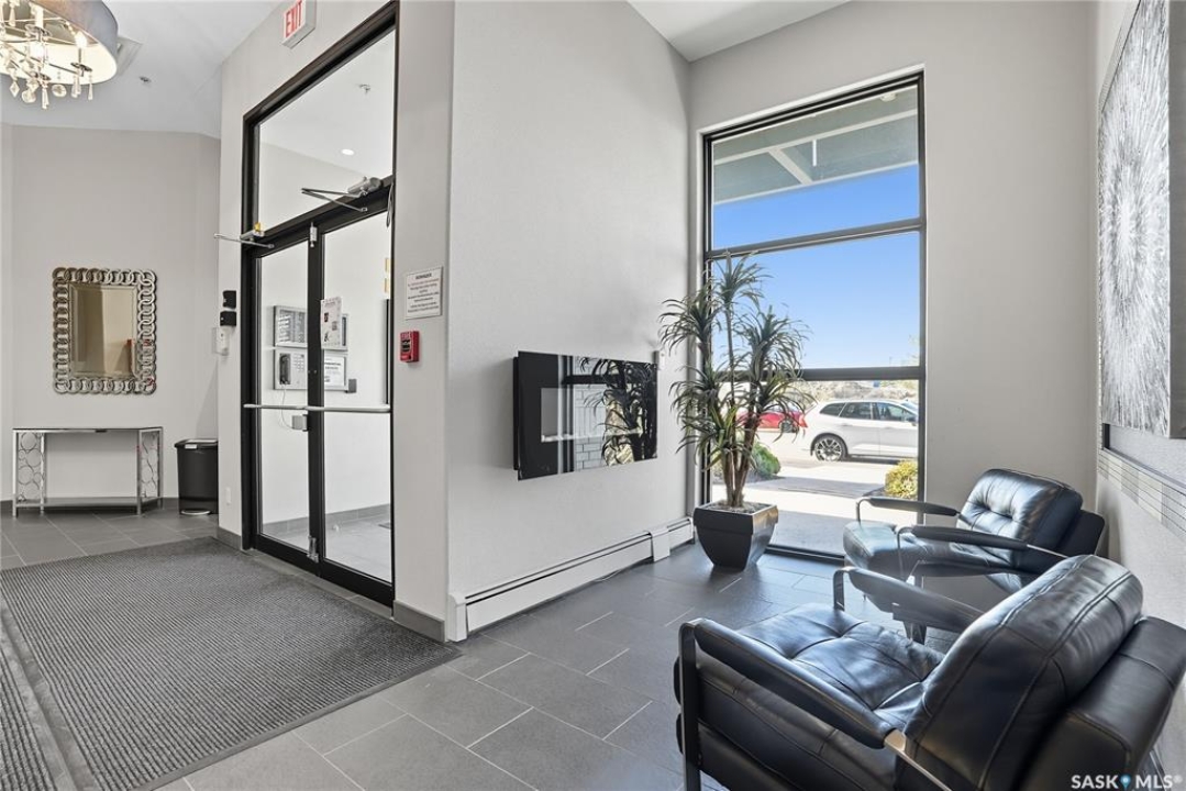 Don't miss out on this beautifully appointed condo located in the desirable east end of Saskatoon. This 2 bedroom, 2 bathroom corner unit features an open concept layout with beautiful modern finishes and plenty of natural light. As you step into the unit, you are greeted by a spacious foyer with a large coat closet and convenient in-suite laundry. The open-concept living and dining area is perfect for entertaining guests, with views overlooking the green space across the road and patio doors leading out to a private corner balcony (storage room on the balcony). The modern kitchen boasts a timeless appearance with stainless steel appliances, sleek but classy cabinetry, and a nicely sized island for casual dining. The primary bedroom features a walk-in closet and a 3-piece ensuite bathroom with a walk-in shower. The second bedroom is also a good size and is serviced by a 4-piece bathroom. Additional features of this unit include air conditioning, underground parking, and a bonus above-ground stall as well. Located just steps away from shopping, restaurants, and public transportation, this stunning condo offers a convenient, low-maintenance lifestyle for those looking to downsize or enter the property market. Don't miss out on this fantastic opportunity to own a beautiful condo in a sought-after location.