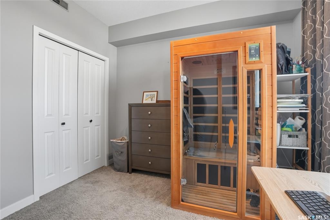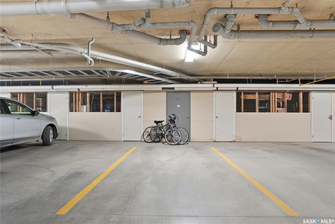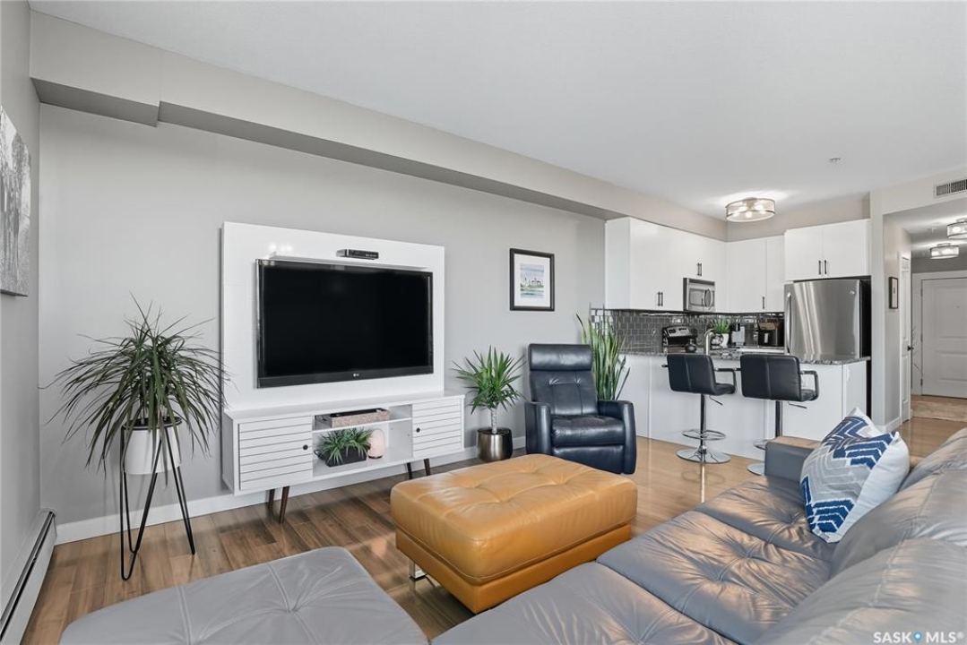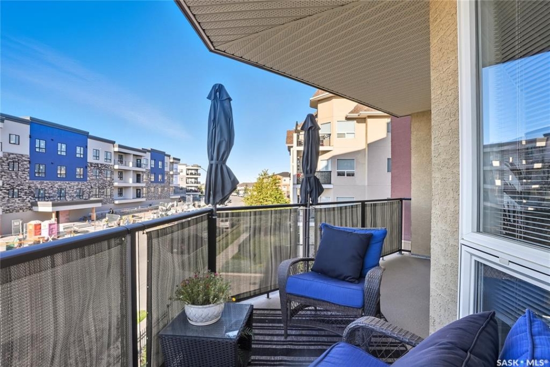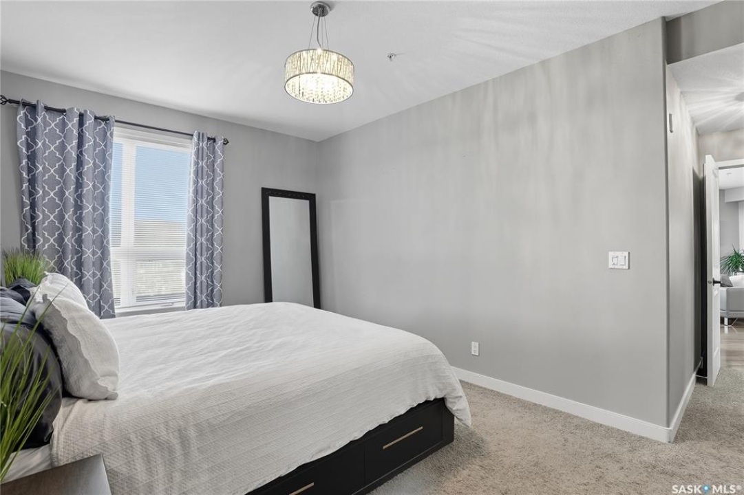 Don't miss out on this beautifully appointed condo located in the desirable east end of Saskatoon. This 2 bedroom, 2 bathroom corner unit features an open concept layout with beautiful modern finishes and plenty of natural light. As you step into the unit, you are greeted by a spacious foyer with a large coat closet and convenient in-suite laundry. The open-concept living and dining area is perfect for entertaining guests, with views overlooking the green space across the road and patio doors leading out to a private corner balcony (storage room on the balcony). The modern kitchen boasts a timeless appearance with stainless steel appliances, sleek but classy cabinetry, and a nicely sized island for casual dining. The primary bedroom features a walk-in closet and a 3-piece ensuite bathroom with a walk-in shower. The second bedroom is also a good size and is serviced by a 4-piece bathroom. Additional features of this unit include air conditioning, underground parking, and a bonus above-ground stall as well. Located just steps away from shopping, restaurants, and public transportation, this stunning condo offers a convenient, low-maintenance lifestyle for those looking to downsize or enter the property market. Don't miss out on this fantastic opportunity to own a beautiful condo in a sought-after location.