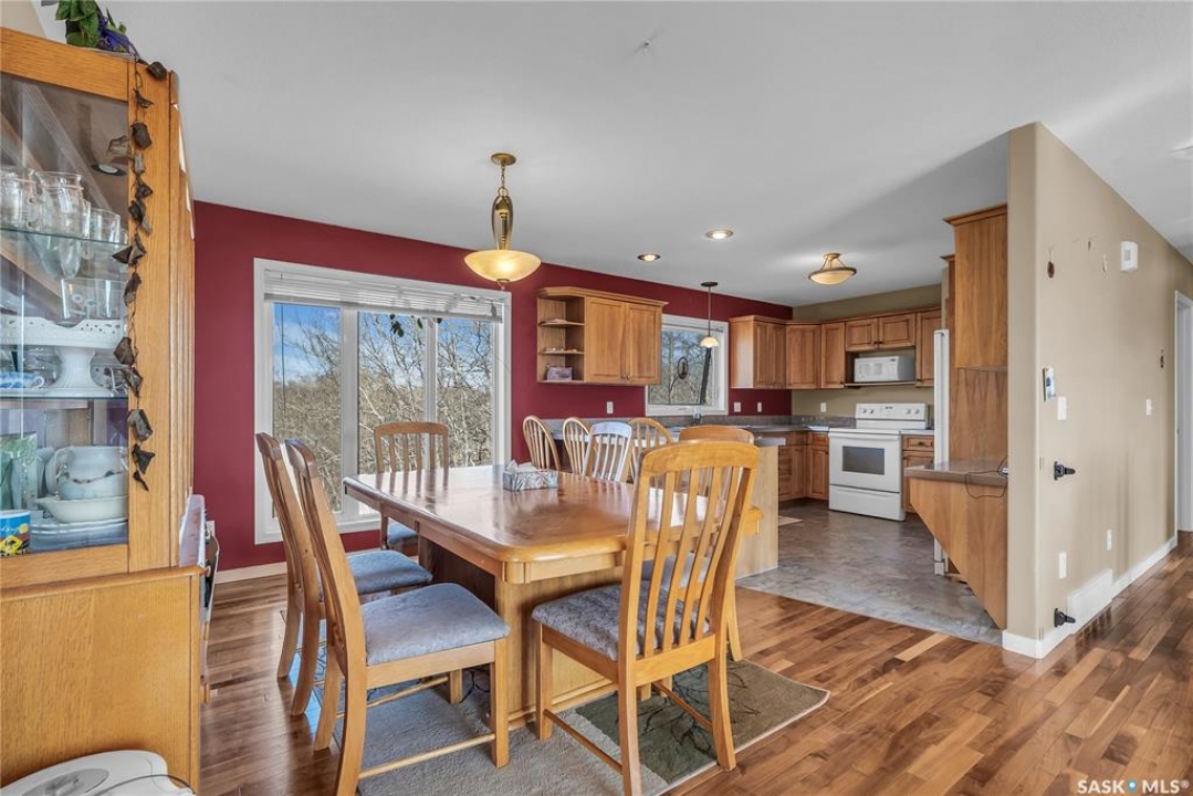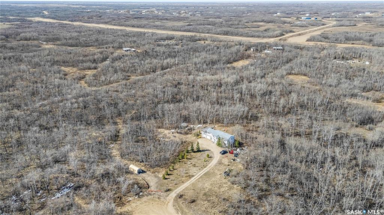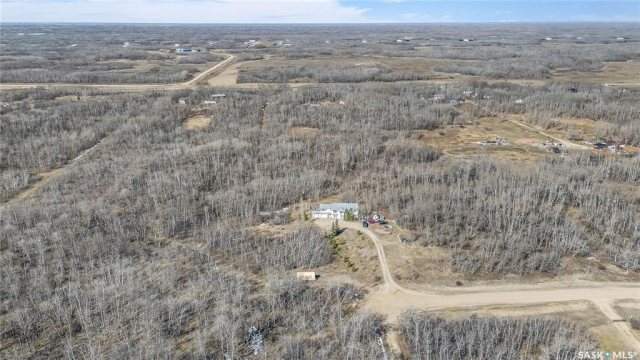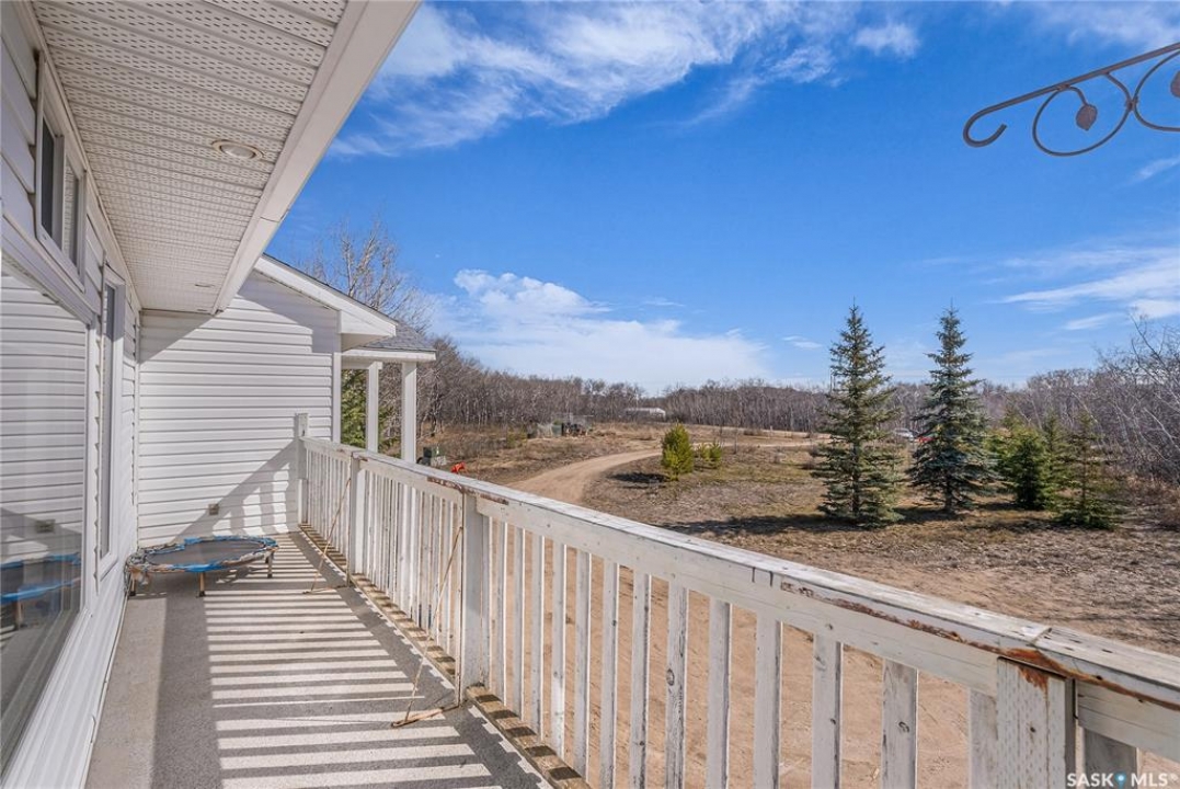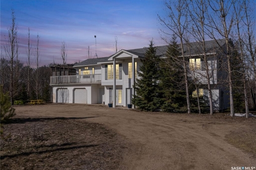 Settle in before spring hits and enjoy peaceful acreage living just minutes off Highway 11. The property is perfectly private yet easily accessible, with little to no highway noise. This spacious 2,800 sq ft two-storey home (about 1,600 sq ft up and 1,200 sq ft down) offers 5 bedrooms, 3 bathrooms, a main floor office, a large master suite with space for a second office, laundry on both levels, and a sunroom that steps out to a wrap-around deck. The attached 24' x 26' garage includes built-in shelving, generous storage, and 220V power. Inside, the home features walnut hardwood, laminate, linoleum, and carpet flooring, hickory kitchen cabinetry and railings, and cozy family rooms on both levels with a wood-burning fireplace and a gas stove/fireplace. The 10-acre parcel offers major upside. Per the seller, there is potential to subdivide roughly 7 excess acres into multiple acreage lots (minimum approved lot size of 0.4 acres), creating a strong long-term development or resale opportunity. A 42" bored well supplies abundant water, with a city water line available if preferred. The yard features 200+ planted trees, thick bush for privacy, and regular wildlife visits. School buses service Dundurn Elementary and Clavet High School. Private, spacious, and full of potential. Call your Realtor for your private viewing.