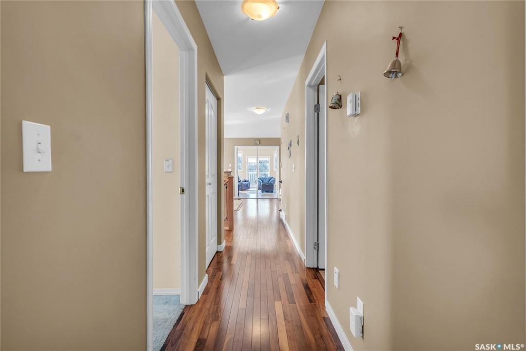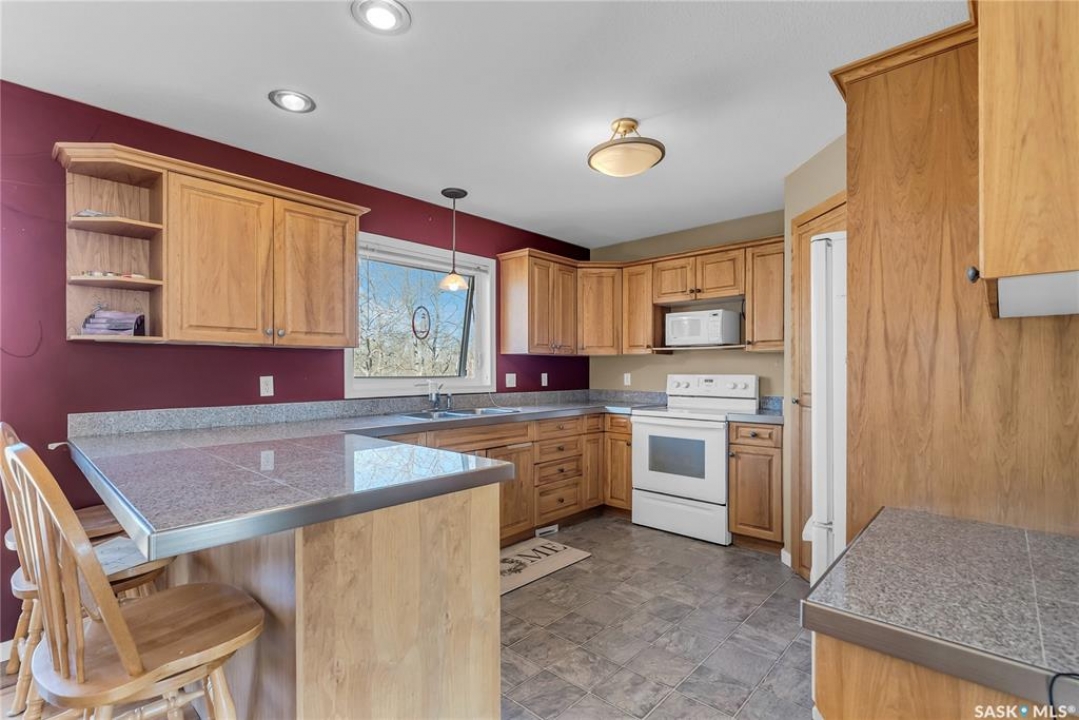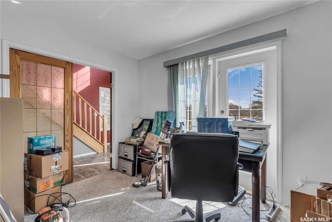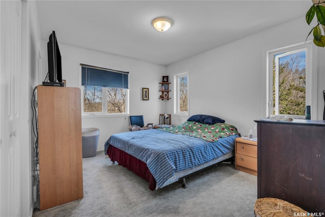 Settle in before spring hits and enjoy peaceful acreage living just minutes off Highway 11. The property is perfectly private yet easily accessible, with little to no highway noise. This spacious 2,800 sq ft two-storey home (about 1,600 sq ft up and 1,200 sq ft down) offers 5 bedrooms, 3 bathrooms, a main floor office, a large master suite with space for a second office, laundry on both levels, and a sunroom that steps out to a wrap-around deck. The attached 24' x 26' garage includes built-in shelving, generous storage, and 220V power. Inside, the home features walnut hardwood, laminate, linoleum, and carpet flooring, hickory kitchen cabinetry and railings, and cozy family rooms on both levels with a wood-burning fireplace and a gas stove/fireplace. The 10-acre parcel offers major upside. Per the seller, there is potential to subdivide roughly 7 excess acres into multiple acreage lots (minimum approved lot size of 0.4 acres), creating a strong long-term development or resale opportunity. A 42" bored well supplies abundant water, with a city water line available if preferred. The yard features 200+ planted trees, thick bush for privacy, and regular wildlife visits. School buses service Dundurn Elementary and Clavet High School. Private, spacious, and full of potential. Call your Realtor for your private viewing.