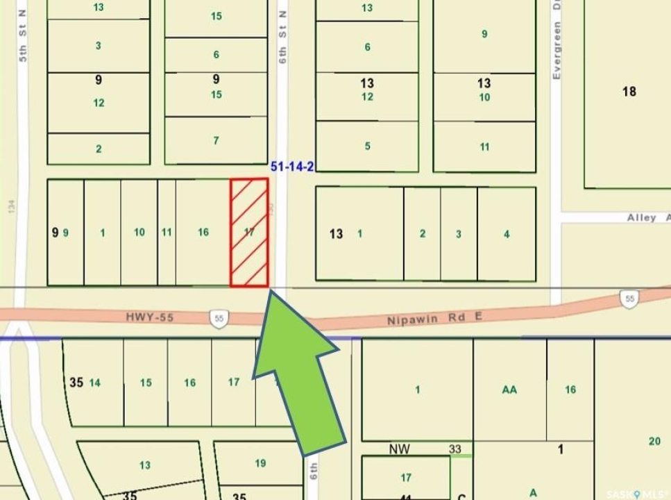 PRIME HIGHWAY COMMERCIAL vacant lot on Nipawin Road East / HWY 55 with 50 ft frontage on the East “gateway” to Nipawin! Lot size is approx. 50x144.9' (0.17 acres). Located near the road to the Evergreen center, hotel and the golf course, and is kitty-corner from the gas station. Zone C2 – (C2 – Highway Commercial – more in the Zoning Bylaw). Seller states GST doesn't apply to the sale price. Buyer is required to complete construction within 2 years of purchase. Building permit is required. Town of Nipawin incentives might be available, conditions apply. Property taxes to be assessed. Nipawin and area are known for great fishing, hunting and the great outdoors. Bring your business to Nipawin!