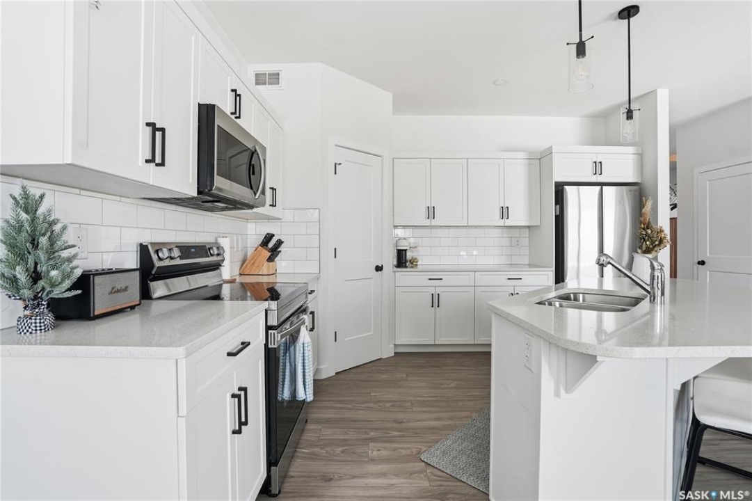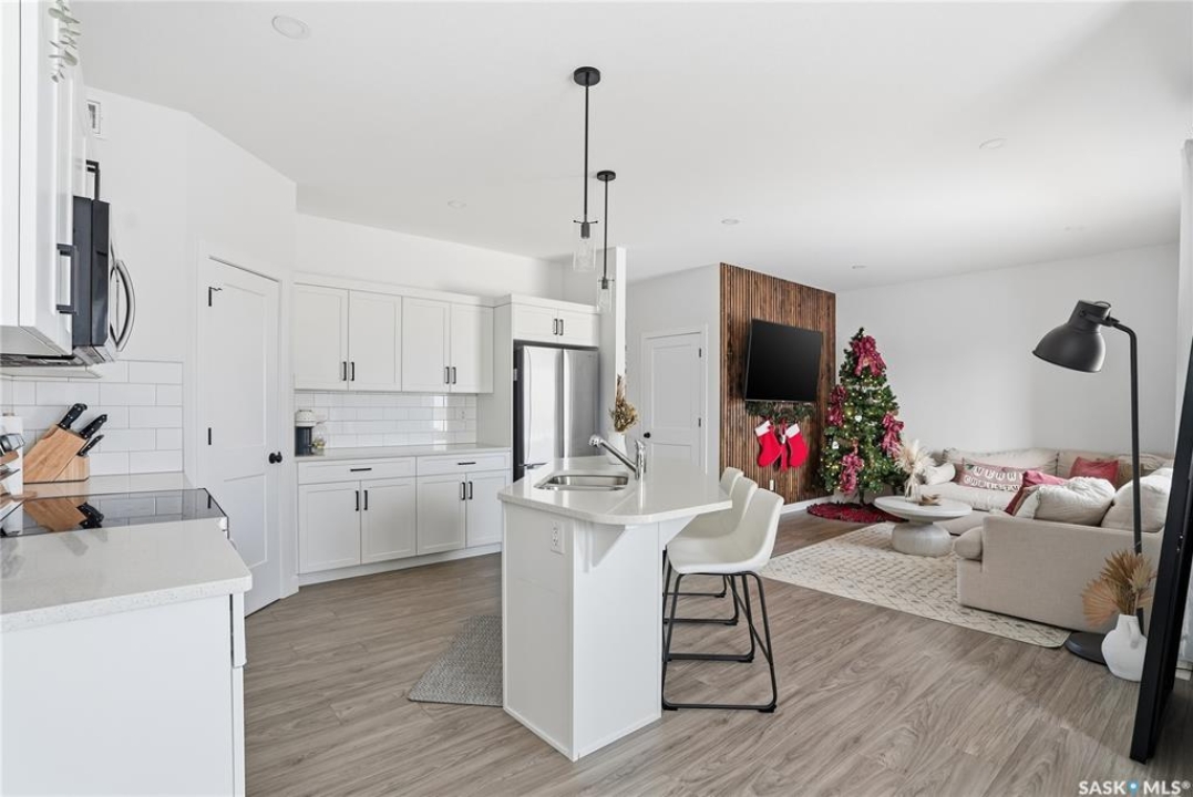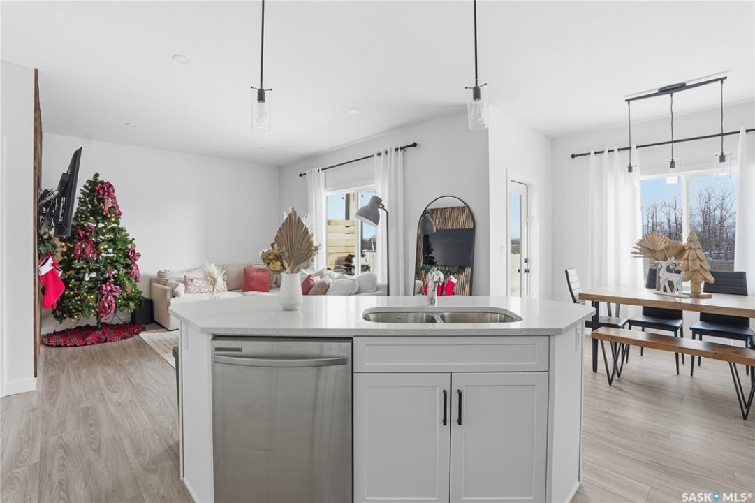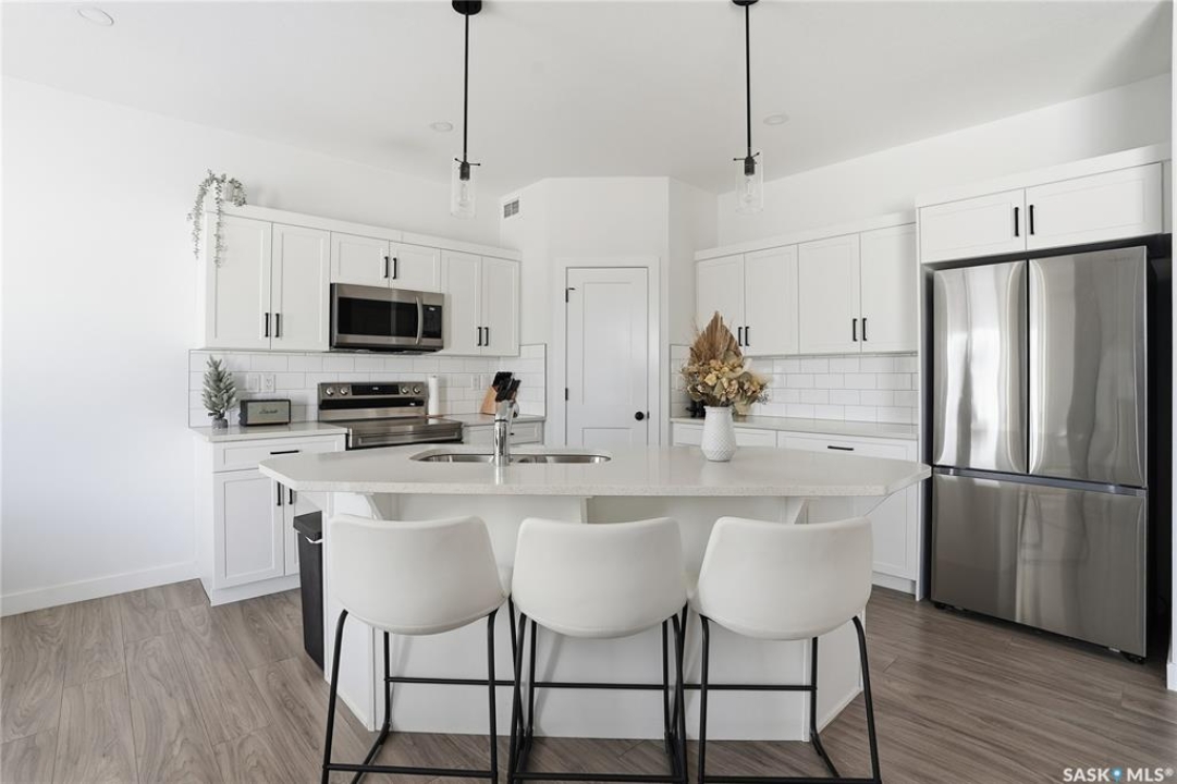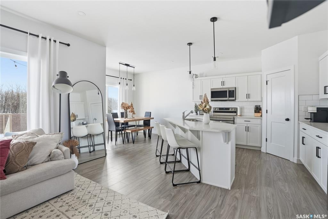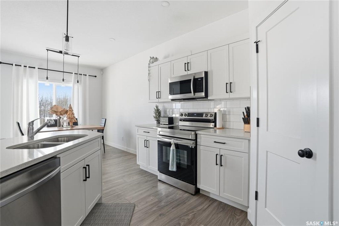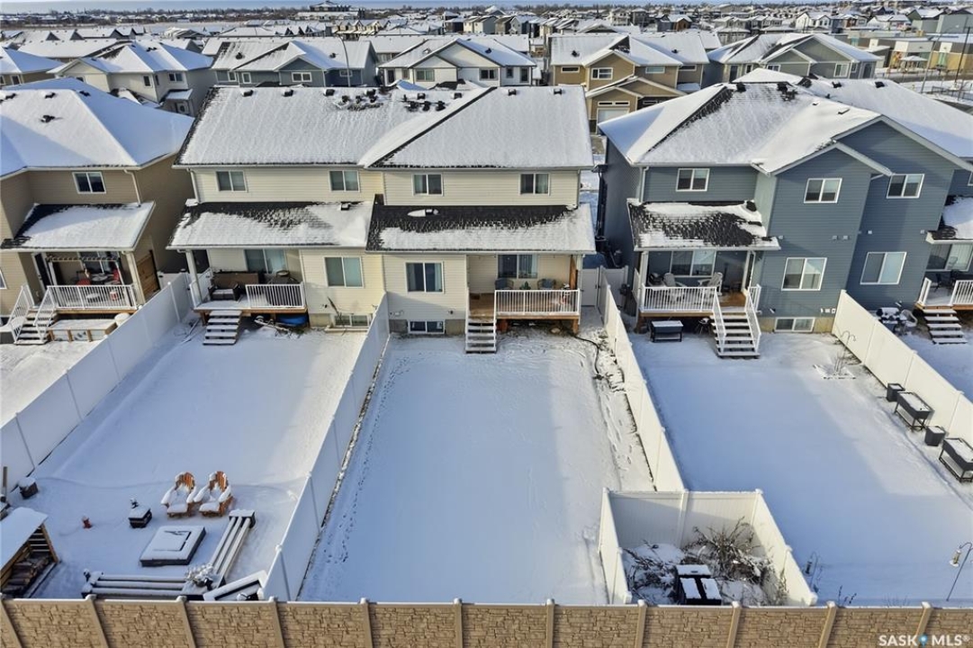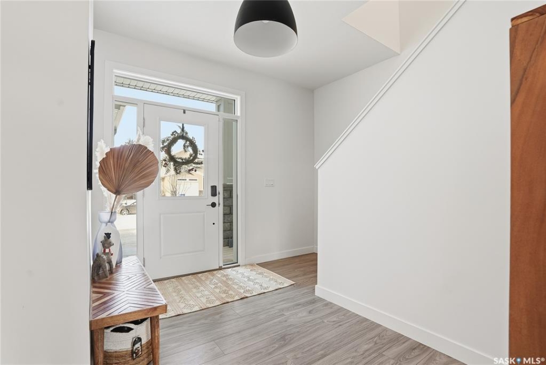 Welcome to a beautifully finished 3-bedroom, 3-bath half duplex located in the highly desirable Lake Vista neighbourhood of Martensville. This is the perfect family home in an incredible location — just half a block from the brand new school. Watch your children walk to school right from your front step. Inside, this smart-home-equipped property offers thoughtful upgrades and a modern layout. The centre of the home is an impressive kitchen featuring quartz countertops, quality cabinetry, stainless steel appliances, and a functional island ideal for both cooking and entertaining. The main floor provides bright living spaces, easy traffic flow, and access to the backyard. Upstairs, enjoy a dedicated laundry room, a large primary bedroom, and a spacious walk-in closet to keep your space clutter-free. The massive primary suite includes a luxurious 5-piece ensuite, complete with double vanity and separate shower—your own private retreat. Two additional bedrooms and a second full bathroom complete the upper level. Outside, the home offers a double-wide upgraded driveway and a beautifully landscaped yard. The rear yard backs greenspace, giving you peaceful views and added privacy—no neighbours staring directly into your backyard. Situated in one of Martensville's newest, most family-oriented communities, 153 Echo Lane delivers convenience, comfort, and long-term value. A unique chance to live steps from the school in a turnkey home—this one is a must-see.