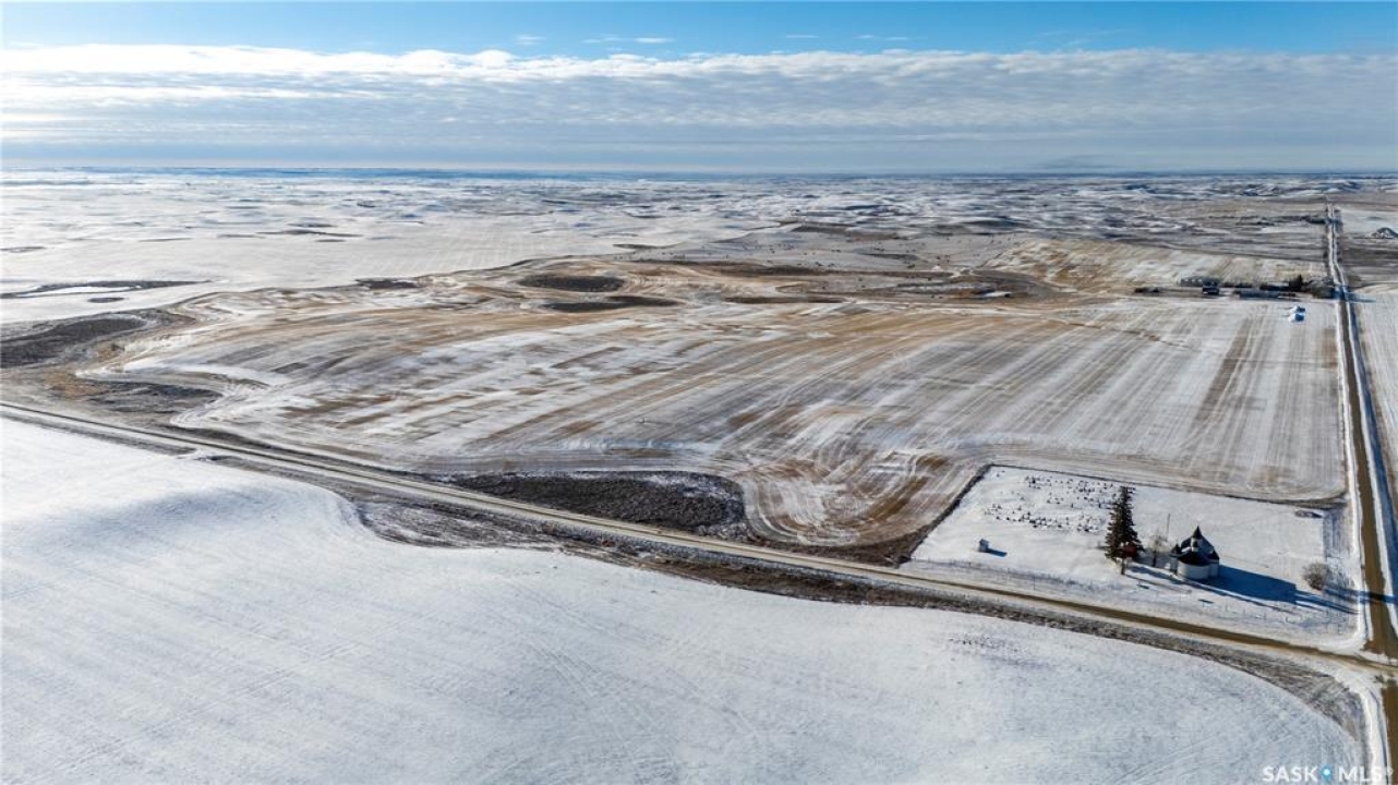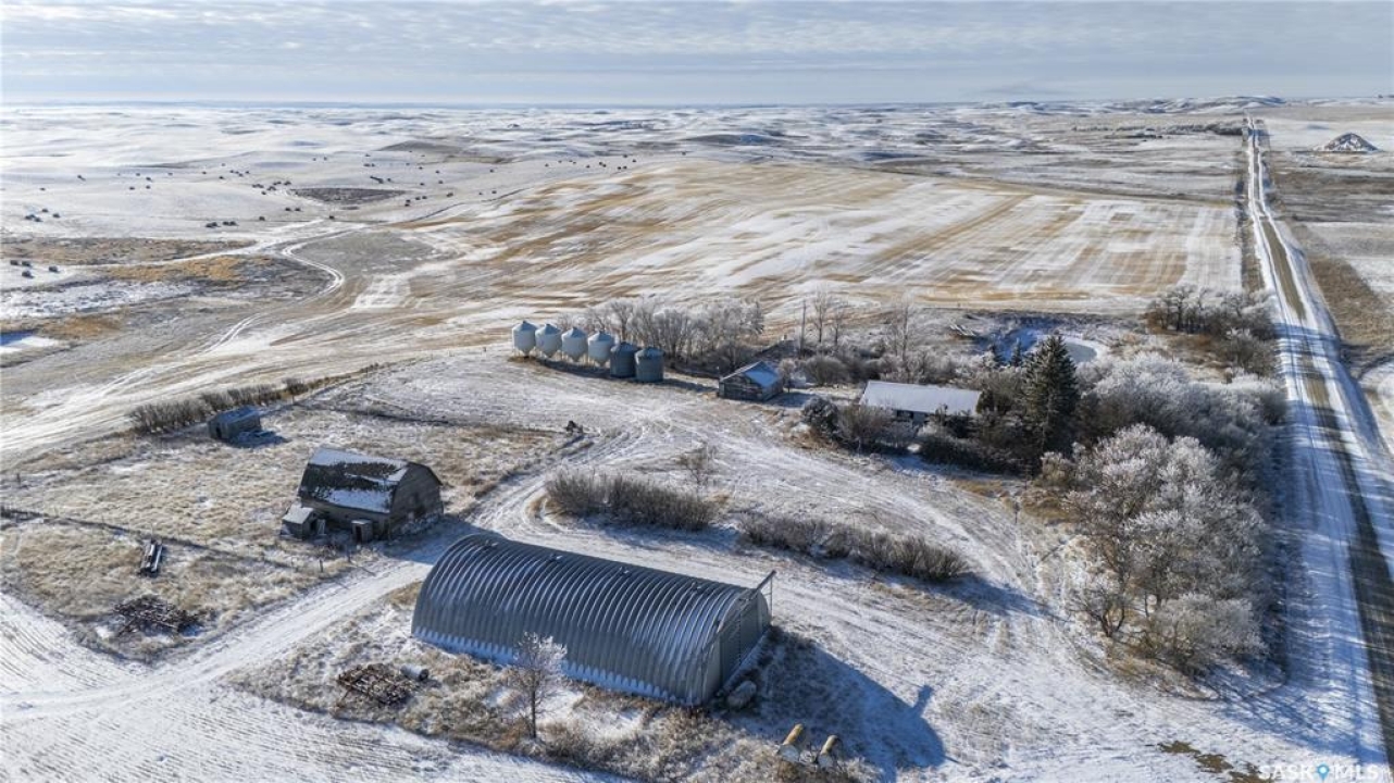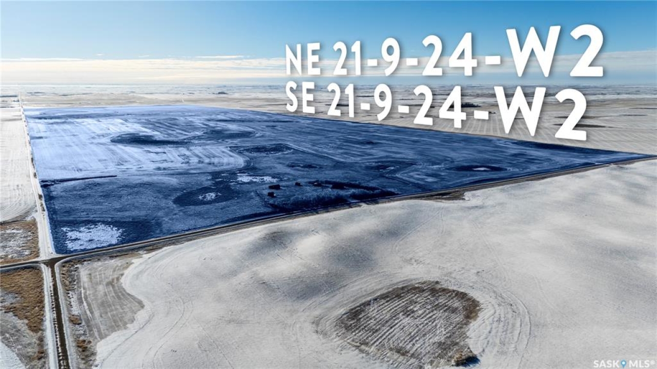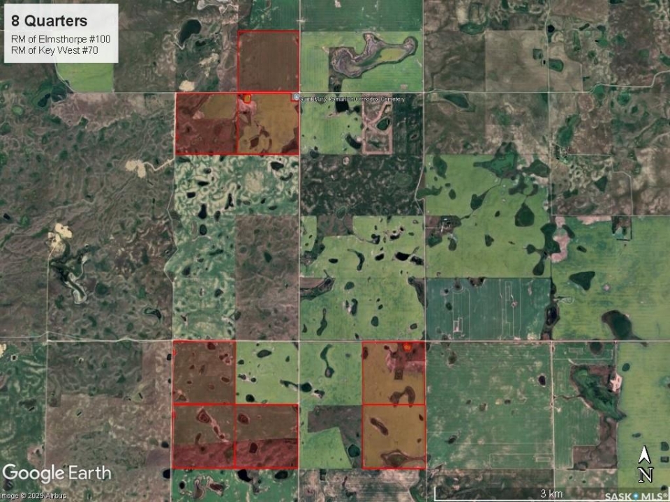 8 Quarters of productive farmland with some pasture in the Kayville/Dahinda, SK area located in the R.M. 's of Key West #70 and Elmsthorpe #100. Owner states 935 cultivated acres, with the balance of the usable land in native grass. SCIC soil classifications consist of 4 “H”, 3 “J” and 1 “K”. This land has great access with municipal roads to all of the blocks of land. The crop land is leased out for the 2026 crop season providing a 3.2% return of the asking price. There is no lease in place on the pasture land and could provide additional revenue if the pasture was leased out. The main yard site on the NE 32-9-24 W2 has power to the yard, a steel quonset, six bins total (4 hopper and 2 flat bottom), a bungalow (has not been lived in for several years), and several other outbuildings. There is a second yard site area with an older house and outbuildings with power to the yard on the NE 21-9-24 W2. Asking Price Breakdown: $2,515.10/Titled Acre. Outlines are an approximation.