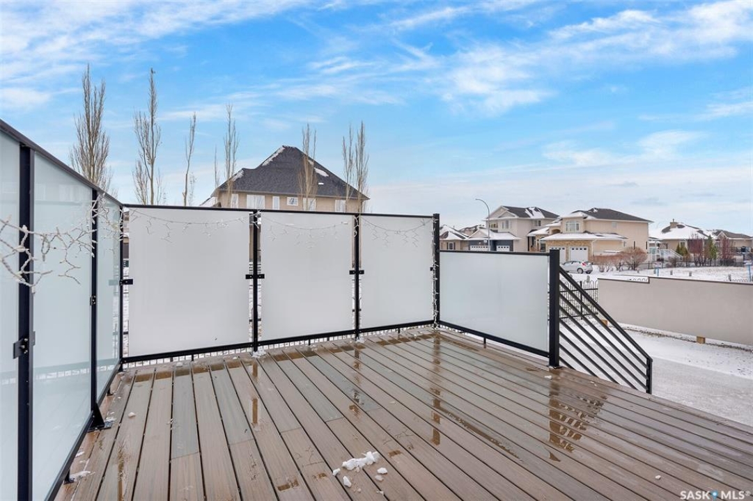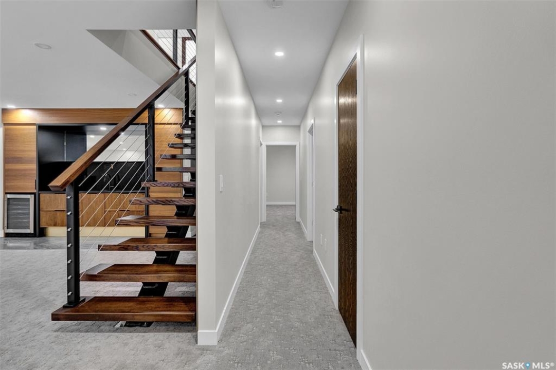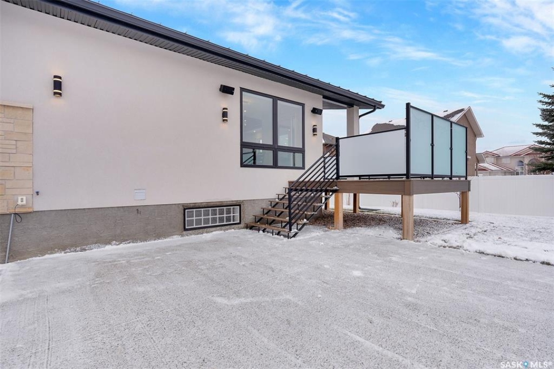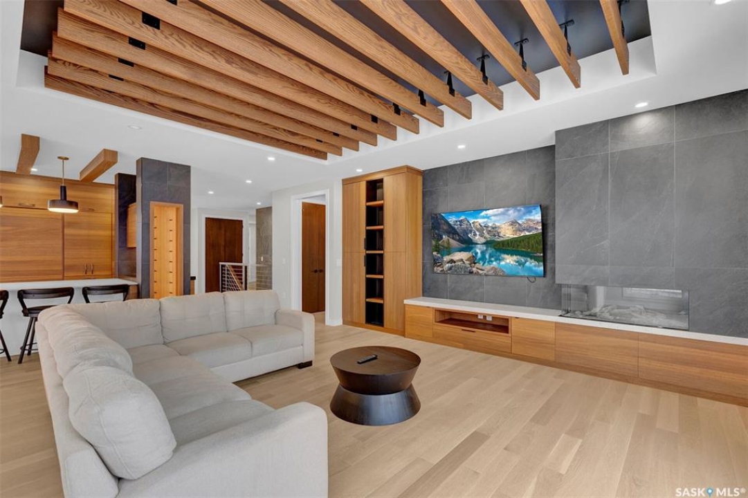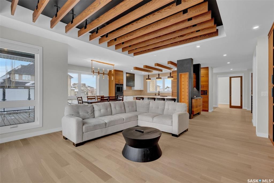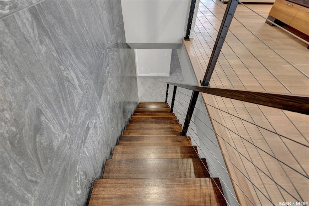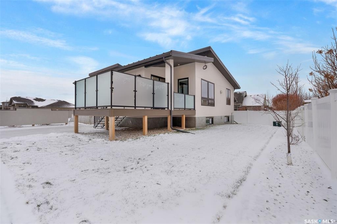 Mid-century modern by one of Regina's most respected builders: Westmount Homes (Tom Moore). Thoughtful design, remarkable craftsmanship & the builder's signature commitment to quality. Adjacent to an open space easement, this home will impress! Main floor 9' ceiling & suspended beams in great room ,gas fireplace wrapped in blackened steel, & custom millwork. Flooded with natural light, the space flows to dining area & the gourmet kitchen that is as functional as it is beautiful. Custom cabinetry, a large quartz topped island W generous amount of drawers & wine fridge. Built in JennAir fridge, coffee bar, blackened steel hood fan, induction cooktop (gas line available), double ovens ,light-sensored garbage/recycling drawer, & cabinet W black quartz countertop & wine racks. Front den has 11' ceiling & frosted sliding door. Primary bdrm features a showstopper ensuite:double sinks, floating vanity, heated floor, soaker tub, glass shower & walk-in closet. Laundry/mud room W wall of custom designed cupboards, cabinets & sink. Engineered hardwood floors & tile throughout main floor. Powder room. Tile wall adjacent to floating tread staircase W steel cable railing. Expansive family rm 2 large windows & custom-built wet bar W fridge. Two big bedrooms W walk-in closets, linen closet & stunning � bath W glass shower. Storage space in furnace/utility room. 26' x 26' garage with 13'4" ceiling, floor drain and epoxy coated floor. Patio doors from the dining area open to the Trek deck with staggered frosted inserts in the railing and steps to the lower-level exposed aggregate patio.Underground sprinklers in front and back.The home is fully spray foamed, structural floor & built on piles. 200 AMP 84 circuit electrical panel, high efficient furnace & triple pane windows. Heavy duty soffits & eavestroughs & Standing Seam Metal Roof. Two stuccoed privacy walls in front. The home comes with Westmount Homes New Home Warranty. This home is a definite must to view!