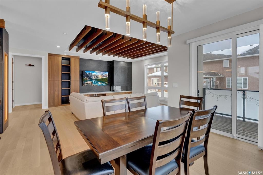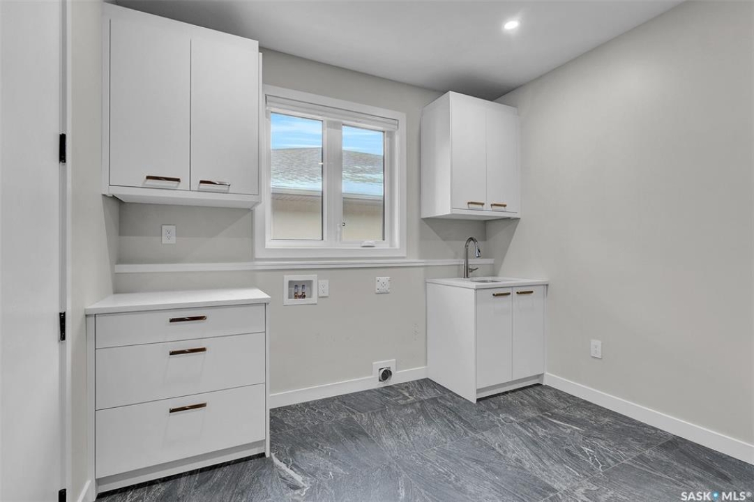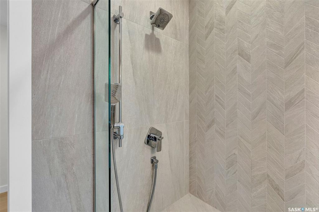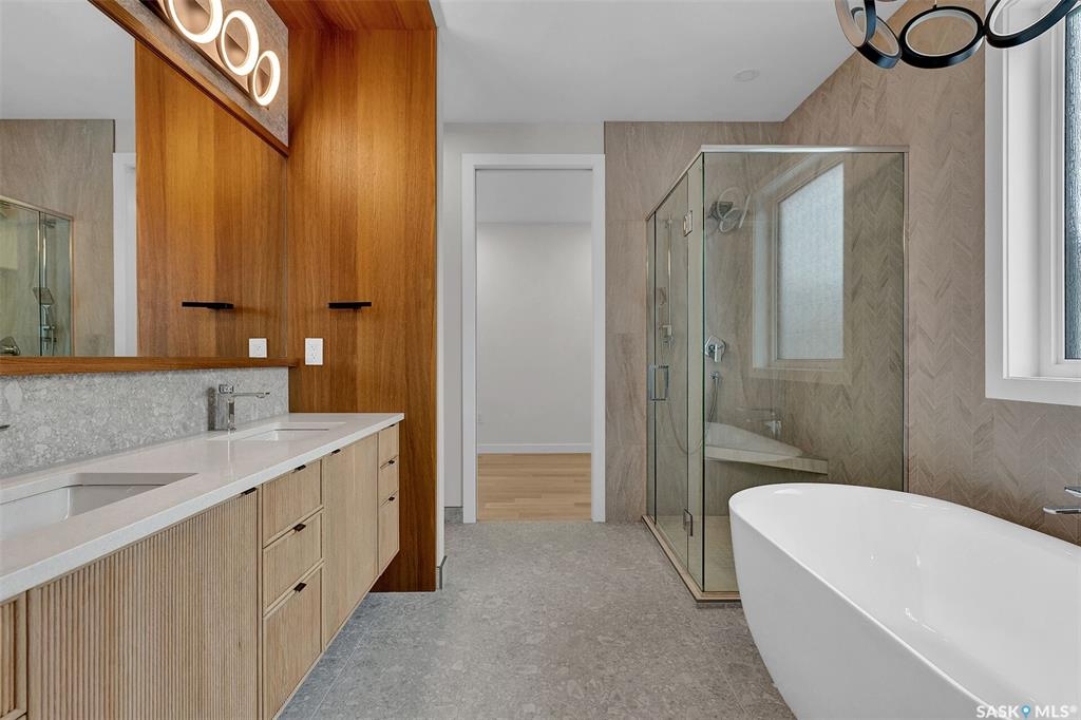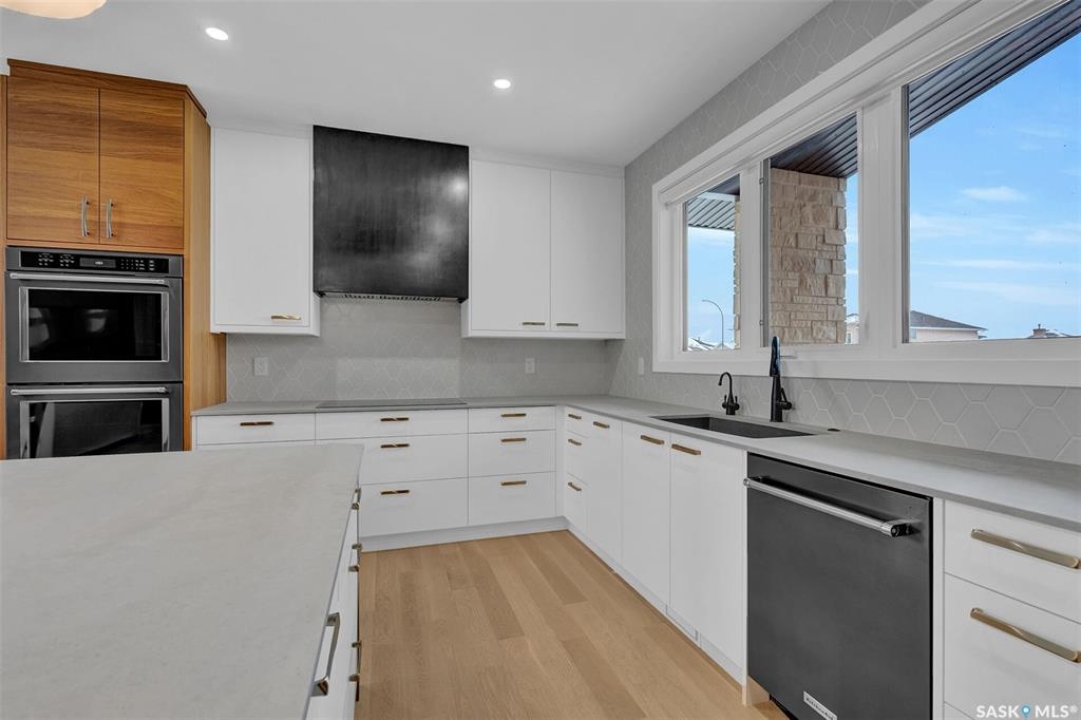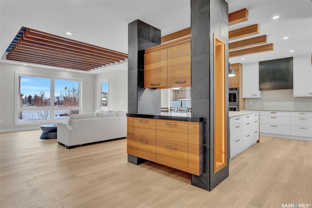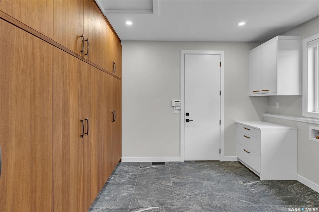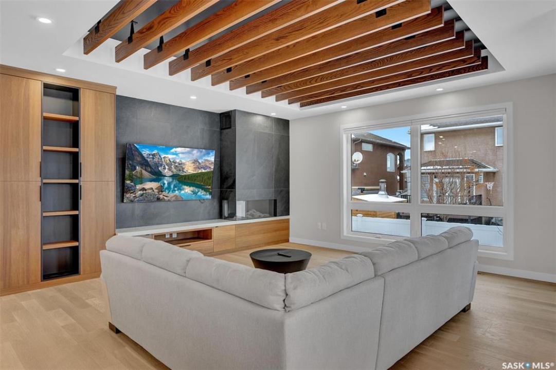 Mid-century modern by one of Regina's most respected builders: Westmount Homes (Tom Moore). Thoughtful design, remarkable craftsmanship & the builder's signature commitment to quality. Adjacent to an open space easement, this home will impress! Main floor 9' ceiling & suspended beams in great room ,gas fireplace wrapped in blackened steel, & custom millwork. Flooded with natural light, the space flows to dining area & the gourmet kitchen that is as functional as it is beautiful. Custom cabinetry, a large quartz topped island W generous amount of drawers & wine fridge. Built in JennAir fridge, coffee bar, blackened steel hood fan, induction cooktop (gas line available), double ovens ,light-sensored garbage/recycling drawer, & cabinet W black quartz countertop & wine racks. Front den has 11' ceiling & frosted sliding door. Primary bdrm features a showstopper ensuite:double sinks, floating vanity, heated floor, soaker tub, glass shower & walk-in closet. Laundry/mud room W wall of custom designed cupboards, cabinets & sink. Engineered hardwood floors & tile throughout main floor. Powder room. Tile wall adjacent to floating tread staircase W steel cable railing. Expansive family rm 2 large windows & custom-built wet bar W fridge. Two big bedrooms W walk-in closets, linen closet & stunning � bath W glass shower. Storage space in furnace/utility room. 26' x 26' garage with 13'4" ceiling, floor drain and epoxy coated floor. Patio doors from the dining area open to the Trek deck with staggered frosted inserts in the railing and steps to the lower-level exposed aggregate patio.Underground sprinklers in front and back.The home is fully spray foamed, structural floor & built on piles. 200 AMP 84 circuit electrical panel, high efficient furnace & triple pane windows. Heavy duty soffits & eavestroughs & Standing Seam Metal Roof. Two stuccoed privacy walls in front. The home comes with Westmount Homes New Home Warranty. This home is a definite must to view!