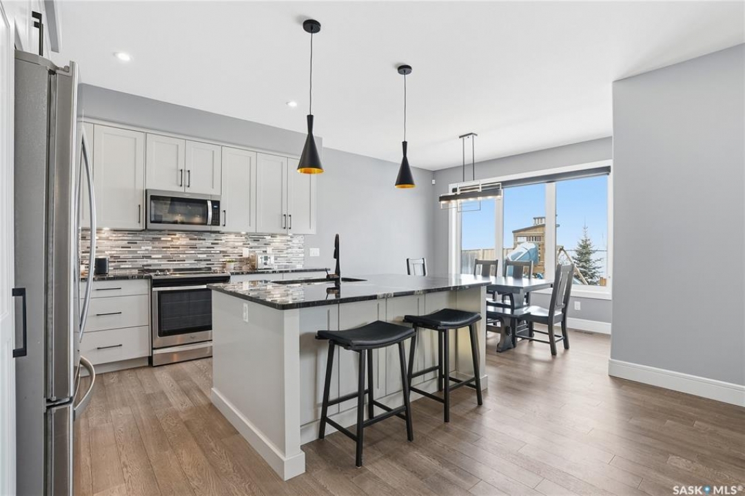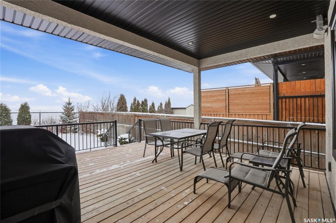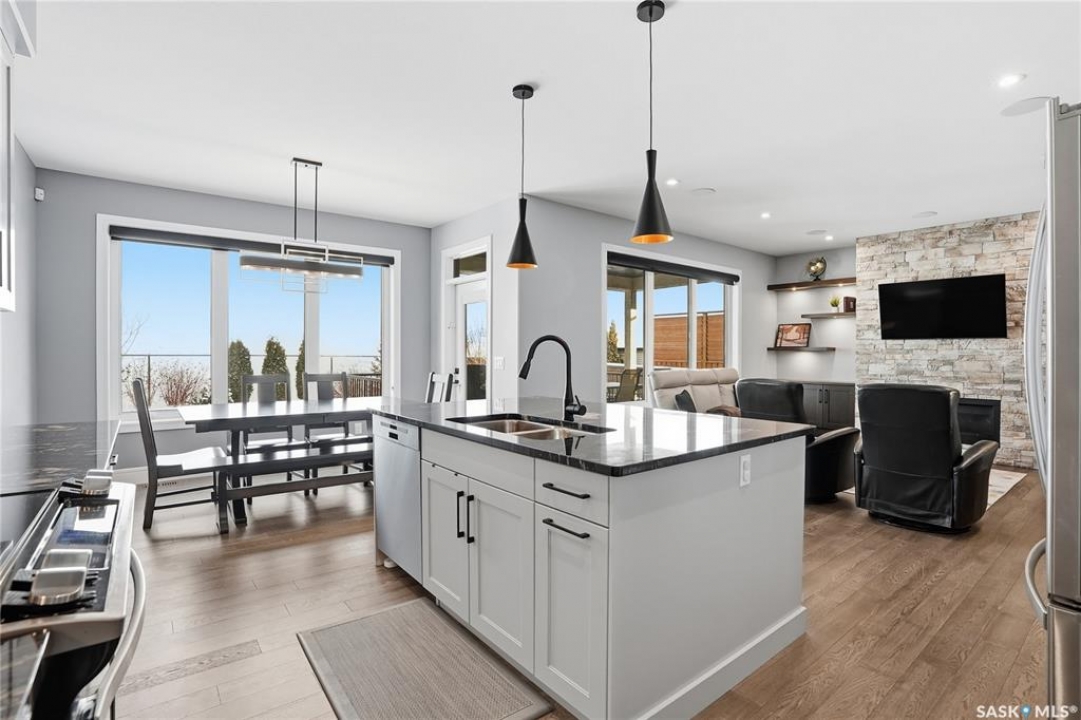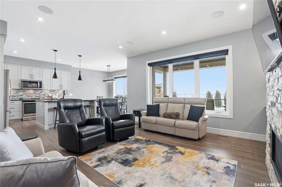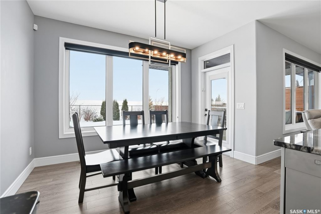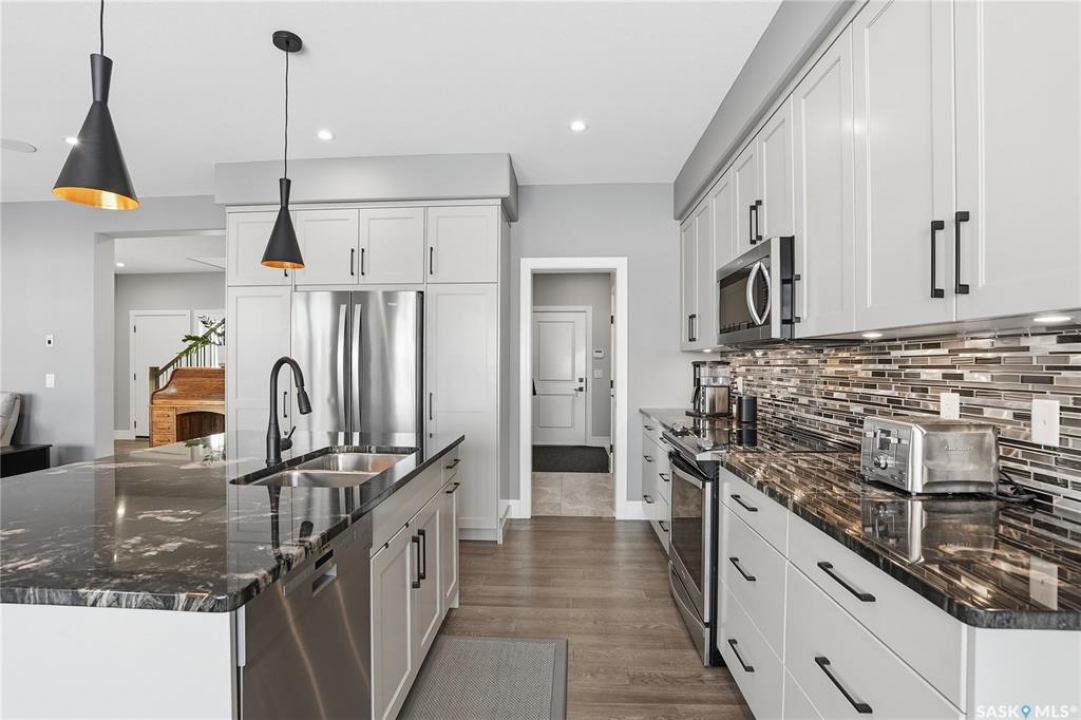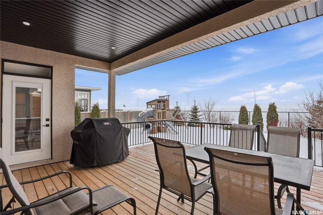 Welcome to a truly exceptional property in one of Saskatoon's most sought-after communities. This quality built 4-bedroom, 4-bath home in Evergreen combines luxury, thoughtful design, and breathtaking natural views—backing onto the Northeast Swale, one of the city's most treasured protected areas. Inside, you'll find high-end finishes throughout, enhanced by ample intentional storage. Nearly every space features custom built-ins—from the living room cabinetry to the upstairs laundry and mudroom—creating a cohesive, clutter-free environment. The chef's kitchen offers generous cabinet space, quality appliances, and elegant finishes, opening into a bright living area and expansive views. The primary suite is a retreat of its own with a walk-in closet and a tranquil view overlooking the Northeast Swale— no rear neighbours, just open sky and nature. The ensuite continues the spa-like feel with premium finishes and smart layout. Each additional bedroom is well-sized, and the upstairs laundry is outfitted with cabinetry and workspace, making daily living easy. The exterior is just as impressive. The low-maintenance front yard blends modern curb appeal with convenience. The private backyard features underground sprinklers on timers, along with a thoughtfully designed rear deck that offers an incredible vantage point of the protected prairie ecosystem. Approximately $50,000 has been invested in landscaping upgrades. A rare find, the home also includes a tandem drive-through garage, perfect for extra vehicles, hobbies, or recreational gear. If you're looking for luxury, privacy, natural beauty, and smart functionality—all in a walkable, family-friendly neighbourhood—this Evergreen home is the complete package.