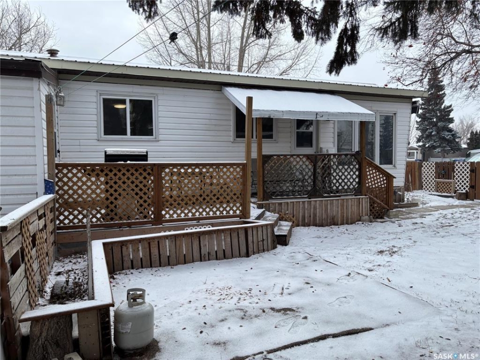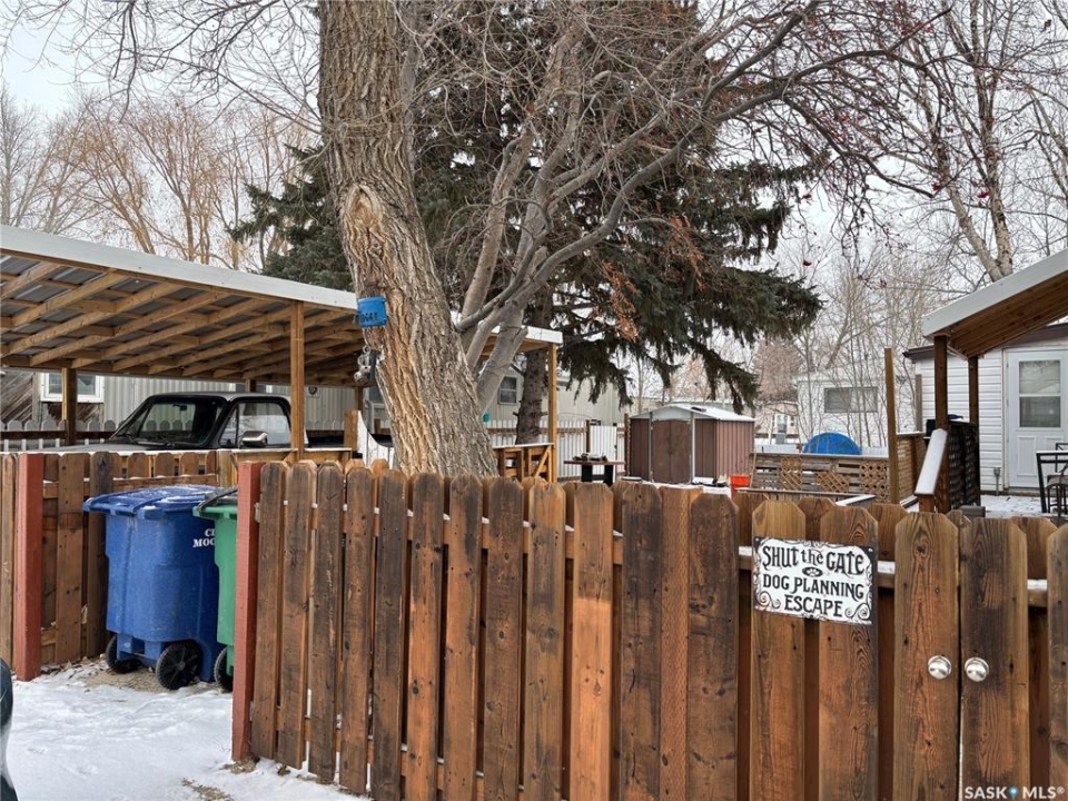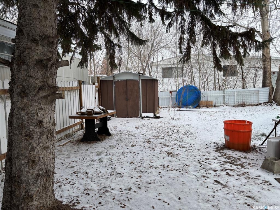Cozy 2 bedroom mobile home in the Prairie Oasis Trailer Court. Most windows updated, siding, and some flooring and window air conditioner to stay. An exterior awning over the west facing window. Completely fenced yard with a carport and shed. Features a back entrance leading to a large mud room with laundry facilities. Monthly fee of $748.21 covers lot pad fees, taxes, garbage/recycling, water, sewer, park maintenance, and snow removal. Enjoy low-maintenance living in this welcoming community.