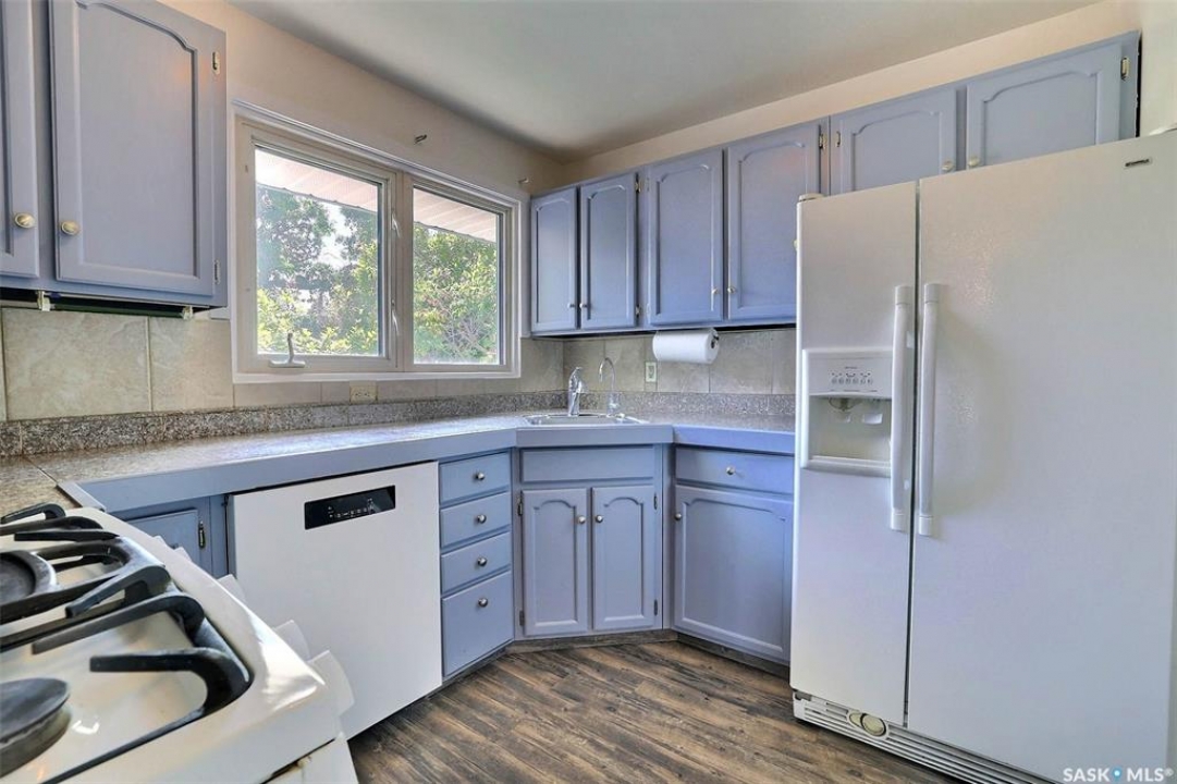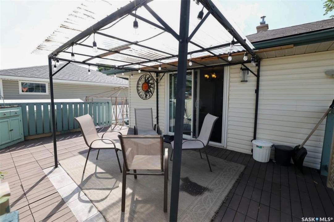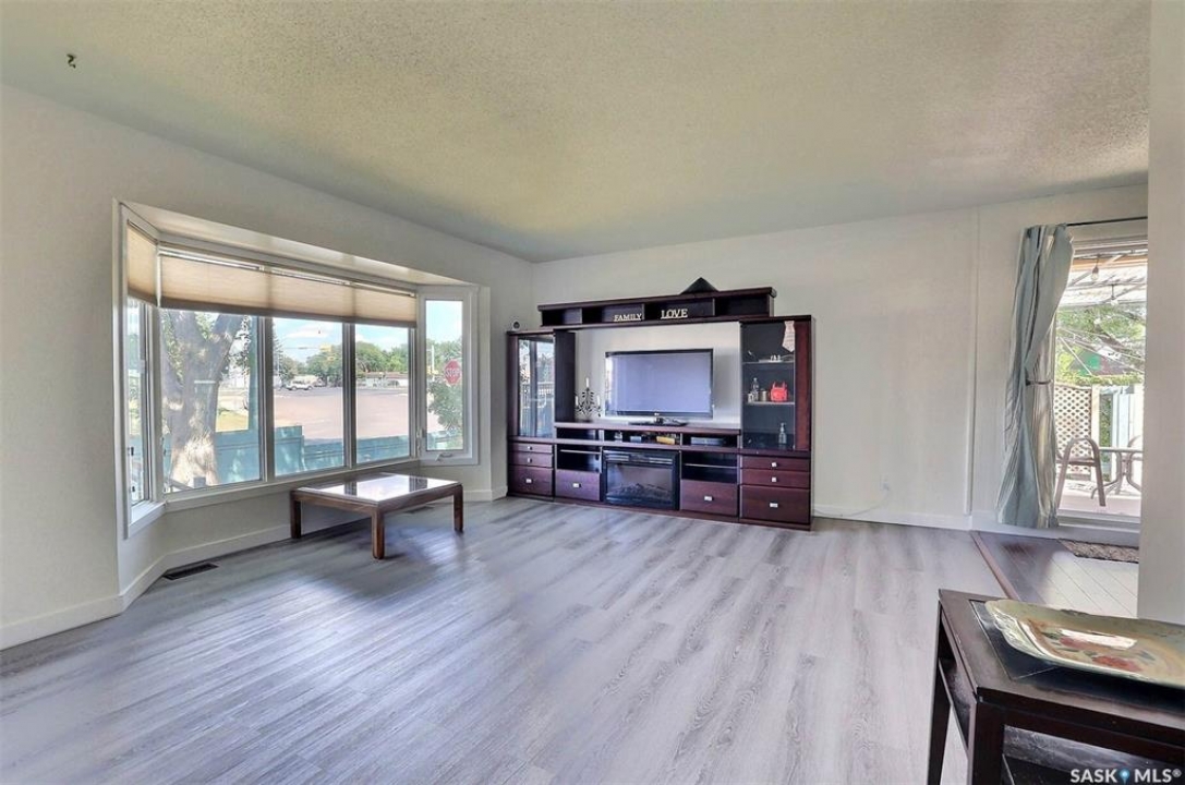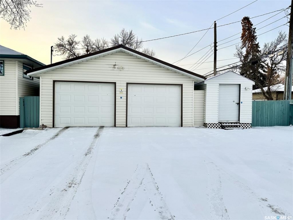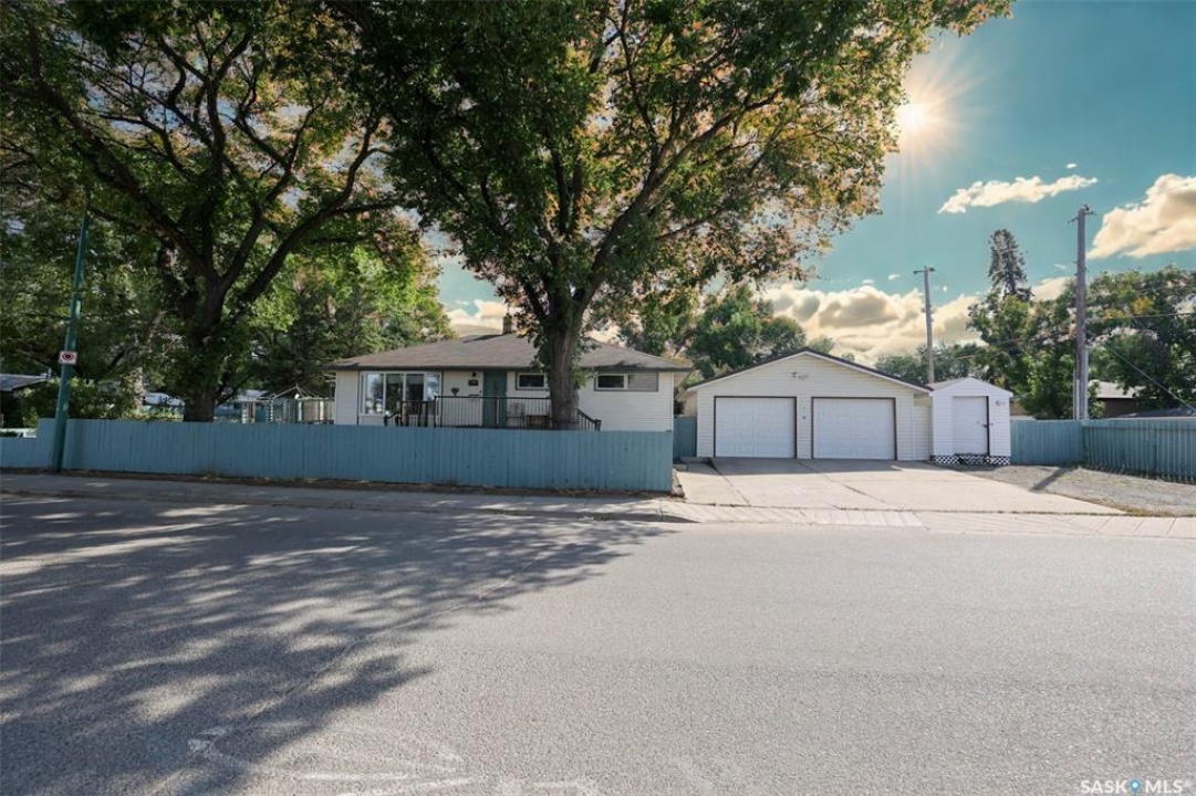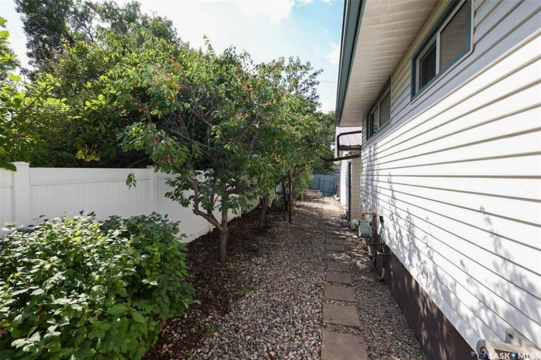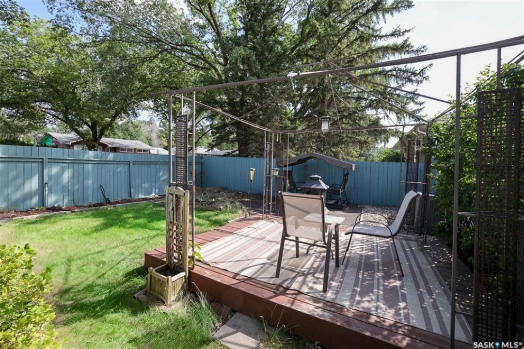 This home is located in Regina's quiet East End neighborhood of Dominion Heights — a well-established area with nearby parks, schools, amenities, and quick access to the ring road. The main floor offers a bright L-shaped living and dining room with sliding doors to the deck, plus a functional kitchen with ample storage and all appliances included. Three good-sized bedrooms (primary with windows on two sides) and a 4-piece bath complete the upstairs. The fully finished basement includes a spacious rec room with electric fireplace (projector and screen negotiable), a large 4th bedroom, den, and a 4-piece bath with corner jacuzzi tub. A separate storage room and laundry/utility room (upright freezer included) add convenience. Outside features a large fully fenced corner lot with numerous fruit trees, large garden area, two sheds, RV parking, and a 24x24 insulated and heated garage. Additional features: Radon mitigation system - a proactive upgrade for health and safety! High-efficiency furnace, central air, owned water heater (new October 2025) & water softener, central vacuum. NOTE: Living room TV and TV unit included and will stay in the home unless buyer requests it to be moved.
