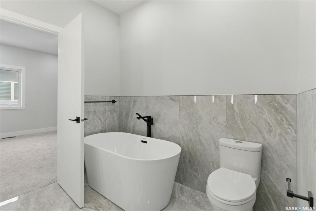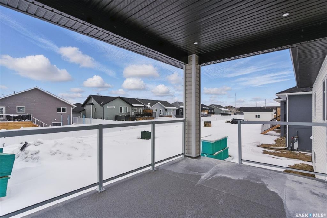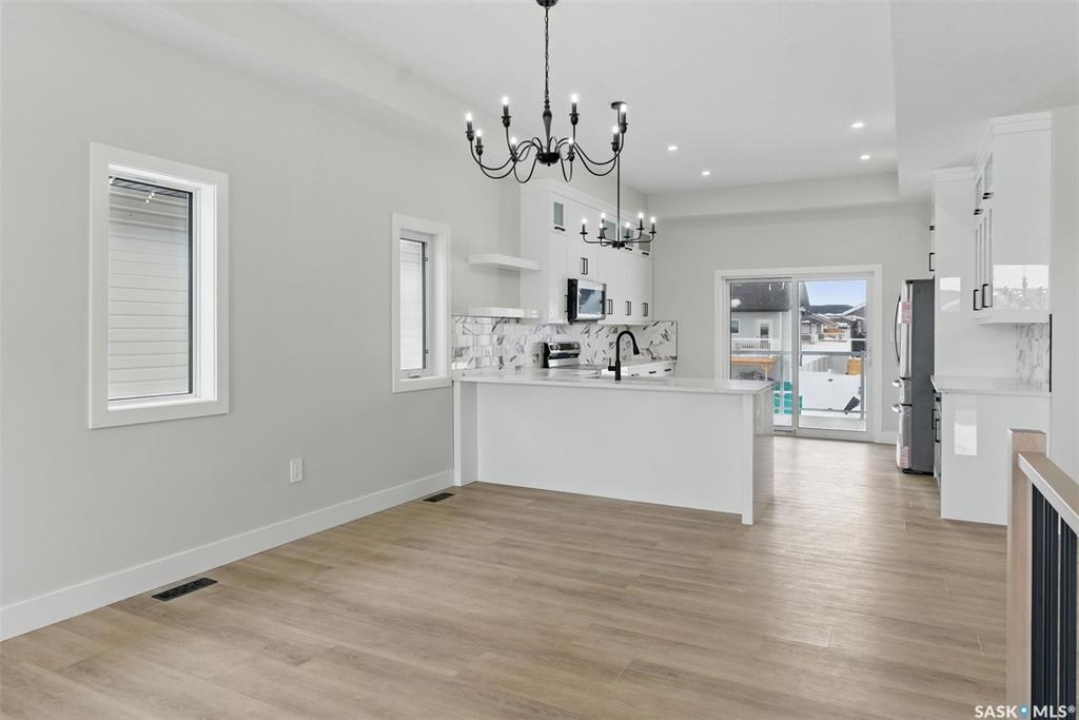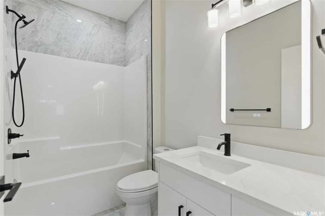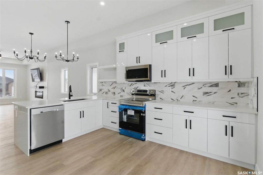 Great opportunity to live in a brand new home in Warman close to the Legends Golf Course, Sports Centre, grocery stores and all other amenities. 1,530 sqft bi-level. Spacious/open concept with extra high 9' ceilings up and 9' down giving it a light/bright/ modern feel. Main level is perfect for entertaining guests. Kitchen has pantry, tile backsplash, quartz countertops and ample cupboard storage. You'll love the luxurious en-suite bathroom off the primary bedroom with double sink, soaker tub & beautiful custom tile shower. Lots of high-end finishings throughout with upgraded vinyl flooring, unique fixtures, and tile work. Other notable features include a gorgeous electric fireplace in the living room & a covered deck (vinyl deck/ no stairs). Also has an insulated triple attached garage and a triple concrete driveway. South facing front with lovely street appeal. Established local builder, Blanket New Home Warranty, call today!
