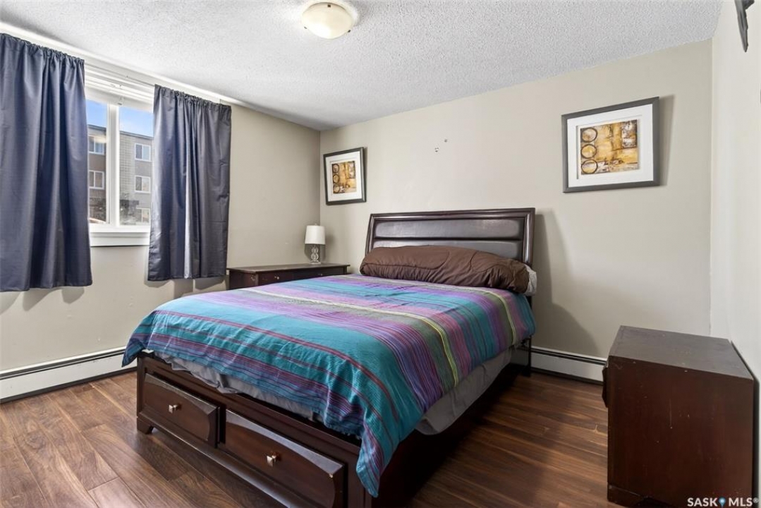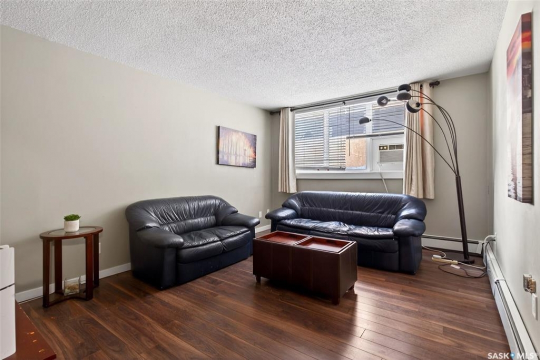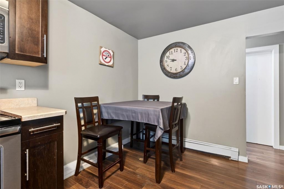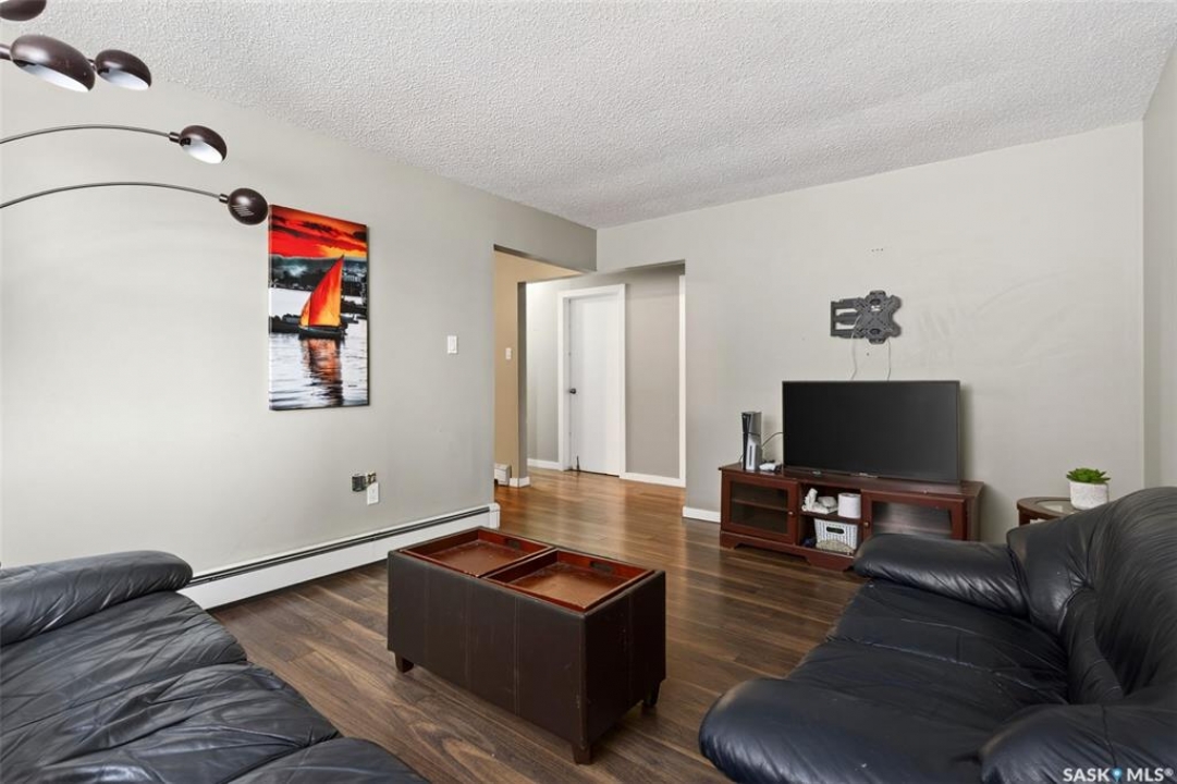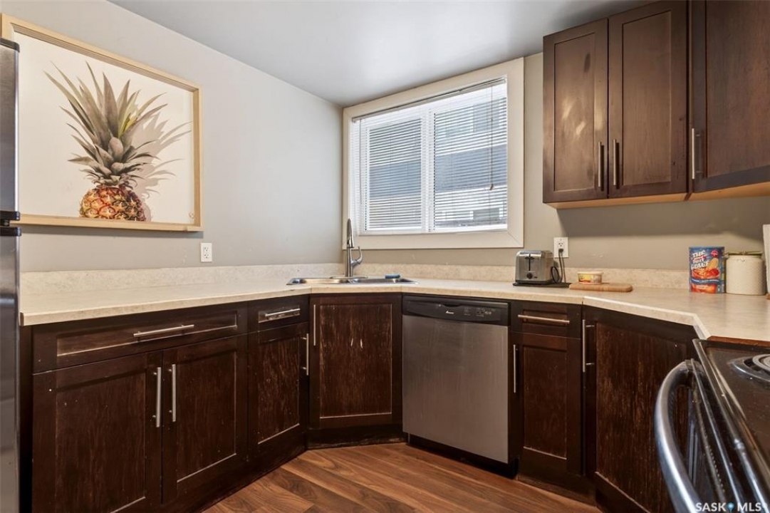 Welcome to this well-maintained 2 bedroom, 1 bathroom condo located in the desirable Glen Elm Park neighbourhood, offering quick access to east end amenities and just a short drive to downtown Regina. This unit features laminate flooring throughout and a functional, well-designed layout. The kitchen is equipped with stainless steel appliances and includes a comfortable eat-in dining area, perfect for everyday meals or casual entertaining. The spacious living room offers ample room for your dream sectional sofa, making it an ideal space to relax and unwind. Both bedrooms are generously sized, with one easily accommodating a king-size bed. The 4-piece bathroom features cabinetry that complements the kitchen, creating a cohesive and polished look. A convenient in-unit storage room is plumbed for a future combo washer and dryer, offering excellent potential for added in-suite laundry. In the meantime, the building provides shared laundry facilities. Additional highlights include your own off-street parking space and a location that balances convenience and accessibility. Whether you're a first-time home buyer looking to step into ownership or an investor seeking a solid rental opportunity, this condo checks all the boxes.