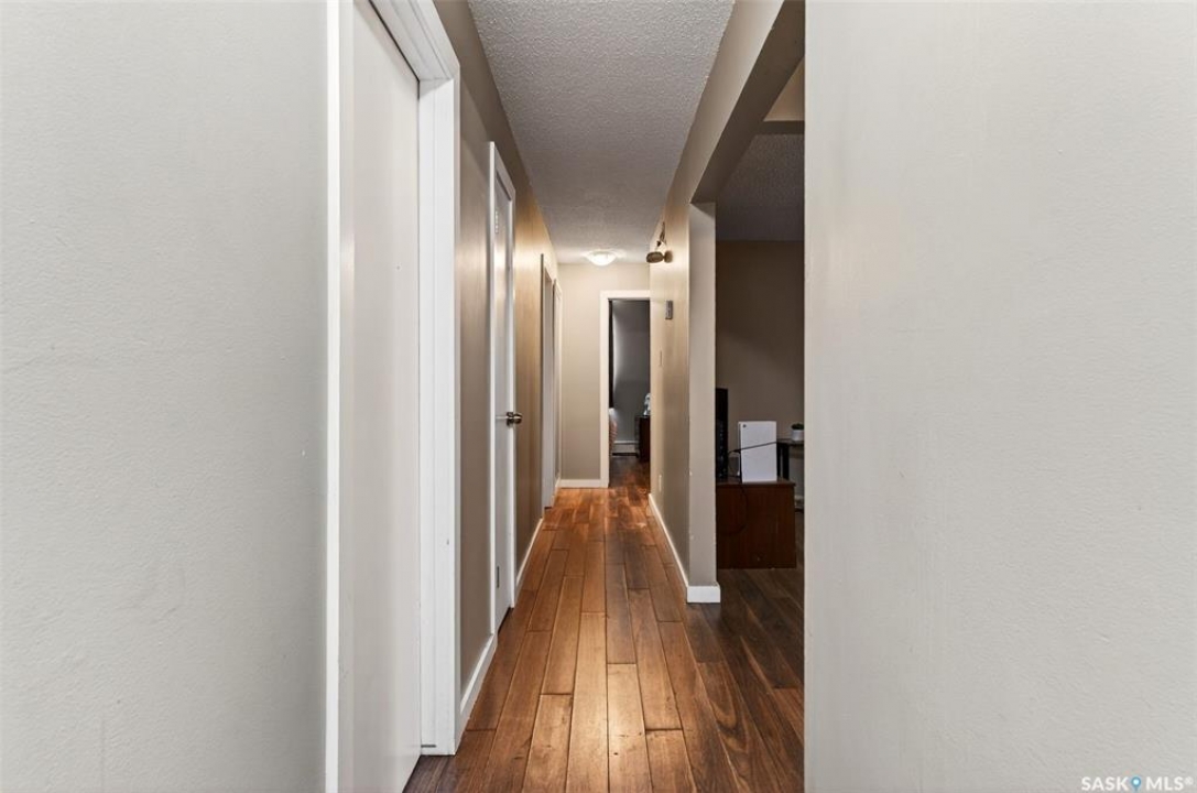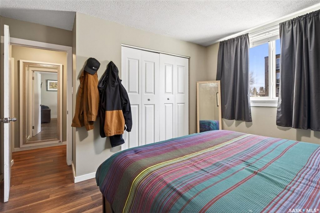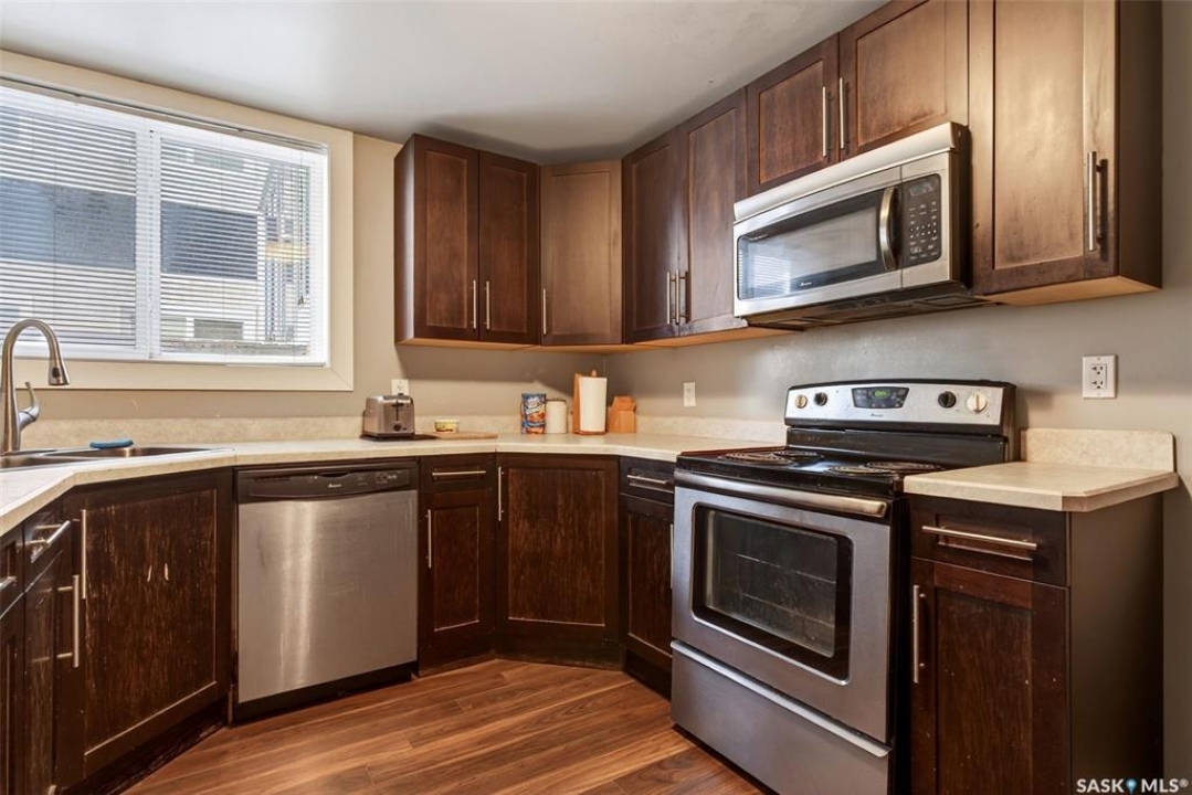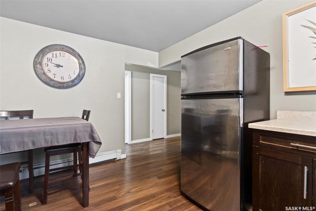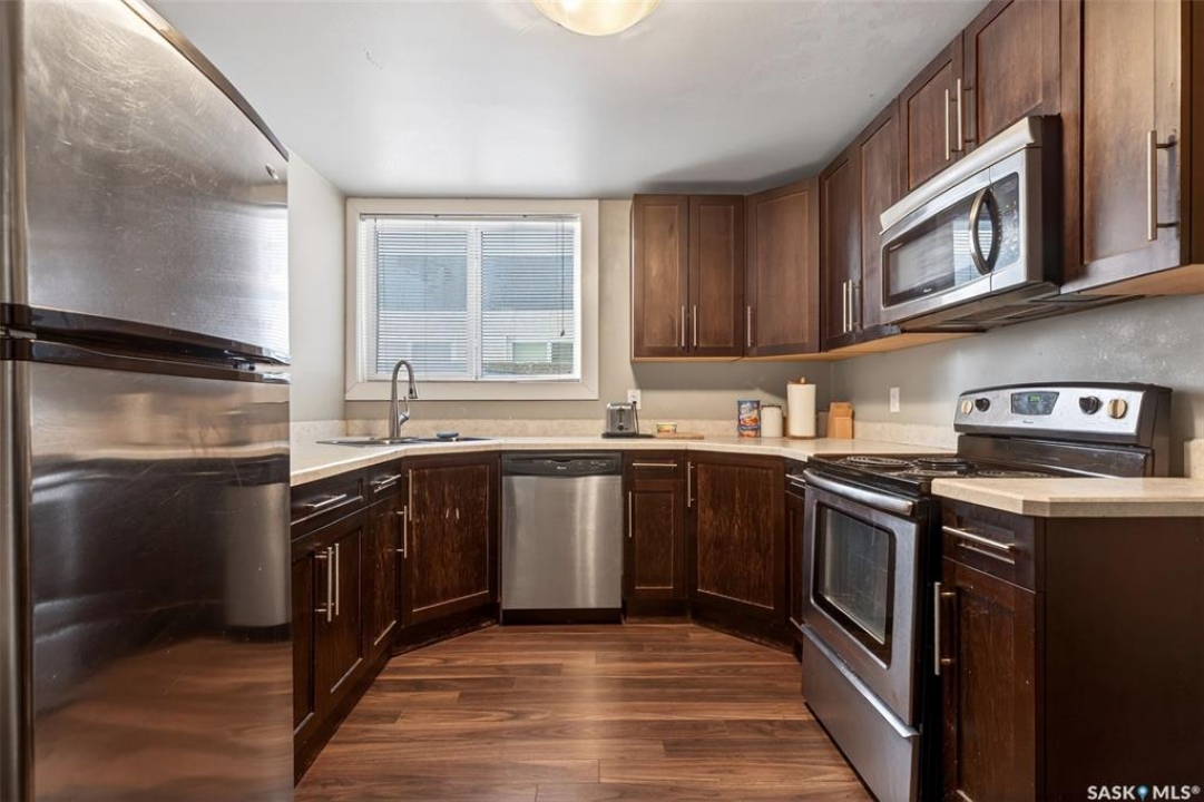 Welcome to this well-maintained 2 bedroom, 1 bathroom condo located in the desirable Glen Elm Park neighbourhood, offering quick access to east end amenities and just a short drive to downtown Regina. This unit features laminate flooring throughout and a functional, well-designed layout. The kitchen is equipped with stainless steel appliances and includes a comfortable eat-in dining area, perfect for everyday meals or casual entertaining. The spacious living room offers ample room for your dream sectional sofa, making it an ideal space to relax and unwind. Both bedrooms are generously sized, with one easily accommodating a king-size bed. The 4-piece bathroom features cabinetry that complements the kitchen, creating a cohesive and polished look. A convenient in-unit storage room is plumbed for a future combo washer and dryer, offering excellent potential for added in-suite laundry. In the meantime, the building provides shared laundry facilities. Additional highlights include your own off-street parking space and a location that balances convenience and accessibility. Whether you're a first-time home buyer looking to step into ownership or an investor seeking a solid rental opportunity, this condo checks all the boxes.