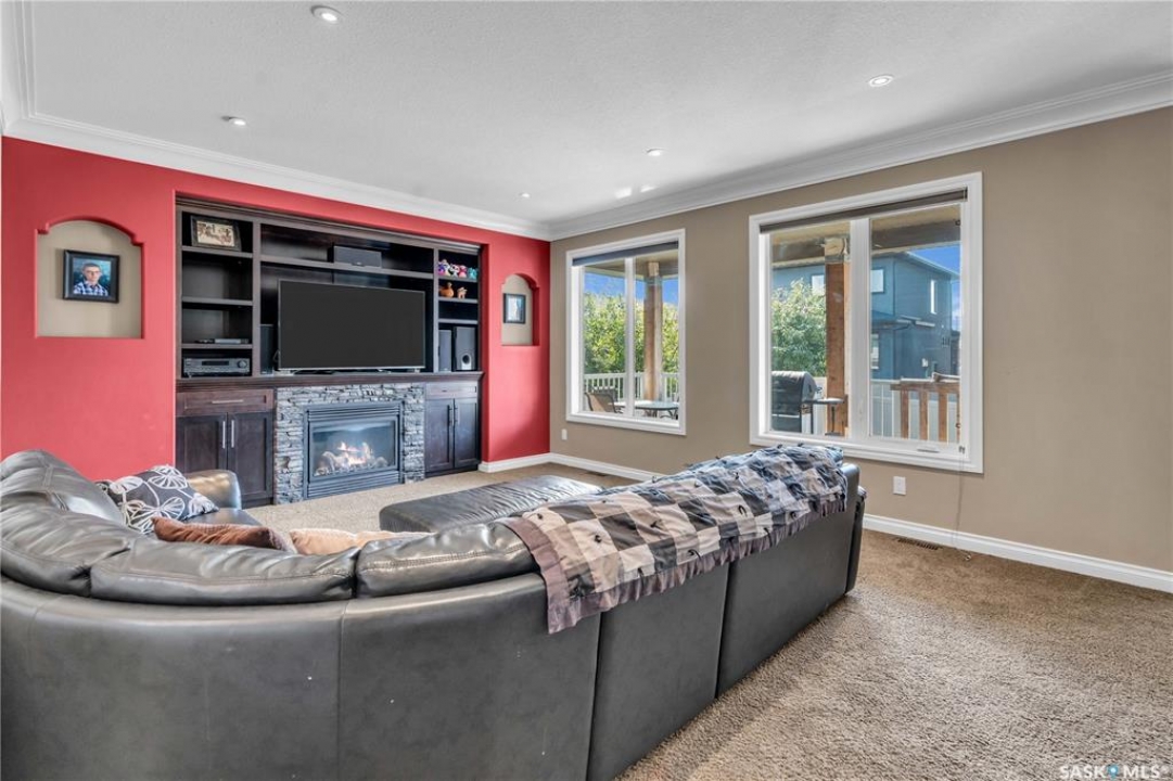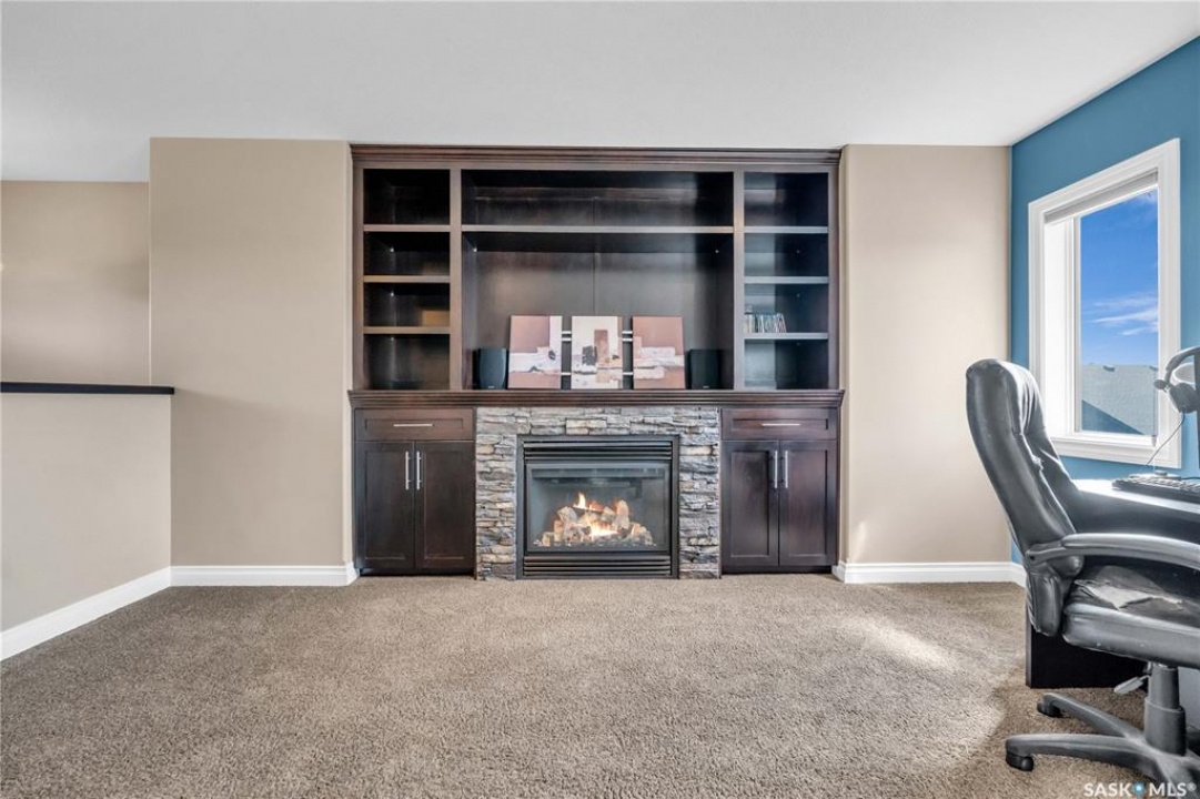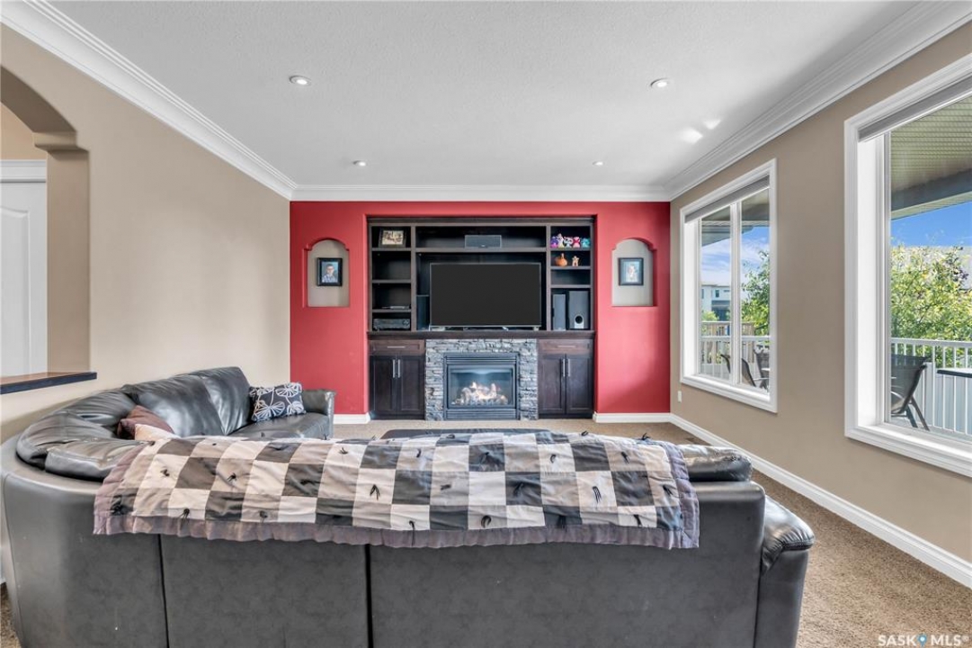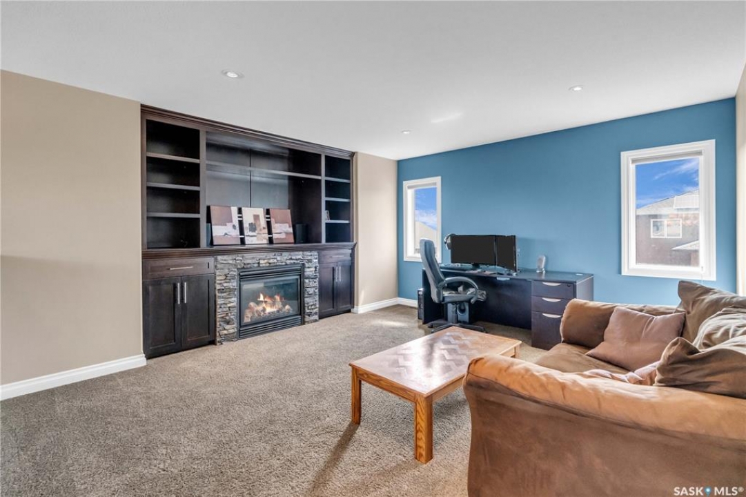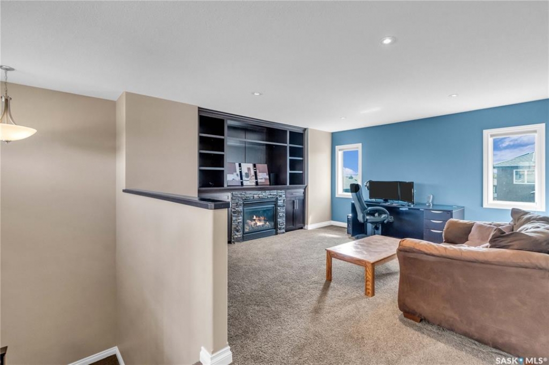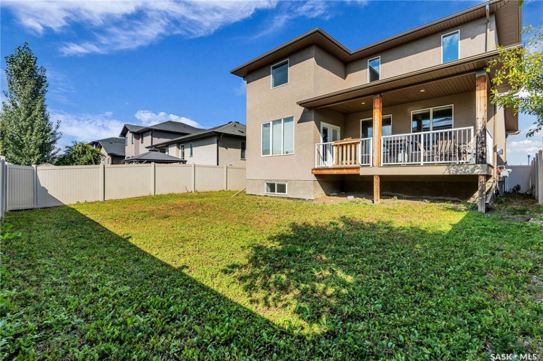 This beautiful, well cared for home is in The Creeks, a neighbourhood that has it all with great access to schools, recreation, and all that Regina's east end has to offer. This home was designed with quality and comfort in mind, with modern conveniences throughout. Soaring ceilings in the entryway lead to an office, a 2-piece bath, and a spacious mudroom with a convenient pocket door. The living room features a built-in home entertainment center with a gas fireplace, with an arched pass-through to the entryway. You'll love the modern eat-in kitchen that boasts hardwood flooring, warm wood cabinets and soft close drawers, granite countertops, stainless steel appliances, a large center sit-up island with undermount sink and dishwasher, a gas range, built-in oven, and a walk-in pantry. French doors in the dining area open to a covered deck with lots of space to enjoy your downtime in the summer. Upstairs, an open staircase overlooks the front entrance and leads to a bonus room with a built-in bookshelves and gas fireplace, a perfect place to escape with your book. The spacious primary bedroom offers a walk-in closet, and a 4-piece ensuite that features a tiled soaker tub, walk-in/sit-down shower, and double sinks. Two more good sized bedrooms, a 4-piece bath and laundry nook with storage complete the upper level. You'll enjoy the cozy recreation room downstairs with carpeted flooring and a walk-up wet bar. Two big bedrooms, a 4-piece bathroom, storage room, and a large utility room complete the lower level. This home has gorgeous curb appeal with stucco and stone, a double attached, heated and insulated garage, and exterior undermount lighting. Value added features of this home include all appliances, window coverings, central vac with attachments, central A/C, hi-eff furnace, sump pump, and an underground sprinkler system. This home is beautiful, in a fantastic location and just waiting for you to call it home, call your agent to schedule a showing today.