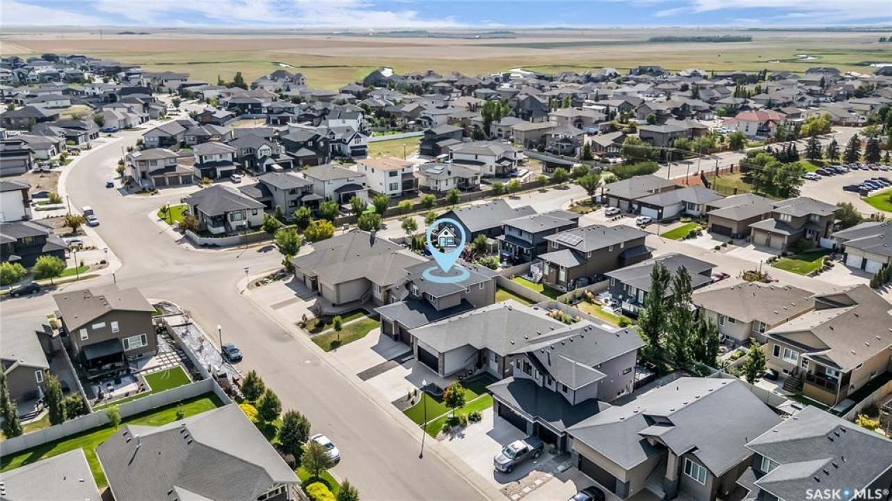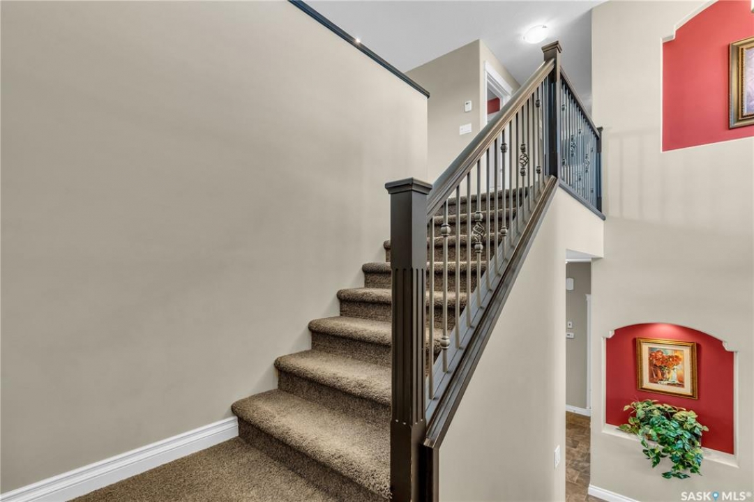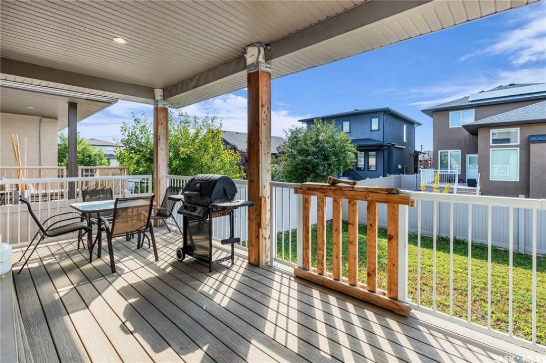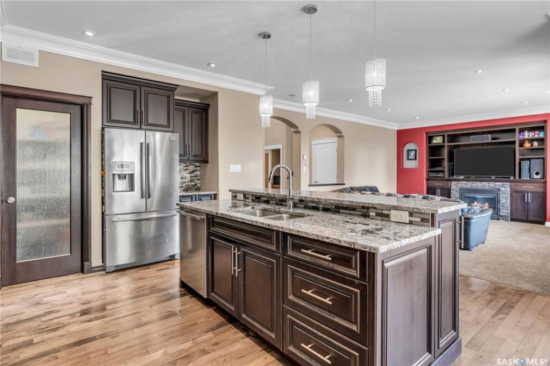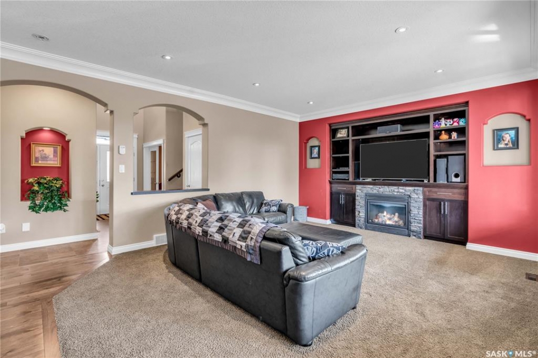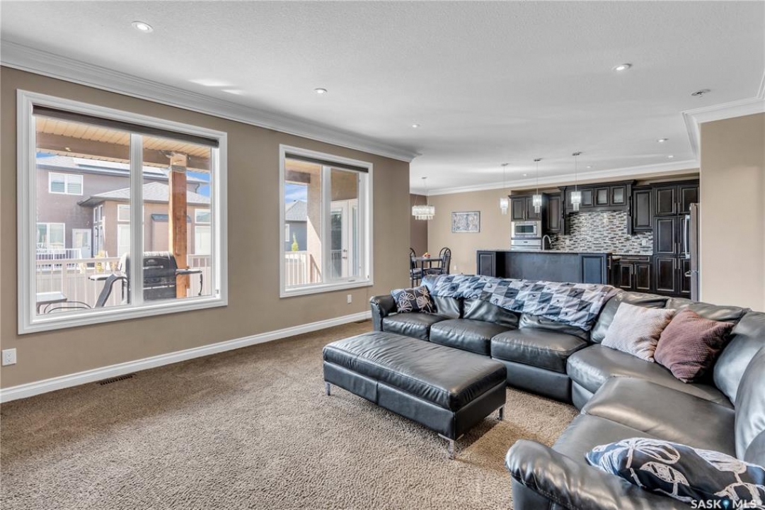 This beautiful, well cared for home is in The Creeks, a neighbourhood that has it all with great access to schools, recreation, and all that Regina's east end has to offer. This home was designed with quality and comfort in mind, with modern conveniences throughout. Soaring ceilings in the entryway lead to an office, a 2-piece bath, and a spacious mudroom with a convenient pocket door. The living room features a built-in home entertainment center with a gas fireplace, with an arched pass-through to the entryway. You'll love the modern eat-in kitchen that boasts hardwood flooring, warm wood cabinets and soft close drawers, granite countertops, stainless steel appliances, a large center sit-up island with undermount sink and dishwasher, a gas range, built-in oven, and a walk-in pantry. French doors in the dining area open to a covered deck with lots of space to enjoy your downtime in the summer. Upstairs, an open staircase overlooks the front entrance and leads to a bonus room with a built-in bookshelves and gas fireplace, a perfect place to escape with your book. The spacious primary bedroom offers a walk-in closet, and a 4-piece ensuite that features a tiled soaker tub, walk-in/sit-down shower, and double sinks. Two more good sized bedrooms, a 4-piece bath and laundry nook with storage complete the upper level. You'll enjoy the cozy recreation room downstairs with carpeted flooring and a walk-up wet bar. Two big bedrooms, a 4-piece bathroom, storage room, and a large utility room complete the lower level. This home has gorgeous curb appeal with stucco and stone, a double attached, heated and insulated garage, and exterior undermount lighting. Value added features of this home include all appliances, window coverings, central vac with attachments, central A/C, hi-eff furnace, sump pump, and an underground sprinkler system. This home is beautiful, in a fantastic location and just waiting for you to call it home, call your agent to schedule a showing today.