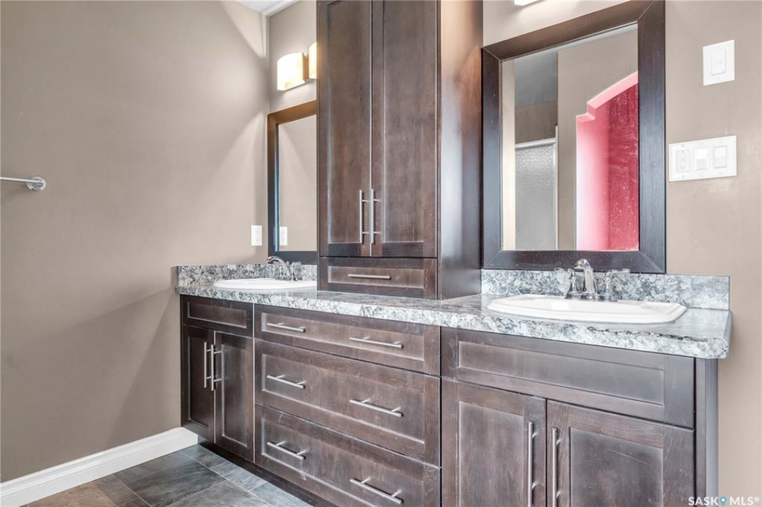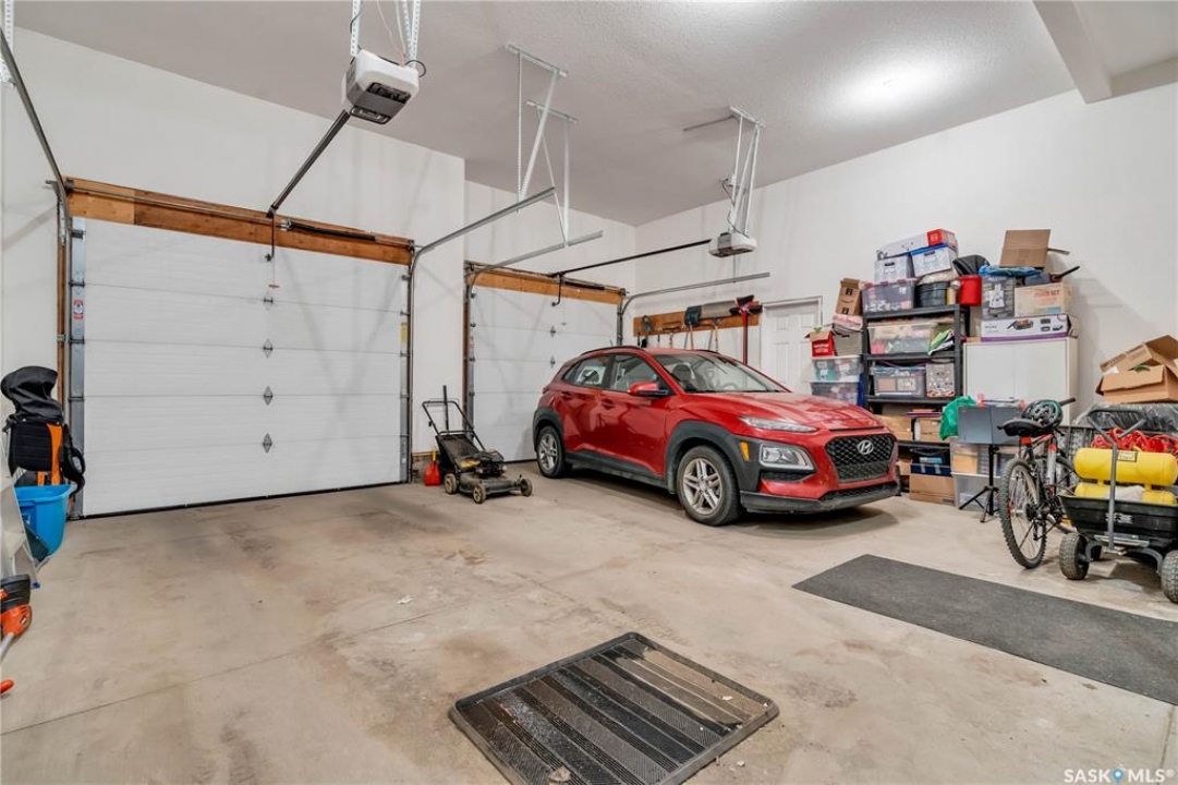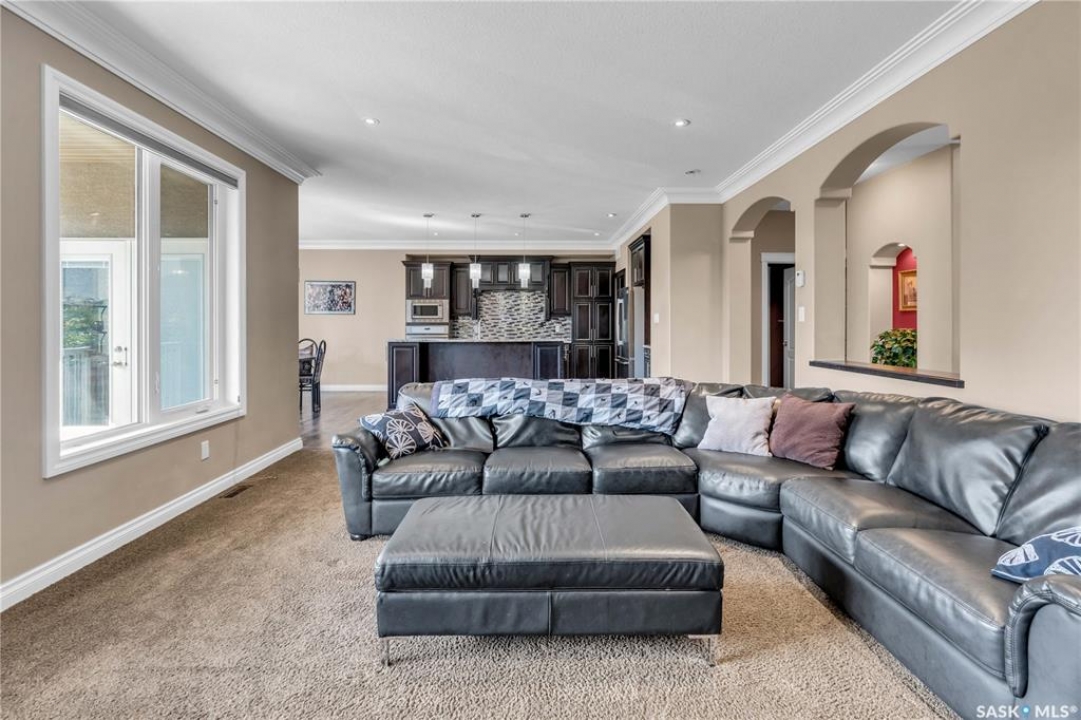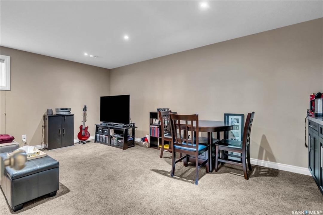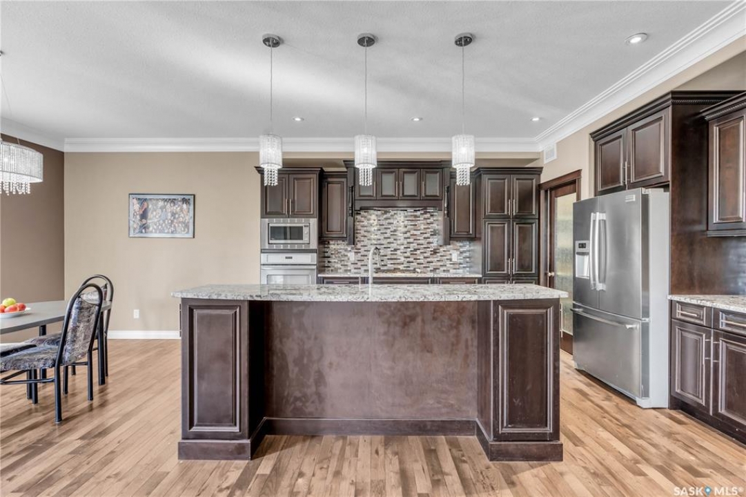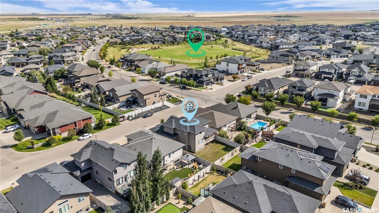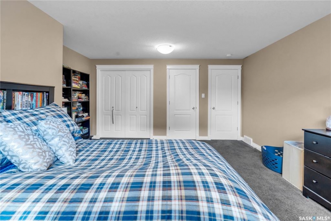 This beautiful, well cared for home is in The Creeks, a neighbourhood that has it all with great access to schools, recreation, and all that Regina's east end has to offer. This home was designed with quality and comfort in mind, with modern conveniences throughout. Soaring ceilings in the entryway lead to an office, a 2-piece bath, and a spacious mudroom with a convenient pocket door. The living room features a built-in home entertainment center with a gas fireplace, with an arched pass-through to the entryway. You'll love the modern eat-in kitchen that boasts hardwood flooring, warm wood cabinets and soft close drawers, granite countertops, stainless steel appliances, a large center sit-up island with undermount sink and dishwasher, a gas range, built-in oven, and a walk-in pantry. French doors in the dining area open to a covered deck with lots of space to enjoy your downtime in the summer. Upstairs, an open staircase overlooks the front entrance and leads to a bonus room with a built-in bookshelves and gas fireplace, a perfect place to escape with your book. The spacious primary bedroom offers a walk-in closet, and a 4-piece ensuite that features a tiled soaker tub, walk-in/sit-down shower, and double sinks. Two more good sized bedrooms, a 4-piece bath and laundry nook with storage complete the upper level. You'll enjoy the cozy recreation room downstairs with carpeted flooring and a walk-up wet bar. Two big bedrooms, a 4-piece bathroom, storage room, and a large utility room complete the lower level. This home has gorgeous curb appeal with stucco and stone, a double attached, heated and insulated garage, and exterior undermount lighting. Value added features of this home include all appliances, window coverings, central vac with attachments, central A/C, hi-eff furnace, sump pump, and an underground sprinkler system. This home is beautiful, in a fantastic location and just waiting for you to call it home, call your agent to schedule a showing today.