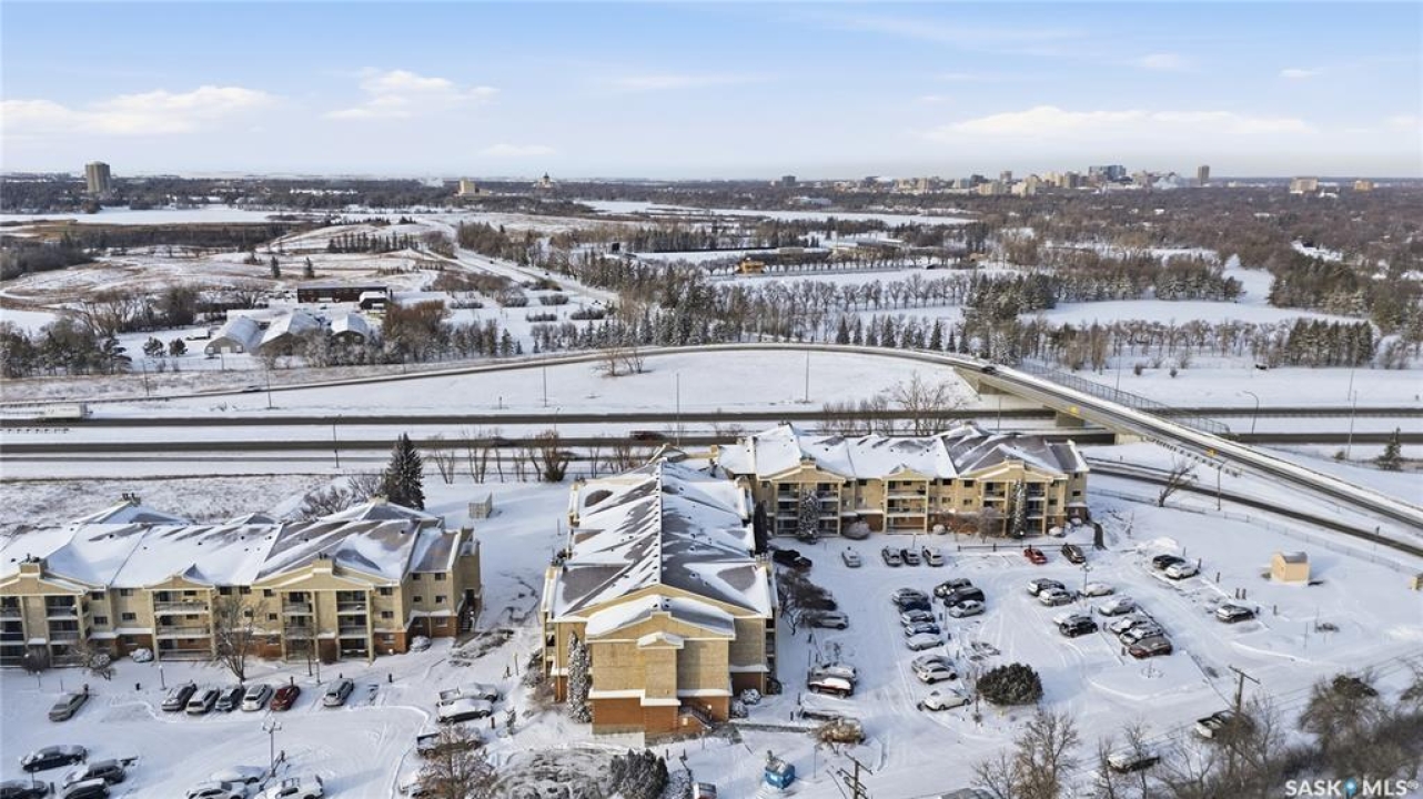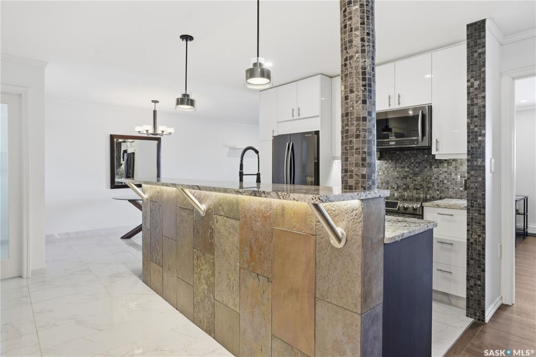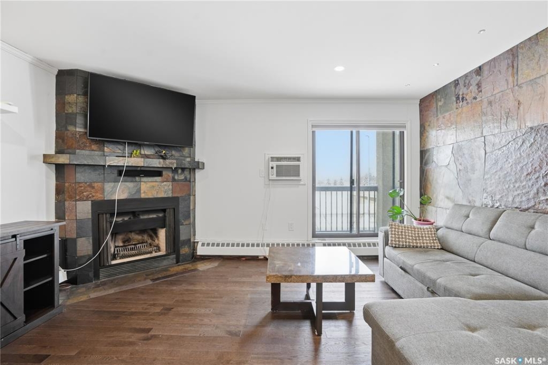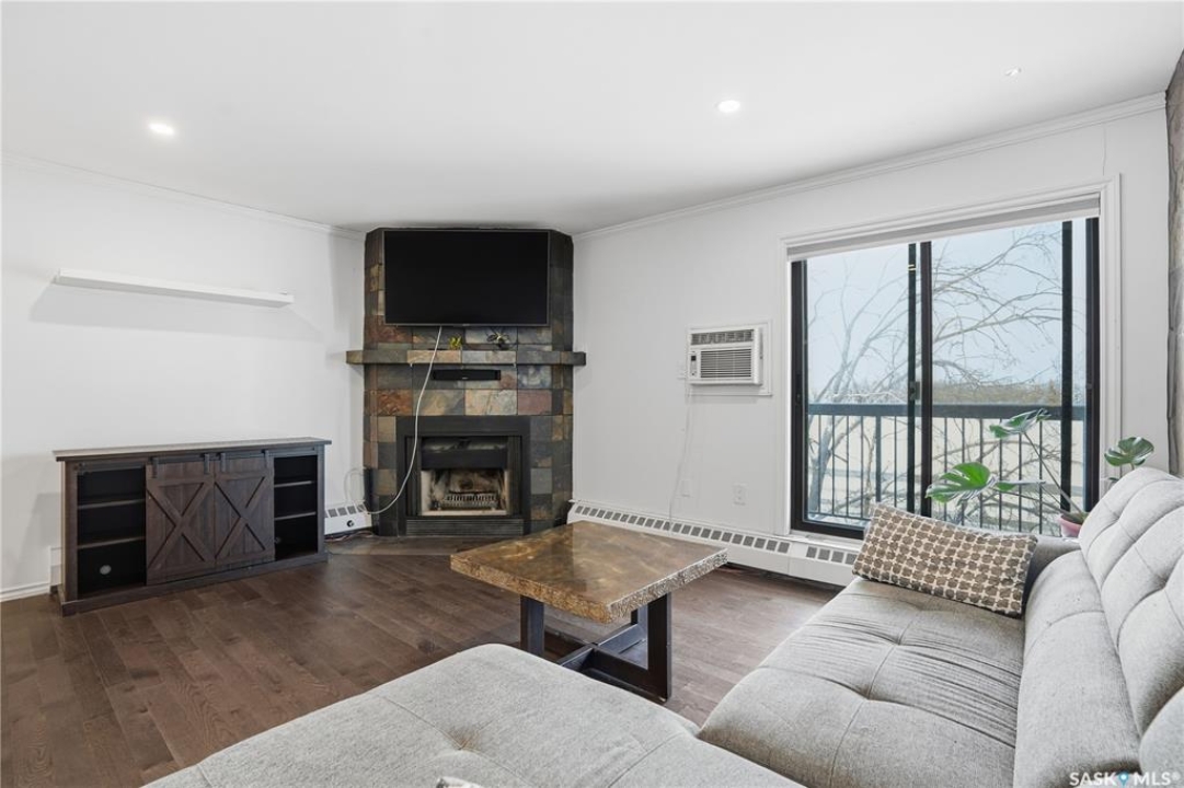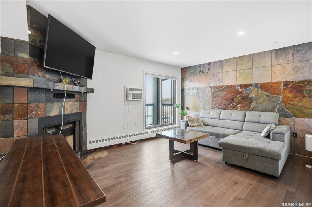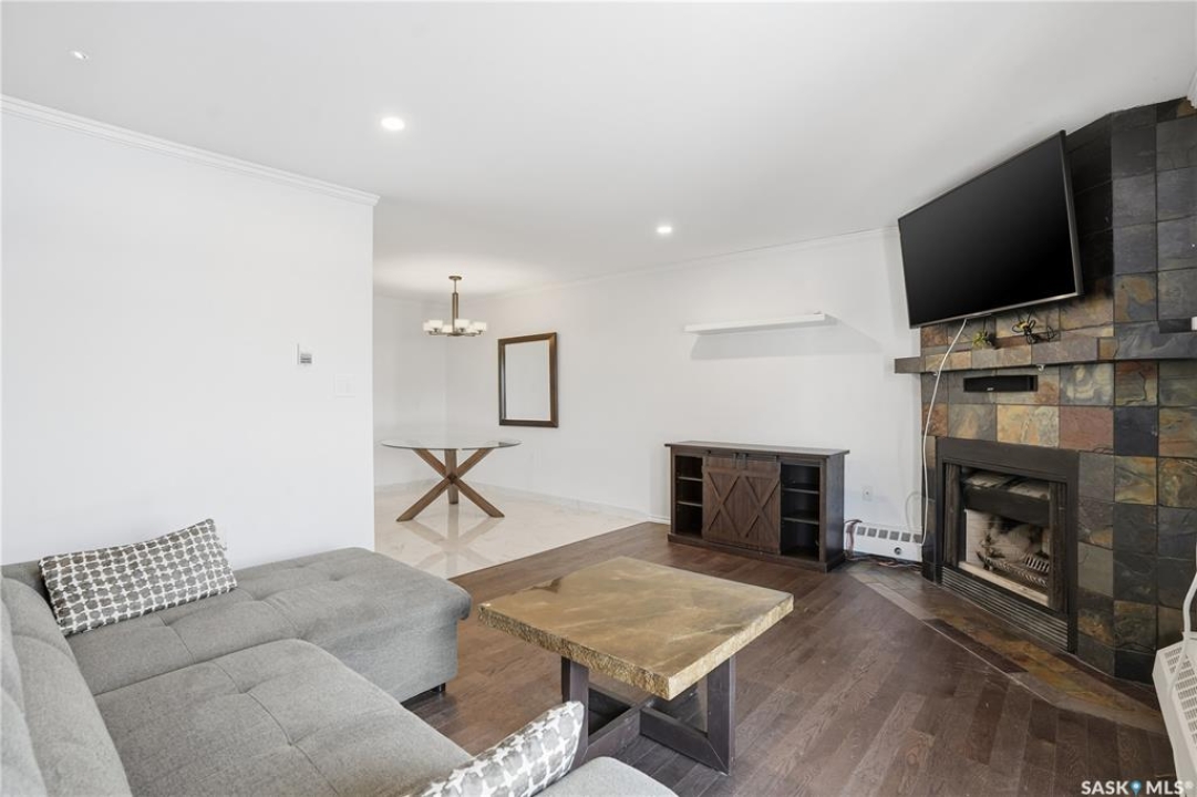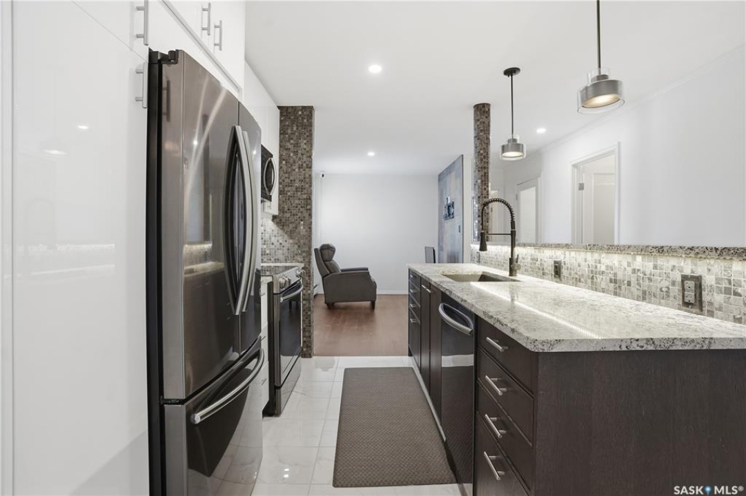 Welcome to a truly rare opportunity in The Gardens. This stunning, completely renovated top-floor corner unit offers 1,066 sqft of sophisticated living space, unlike anything else on the market at this price point. Step inside to find gleaming white ceramic tile flowing through the entry, laundry, and dining areas. The heart of the home is the showpiece kitchen, fully remodeled with high-gloss white cabinetry, granite countertops, a sprawling eat-up island, and sleek black stainless steel appliances. Enhanced by custom Lutron lighting, this space opens to a spacious dining area perfect for hosting, and a cozy den tucked just off the kitchen. The living room is designed for relaxation, featuring rich hardwood floors, a corner wood-burning fireplace framed by custom stone tiling, and patio doors leading to a covered deck with serene views of Wascana Lake. The unit offers two generous bedrooms, including a master suite with a custom closet organizer and a convenient 2-piece ensuite. Both bathrooms have been meticulously updated, with the main 4-piece bath showcasing a custom shower and impressive tile work. Practicality meets luxury with a massive laundry room offering freezer space, plus an additional in-suite storage closet. Located just steps from the walking paths of Wascana Park, the U of R, and Sask Polytechnic, this condo is perfectly positioned for an active lifestyle. Note: An additional parking stall may be available for rent if required.