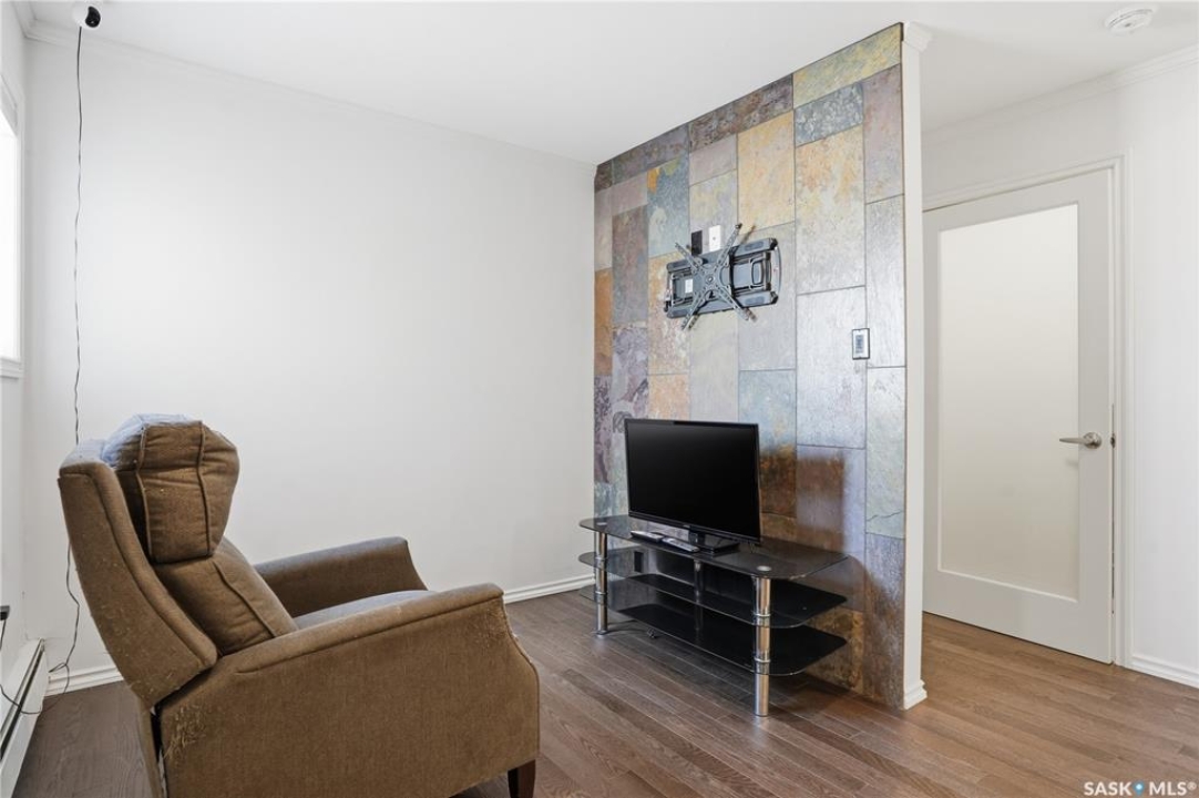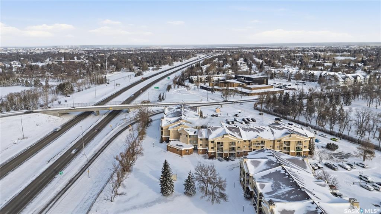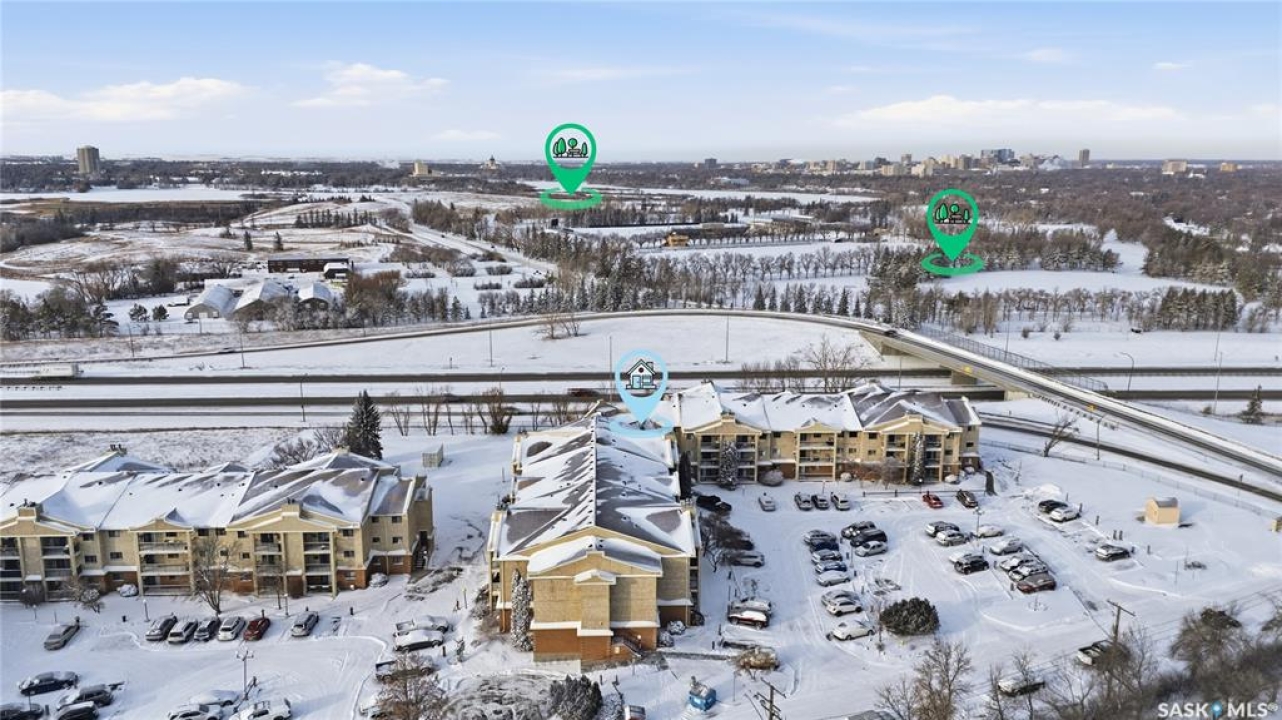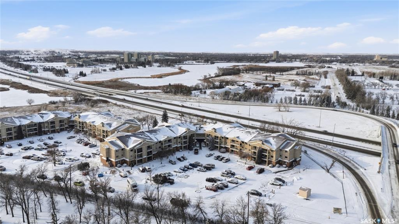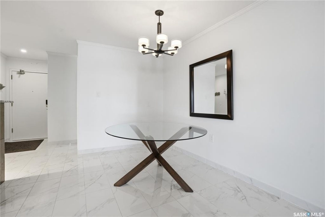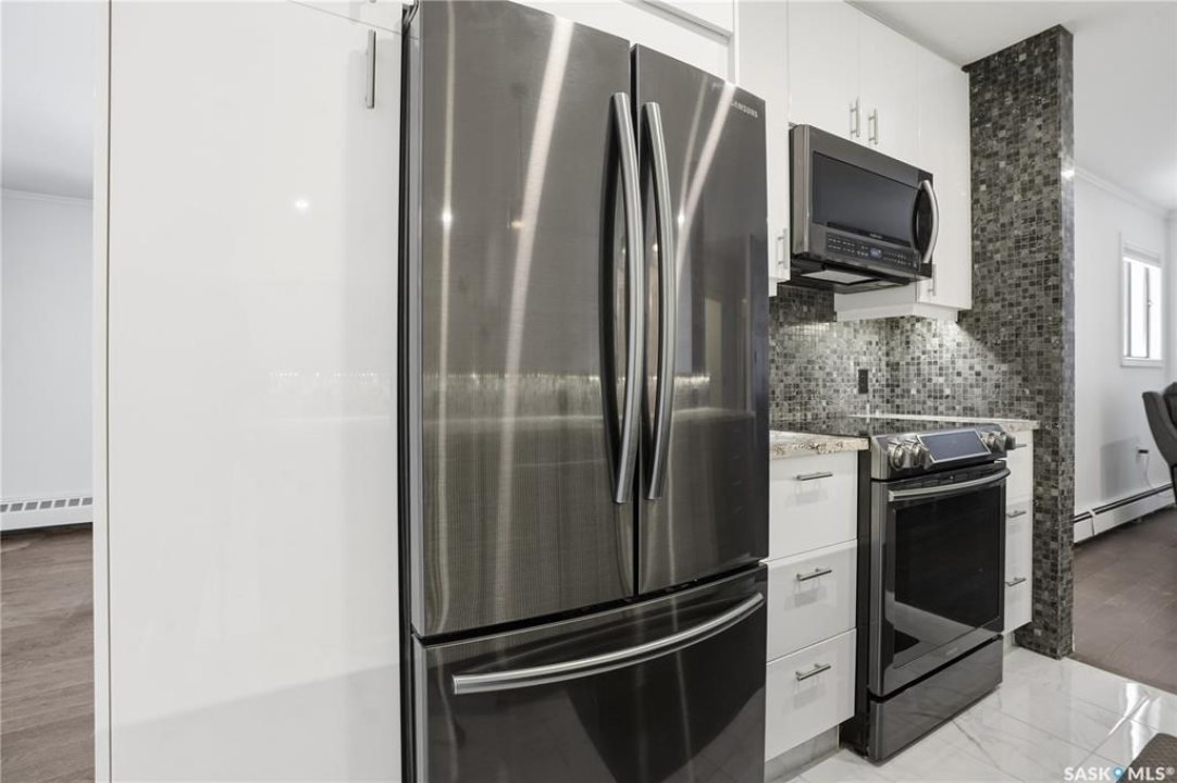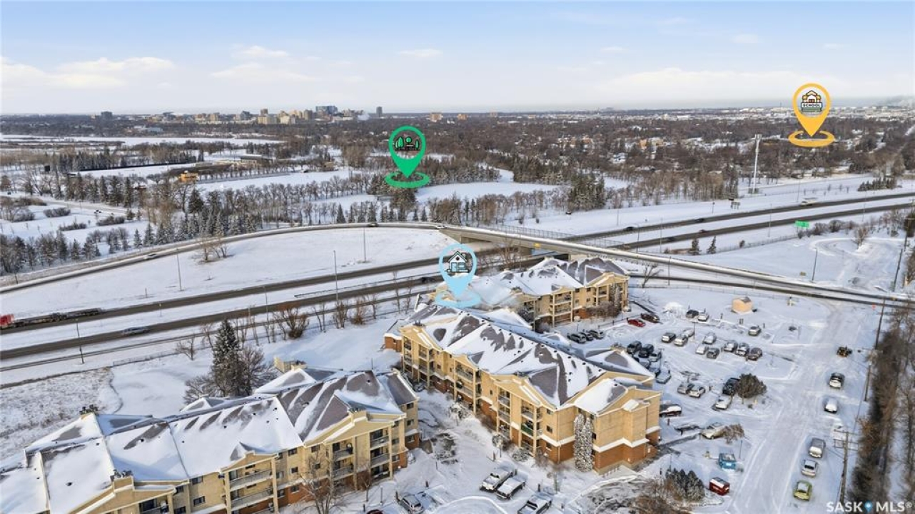 Welcome to a truly rare opportunity in The Gardens. This stunning, completely renovated top-floor corner unit offers 1,066 sqft of sophisticated living space, unlike anything else on the market at this price point. Step inside to find gleaming white ceramic tile flowing through the entry, laundry, and dining areas. The heart of the home is the showpiece kitchen, fully remodeled with high-gloss white cabinetry, granite countertops, a sprawling eat-up island, and sleek black stainless steel appliances. Enhanced by custom Lutron lighting, this space opens to a spacious dining area perfect for hosting, and a cozy den tucked just off the kitchen. The living room is designed for relaxation, featuring rich hardwood floors, a corner wood-burning fireplace framed by custom stone tiling, and patio doors leading to a covered deck with serene views of Wascana Lake. The unit offers two generous bedrooms, including a master suite with a custom closet organizer and a convenient 2-piece ensuite. Both bathrooms have been meticulously updated, with the main 4-piece bath showcasing a custom shower and impressive tile work. Practicality meets luxury with a massive laundry room offering freezer space, plus an additional in-suite storage closet. Located just steps from the walking paths of Wascana Park, the U of R, and Sask Polytechnic, this condo is perfectly positioned for an active lifestyle. Note: An additional parking stall may be available for rent if required.